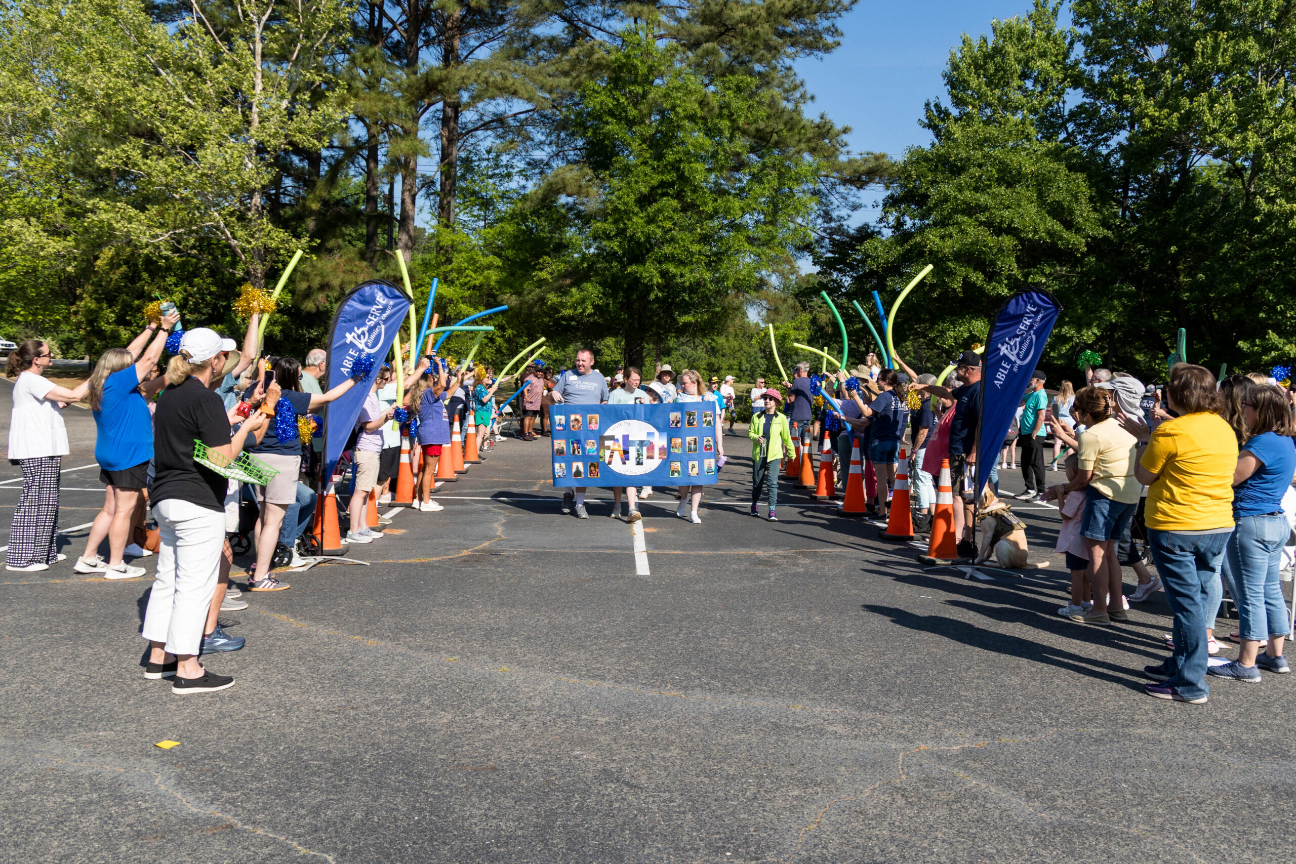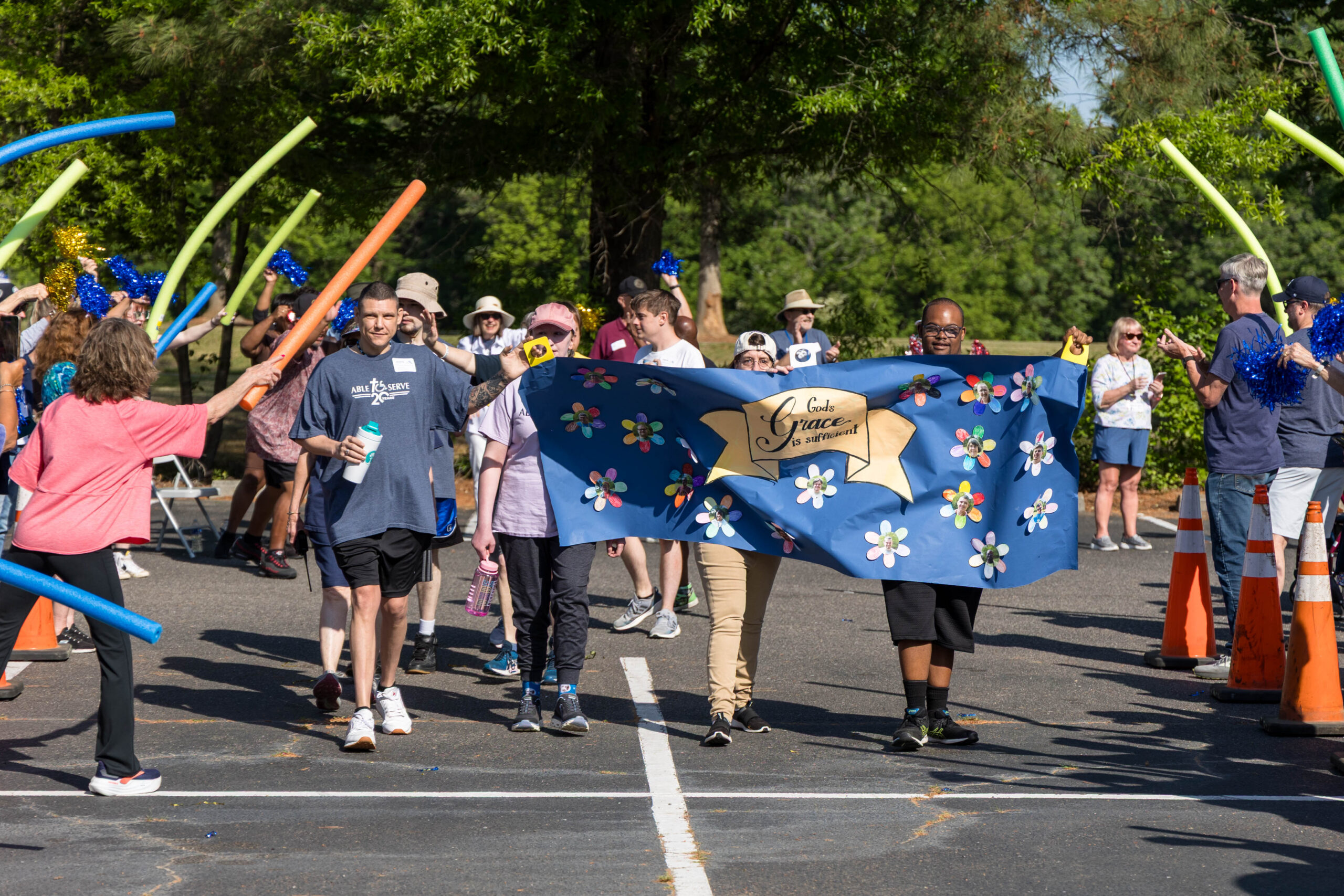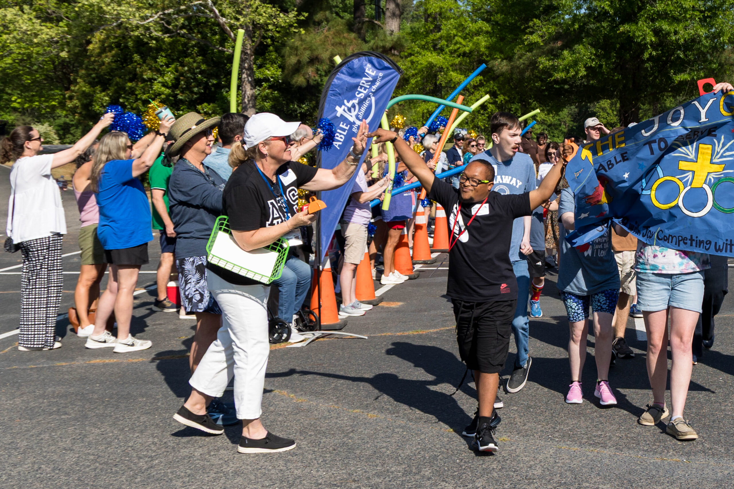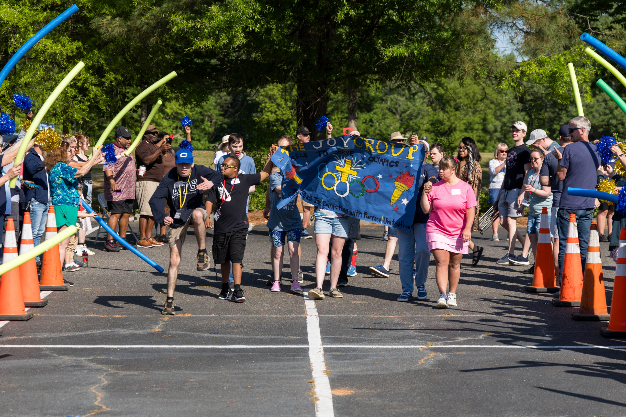 The Joy group led the parade, followed by the Faith, Grace, and Hope groups. The excited athletes marched across the parking lot, curved left, and passed through a tunnel of cheering spectators. Blue and gold tinsel pompons glistening in the sun accompanied the cheering. Fluorescent pool noodles waving in the air added to the colorful ambience.