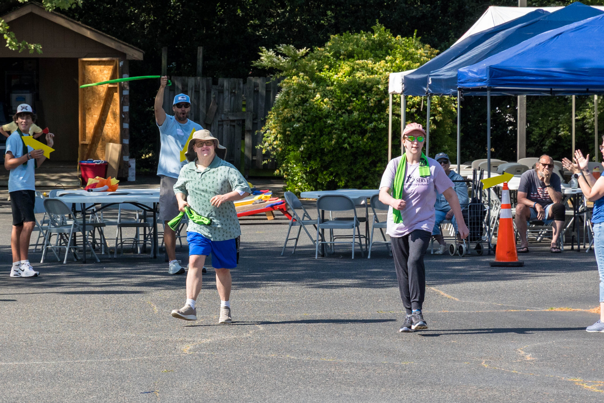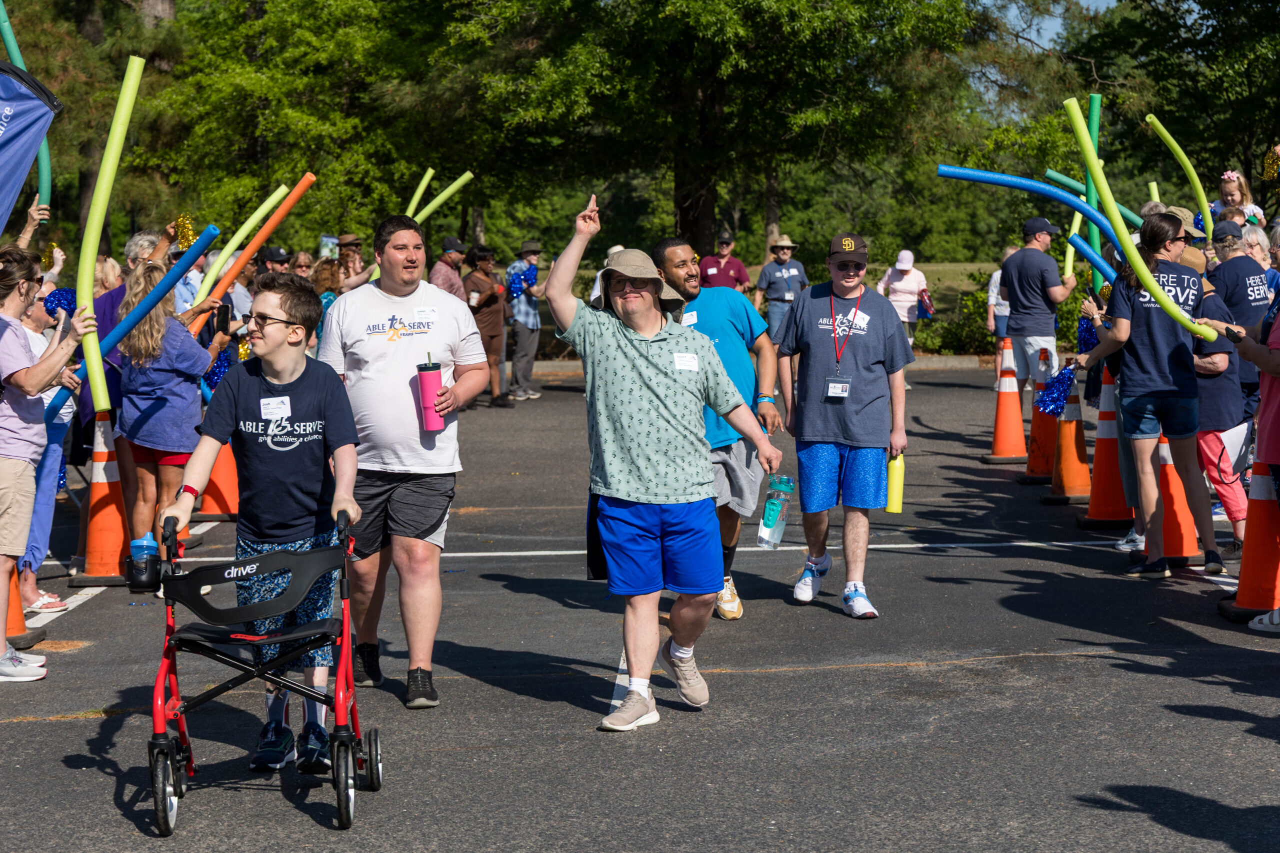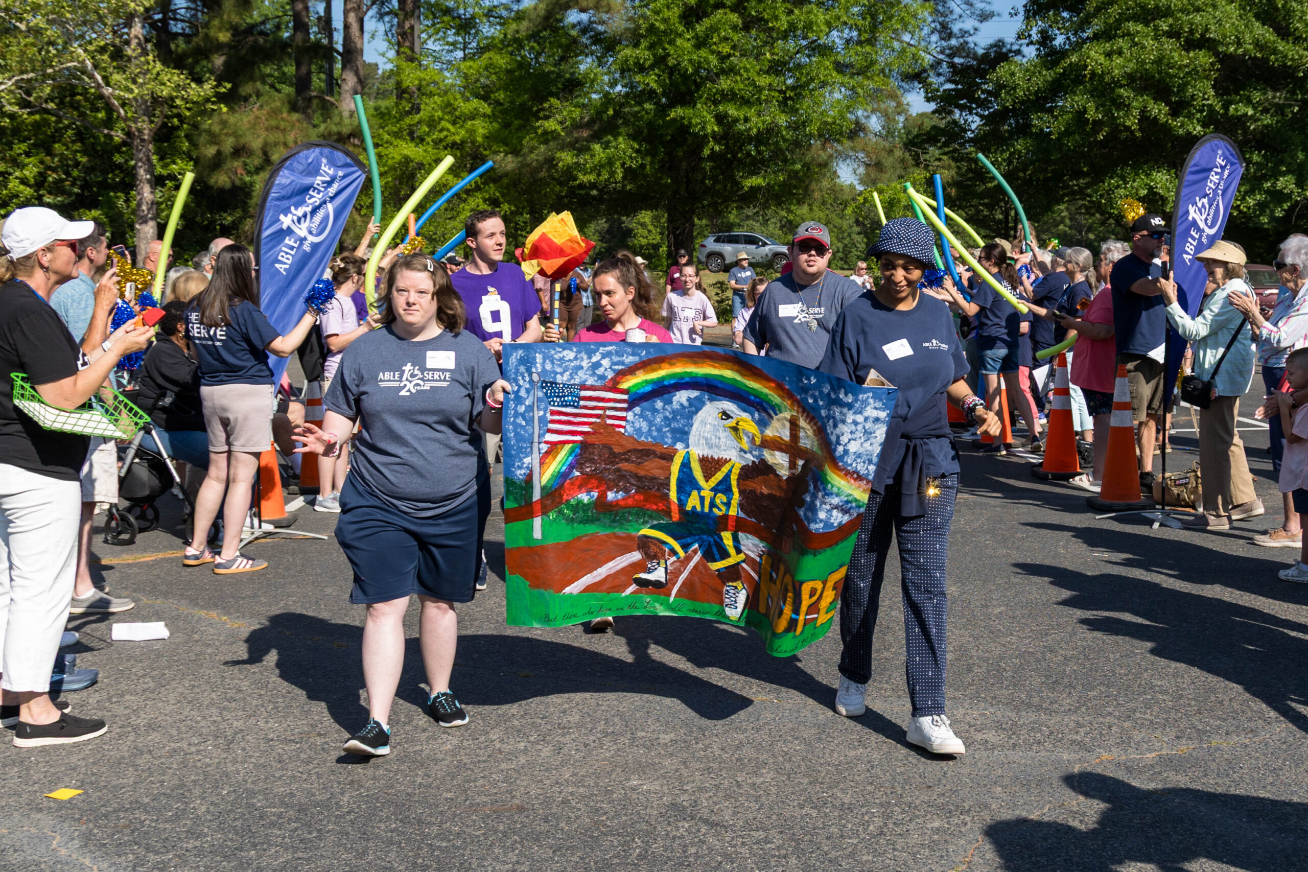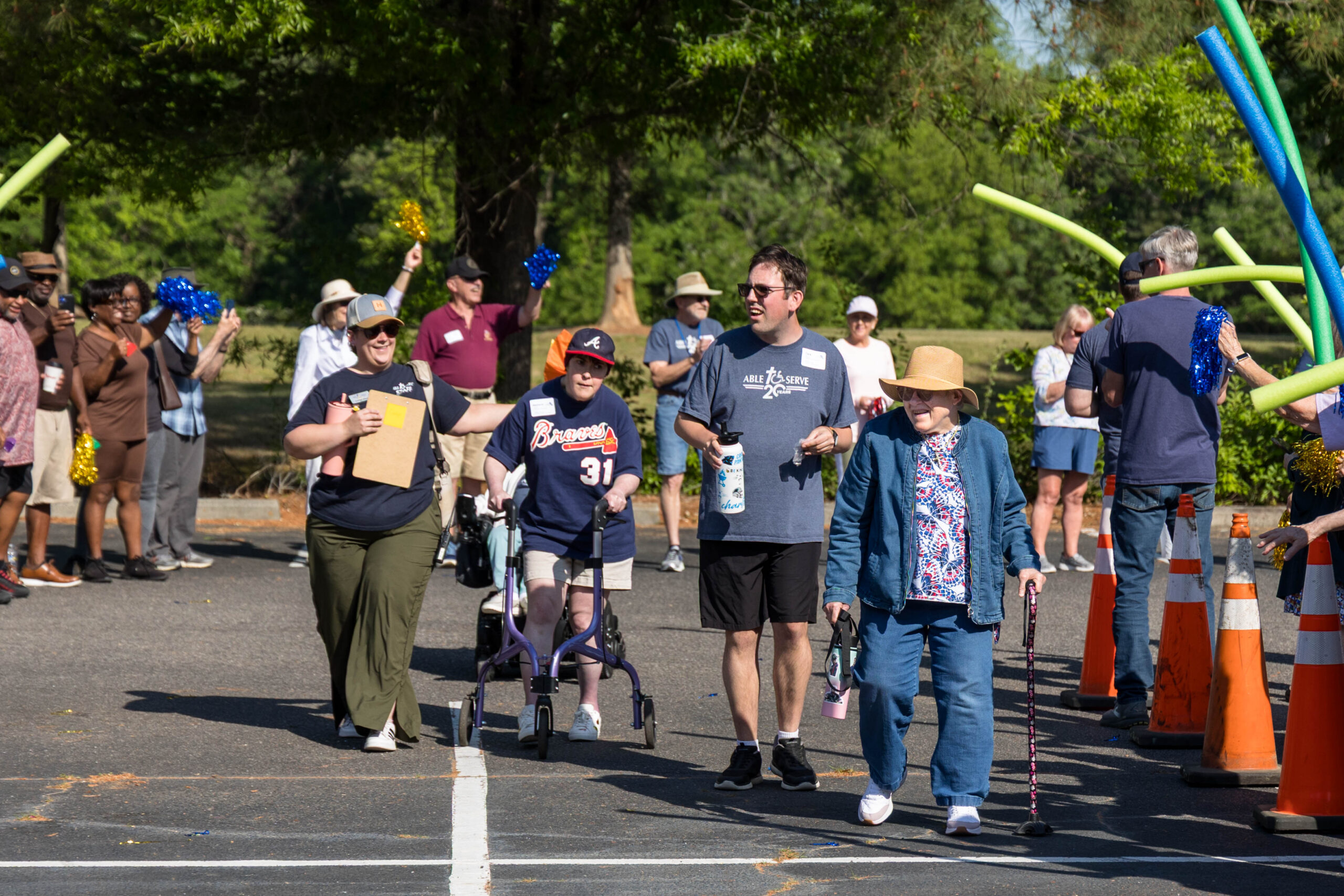 The Joy group led the parade, followed by the Faith, Grace, and Hope groups. The excited athletes marched across the parking lot, curved left, and passed through a tunnel of cheering spectators. Blue and gold tinsel pompons glistening in the sun accompanied the cheering. Fluorescent pool noodles waving in the air added to the colorful ambience.