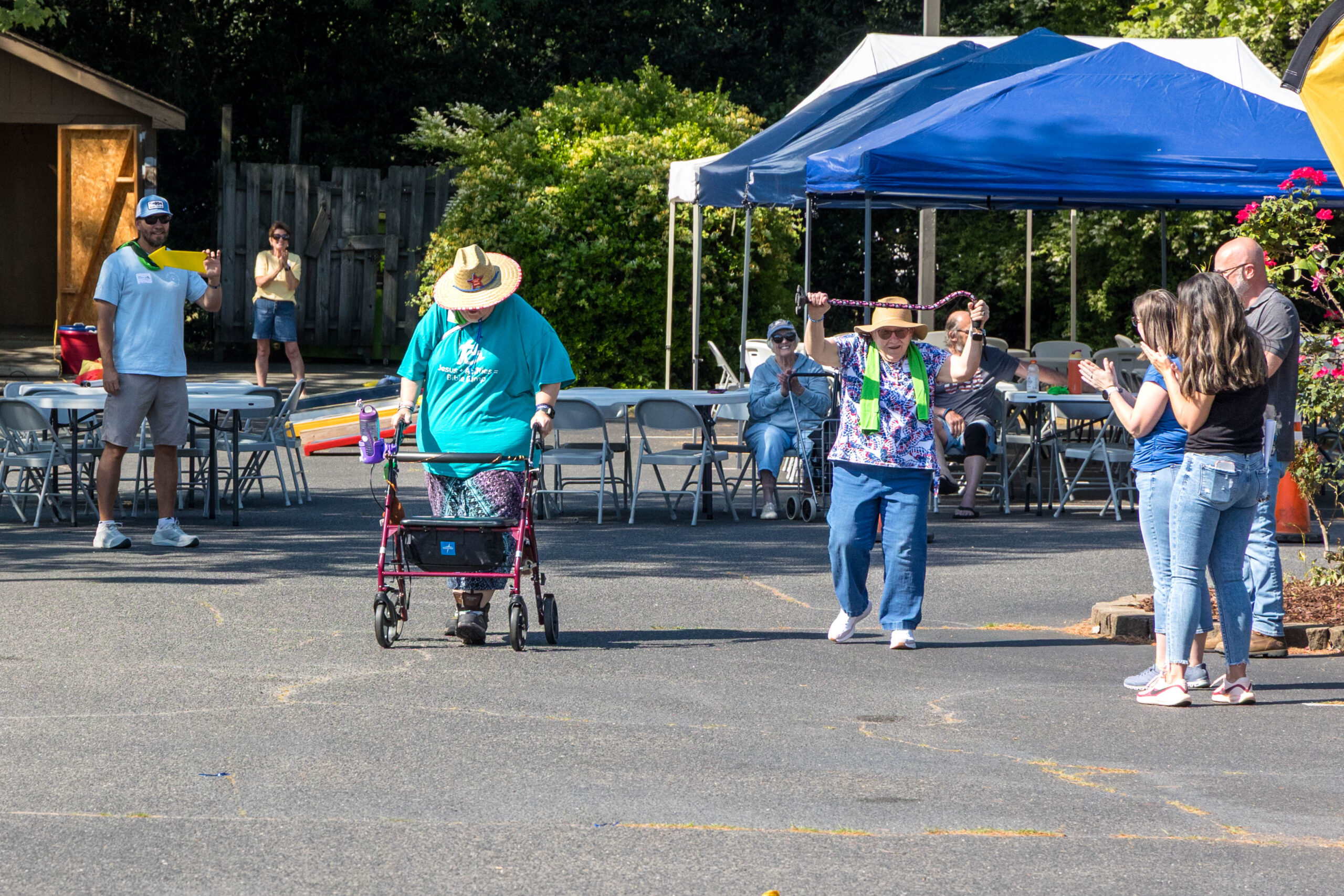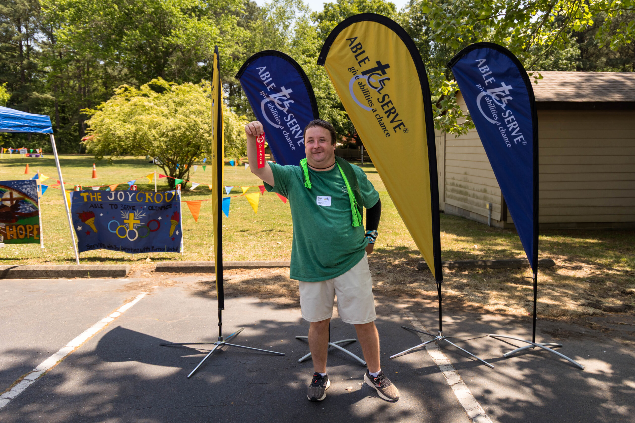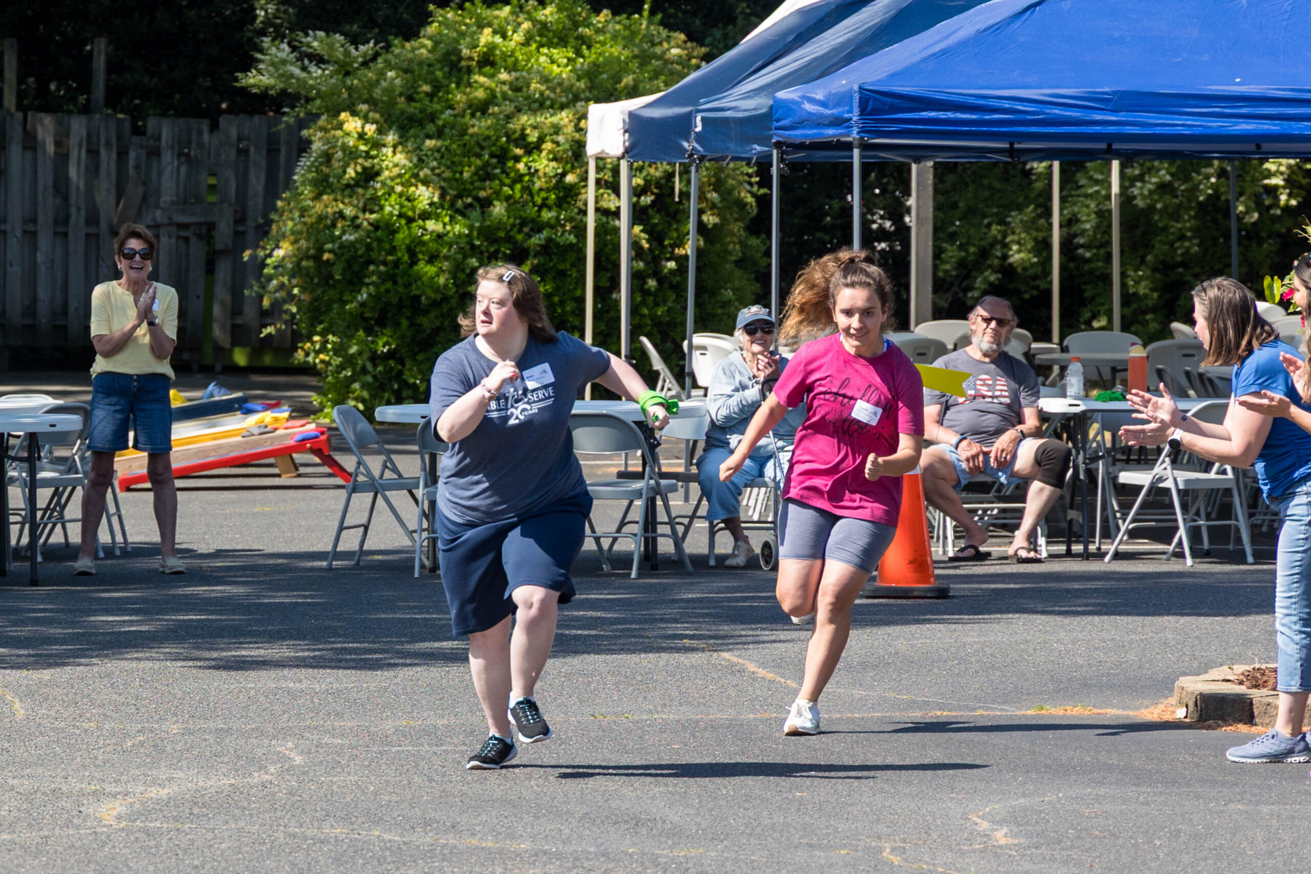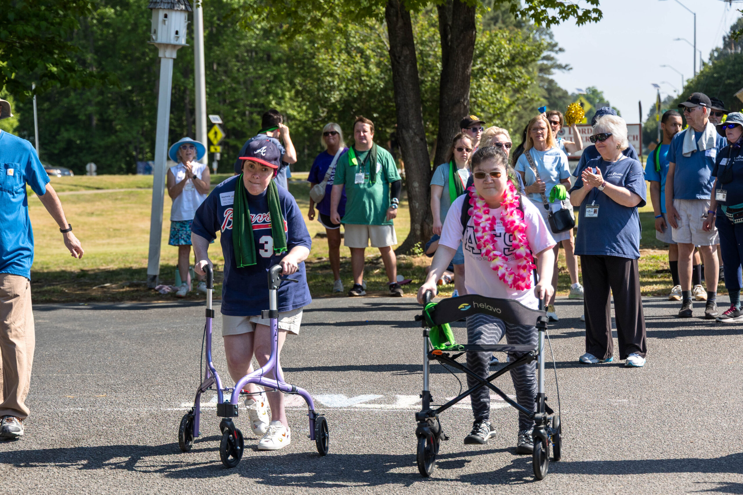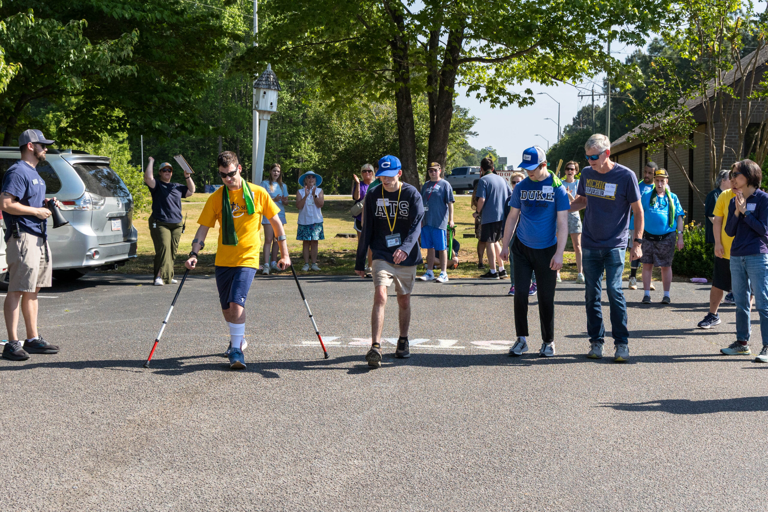 The Joy group led the parade, followed by the Faith, Grace, and Hope groups. The excited athletes marched across the parking lot, curved left, and passed through a tunnel of cheering spectators. Blue and gold tinsel pompons glistening in the sun accompanied the cheering. Fluorescent pool noodles waving in the air added to the colorful ambience.