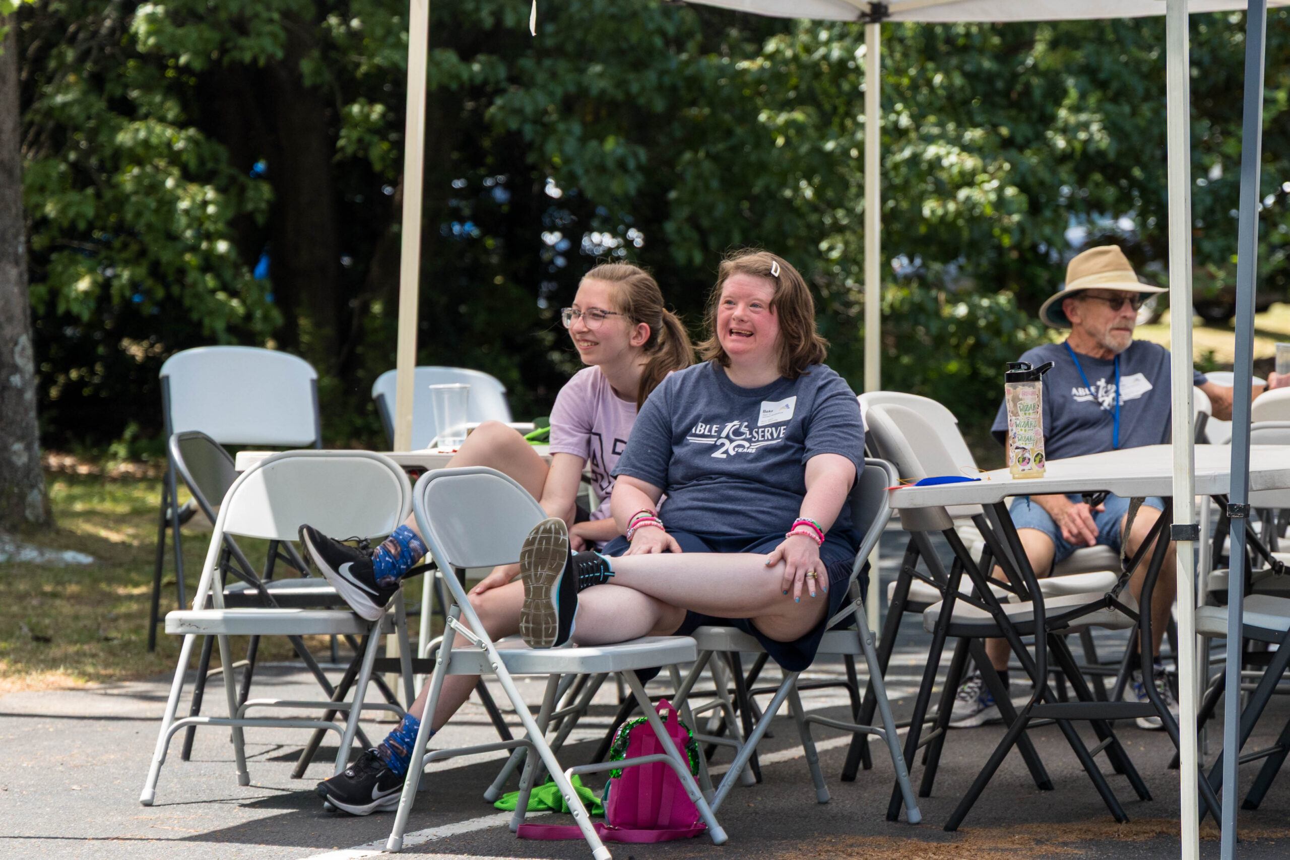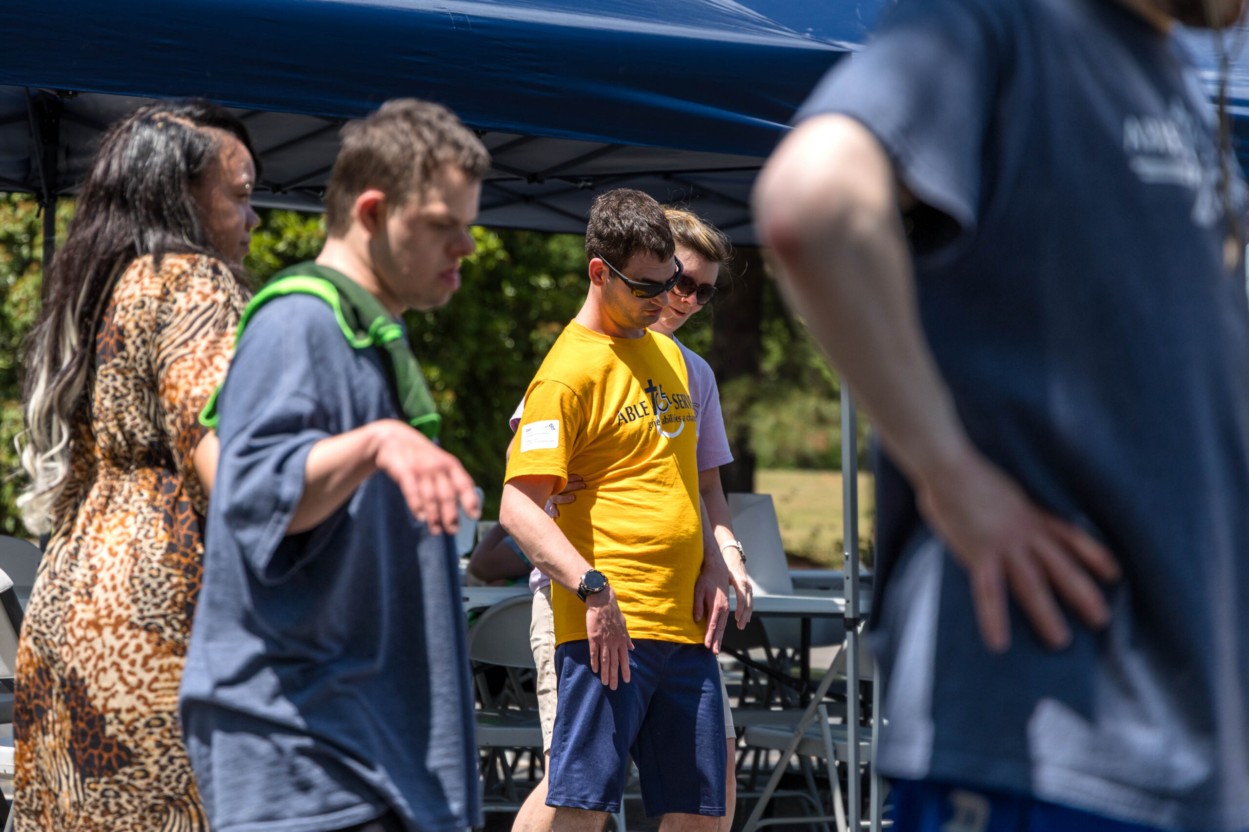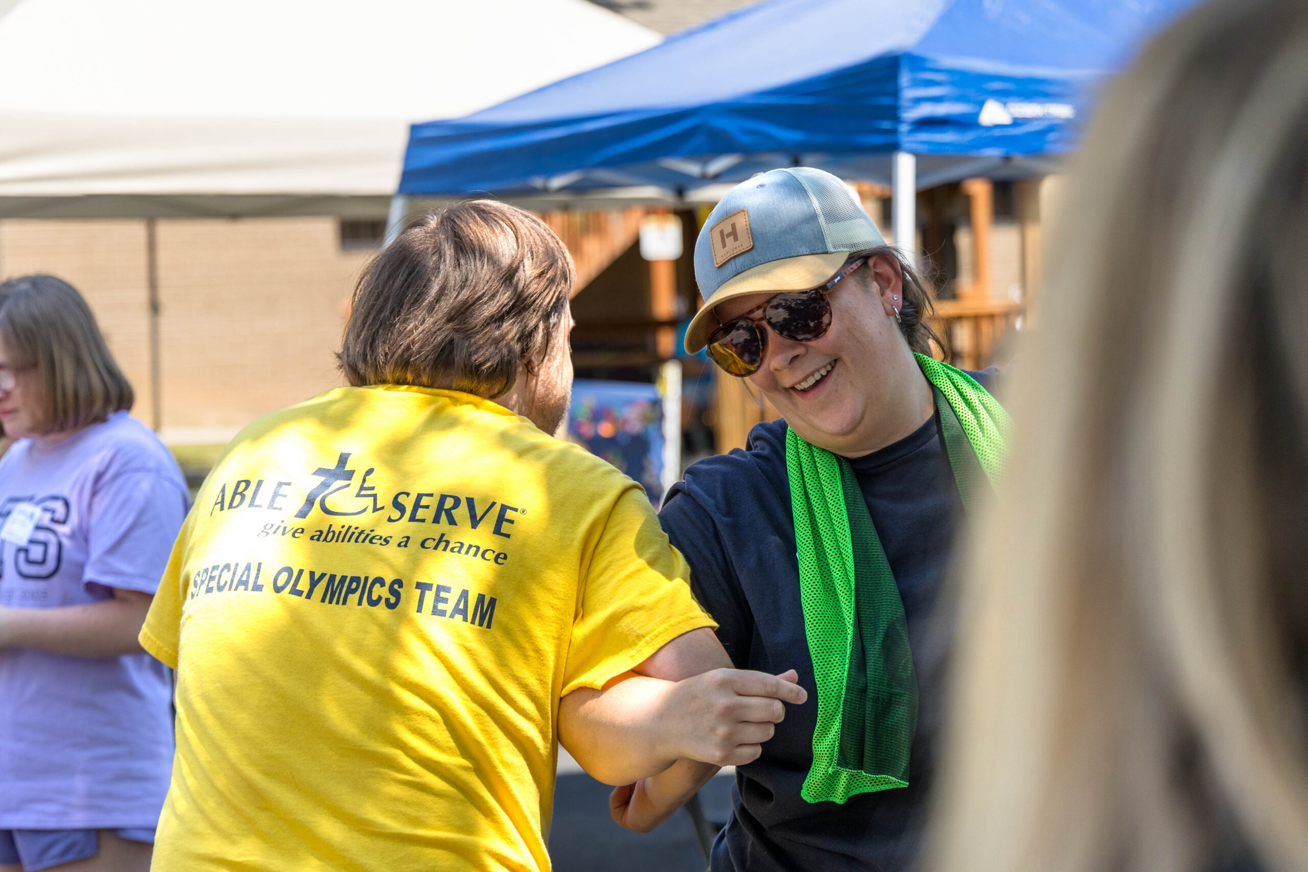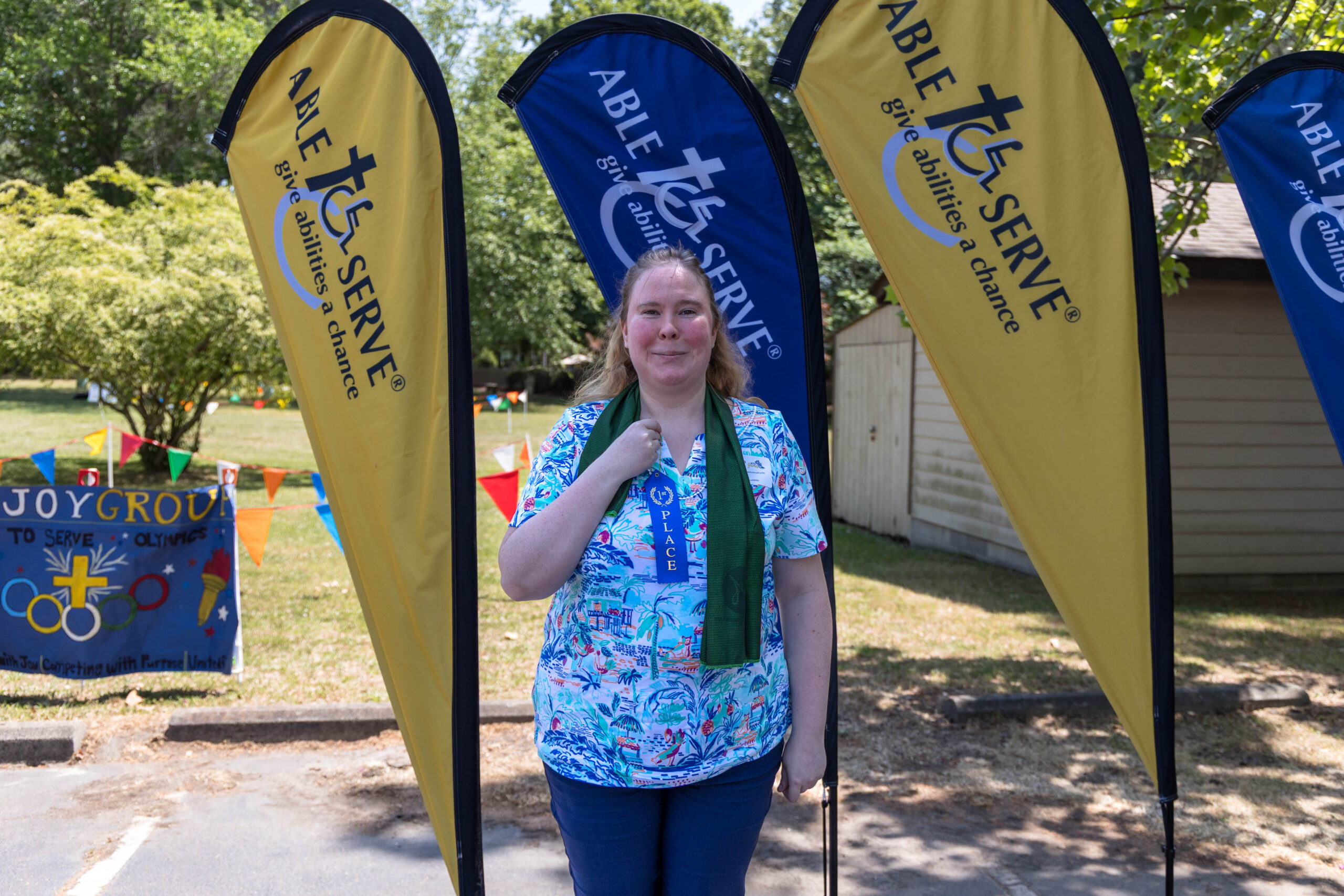 The Joy group led the parade, followed by the Faith, Grace, and Hope groups. The excited athletes marched across the parking lot, curved left, and passed through a tunnel of cheering spectators. Blue and gold tinsel pompons glistening in the sun accompanied the cheering. Fluorescent pool noodles waving in the air added to the colorful ambience.