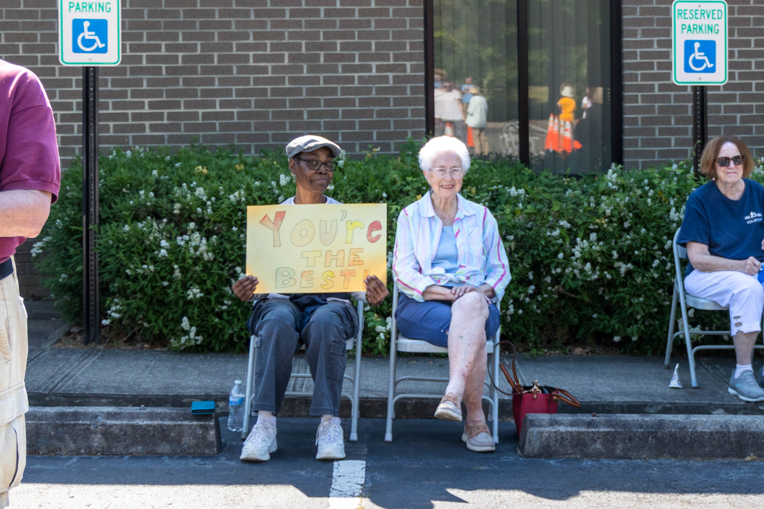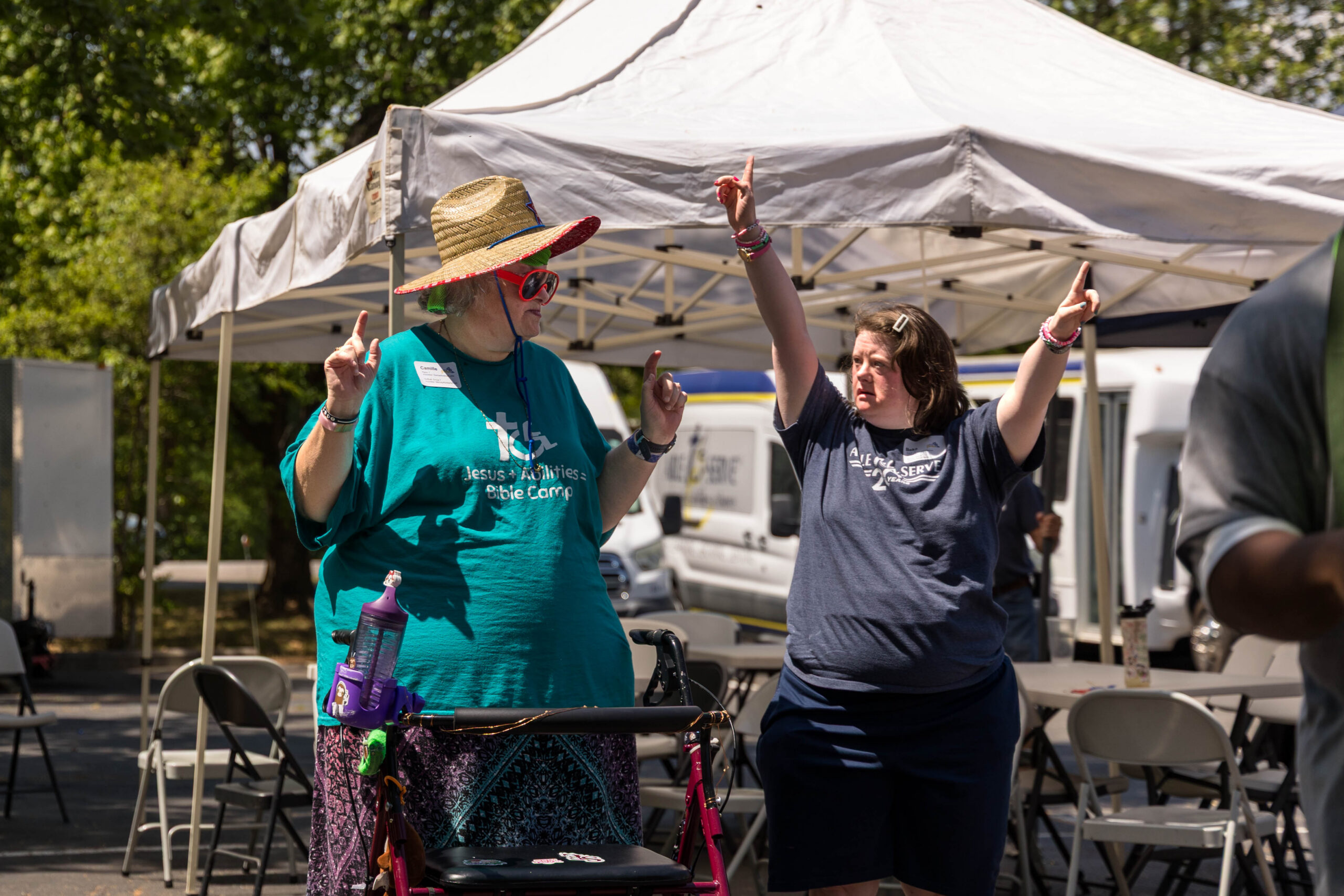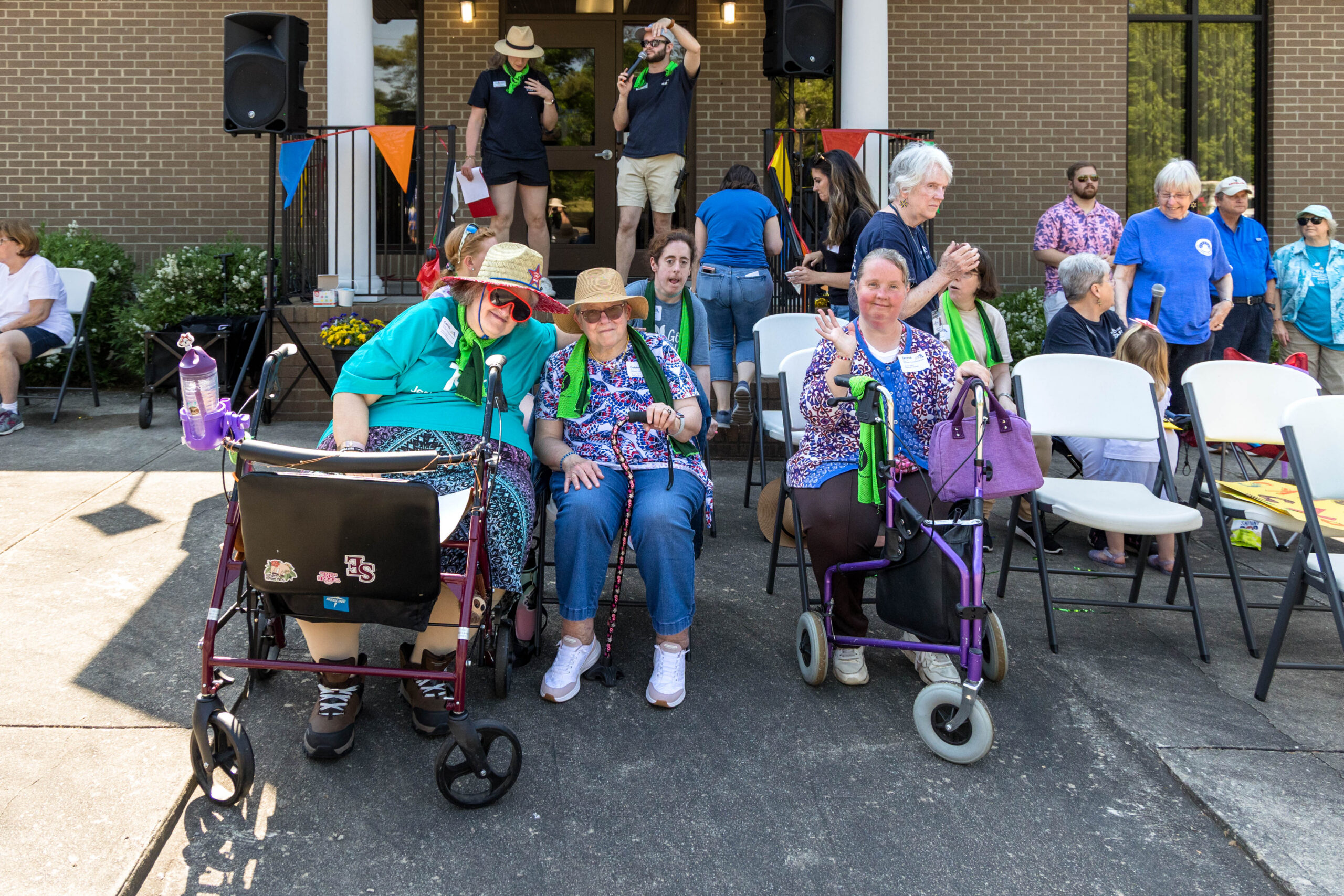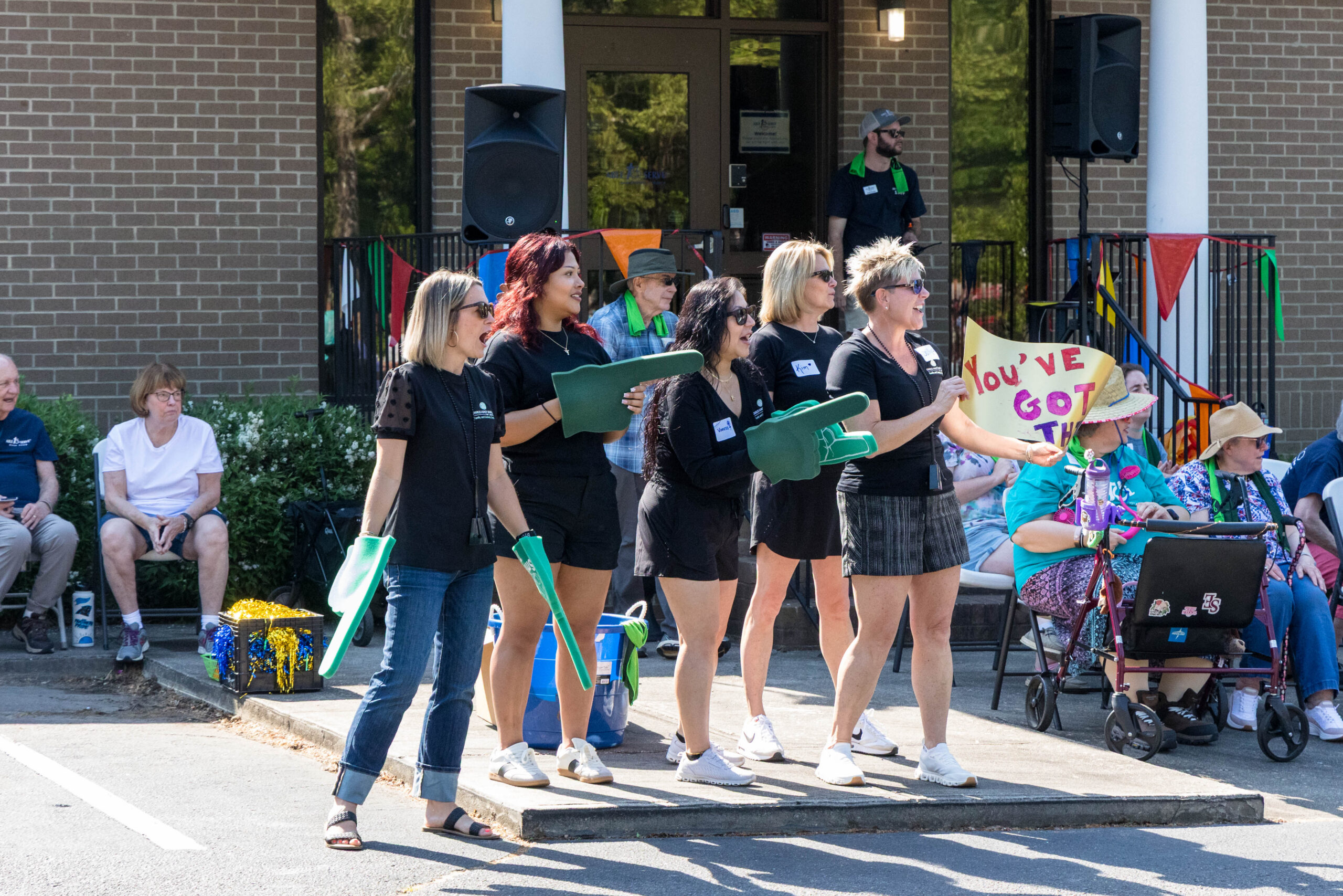 The Joy group led the parade, followed by the Faith, Grace, and Hope groups. The excited athletes marched across the parking lot, curved left, and passed through a tunnel of cheering spectators. Blue and gold tinsel pompons glistening in the sun accompanied the cheering. Fluorescent pool noodles waving in the air added to the colorful ambience.