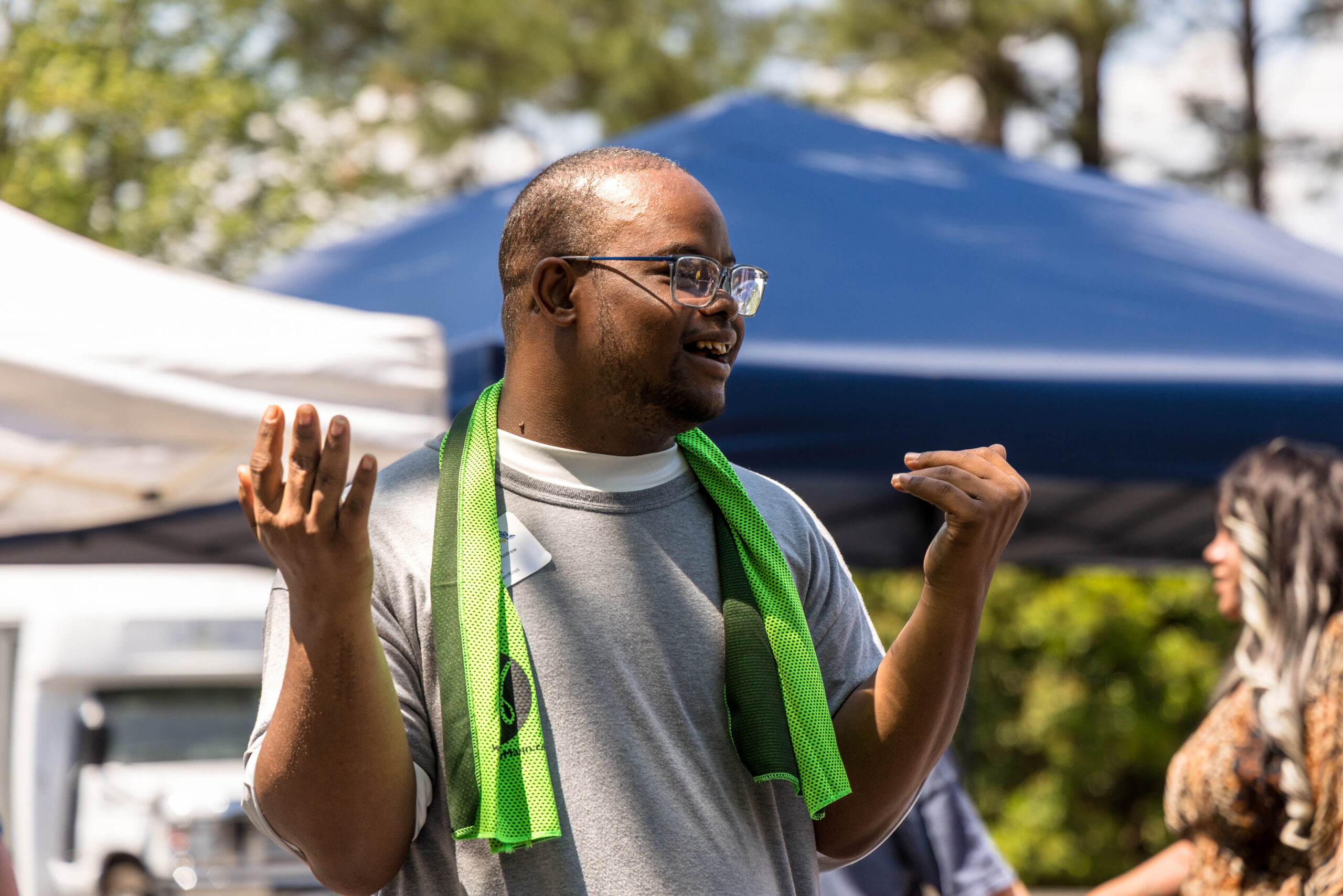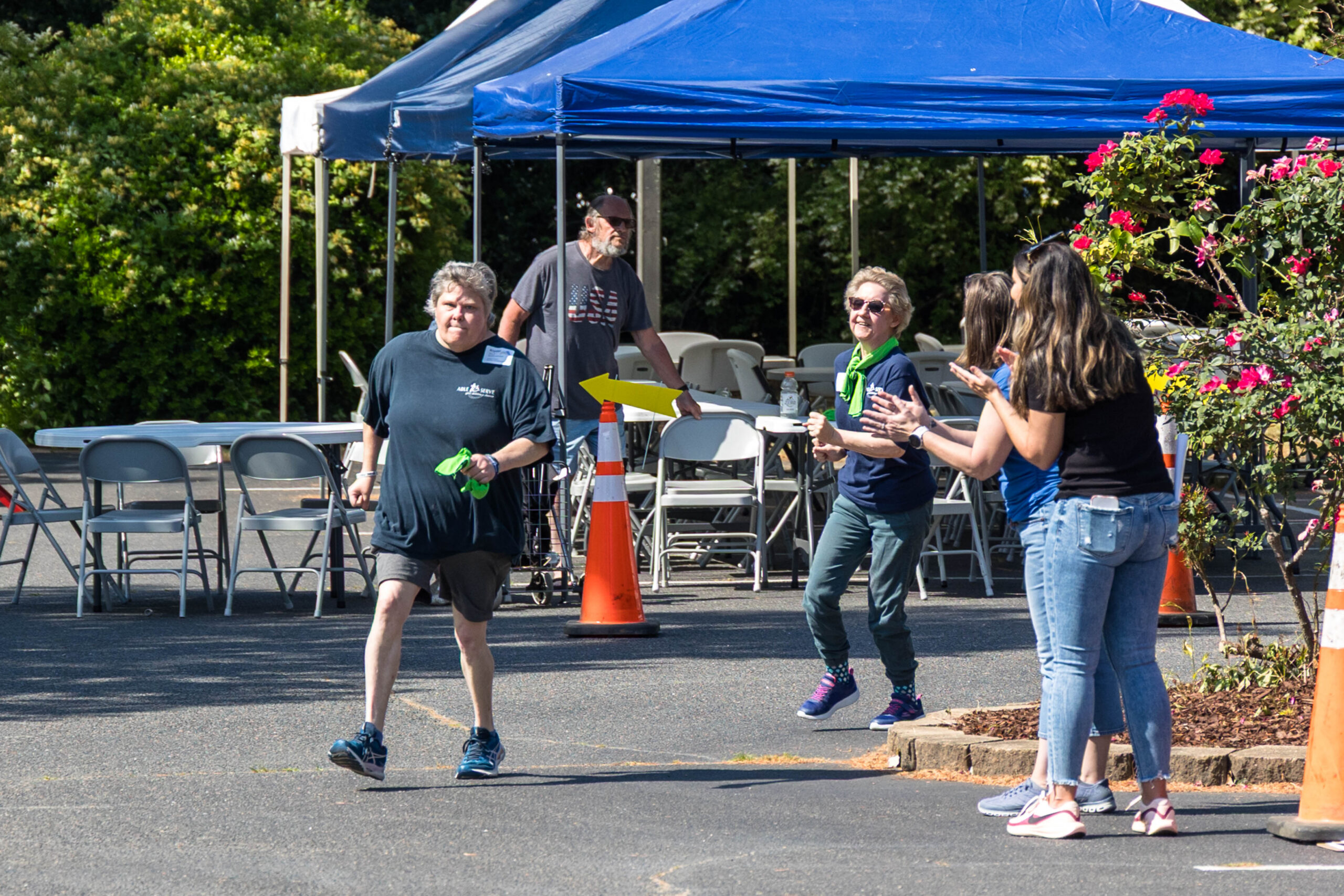 As the sun rose higher, the day grew quite warm. Anticipating the need for protection from the heat, the support team from Charles Ashley Mann dentistry provided much-appreciated cooling towels soaked in icy water. The ladies handed out the refreshing black/green scarves in addition to cheering on the athletes.