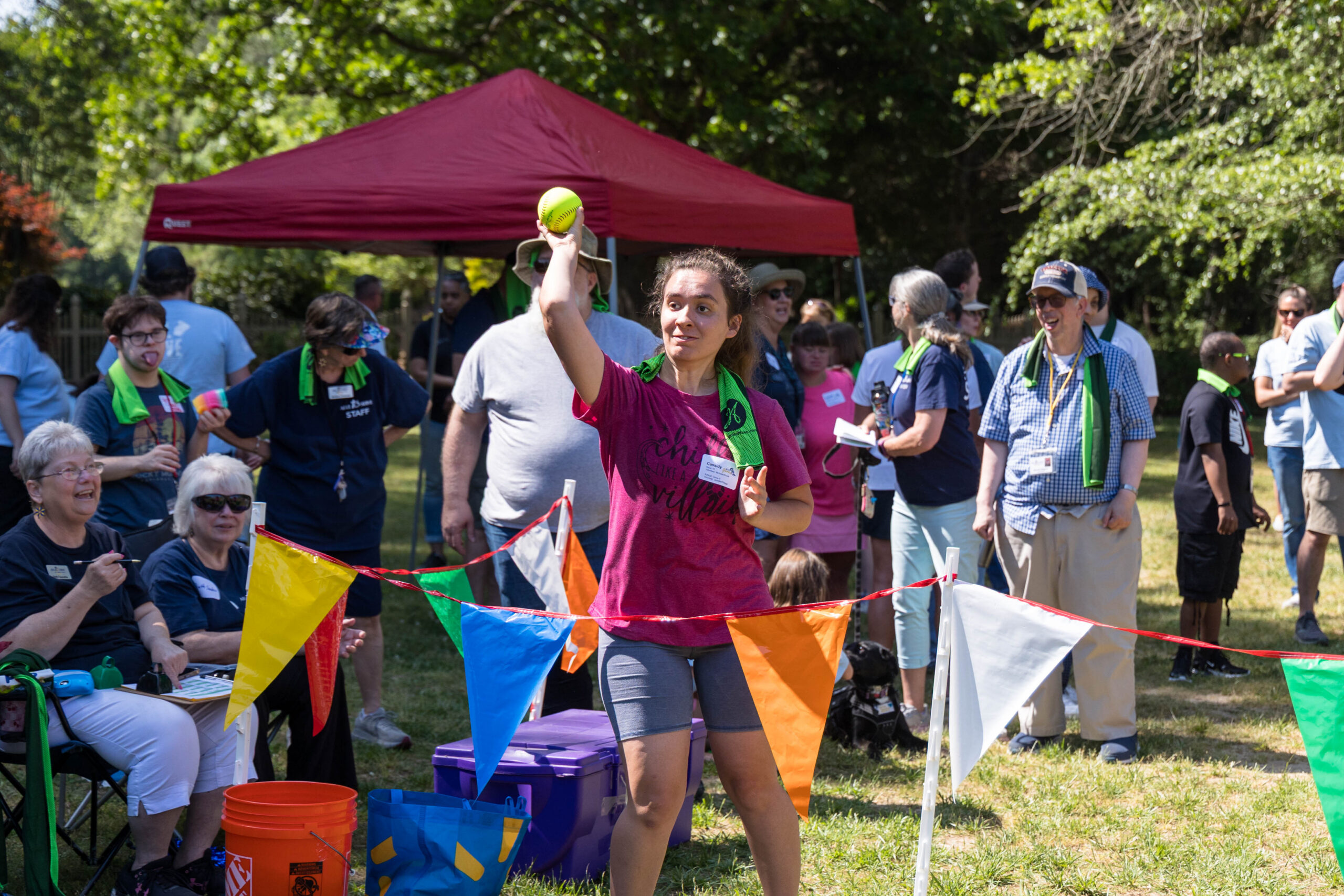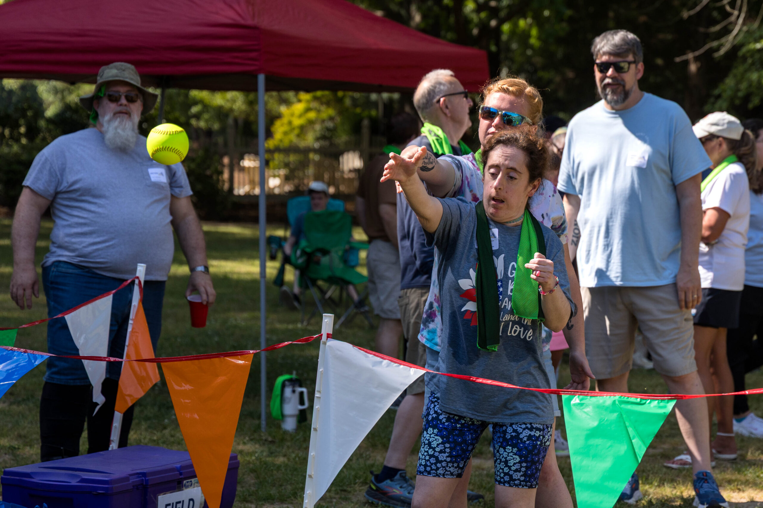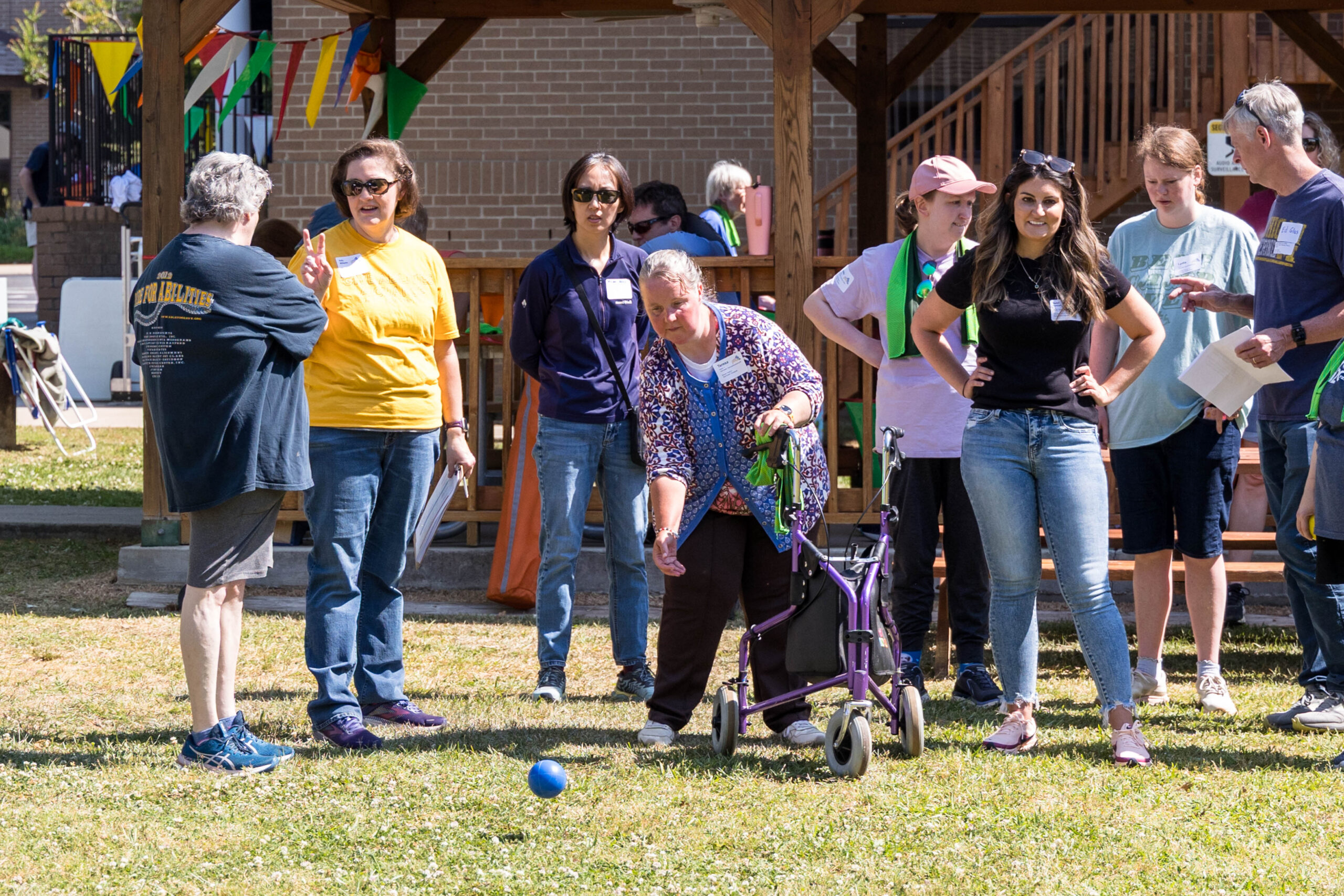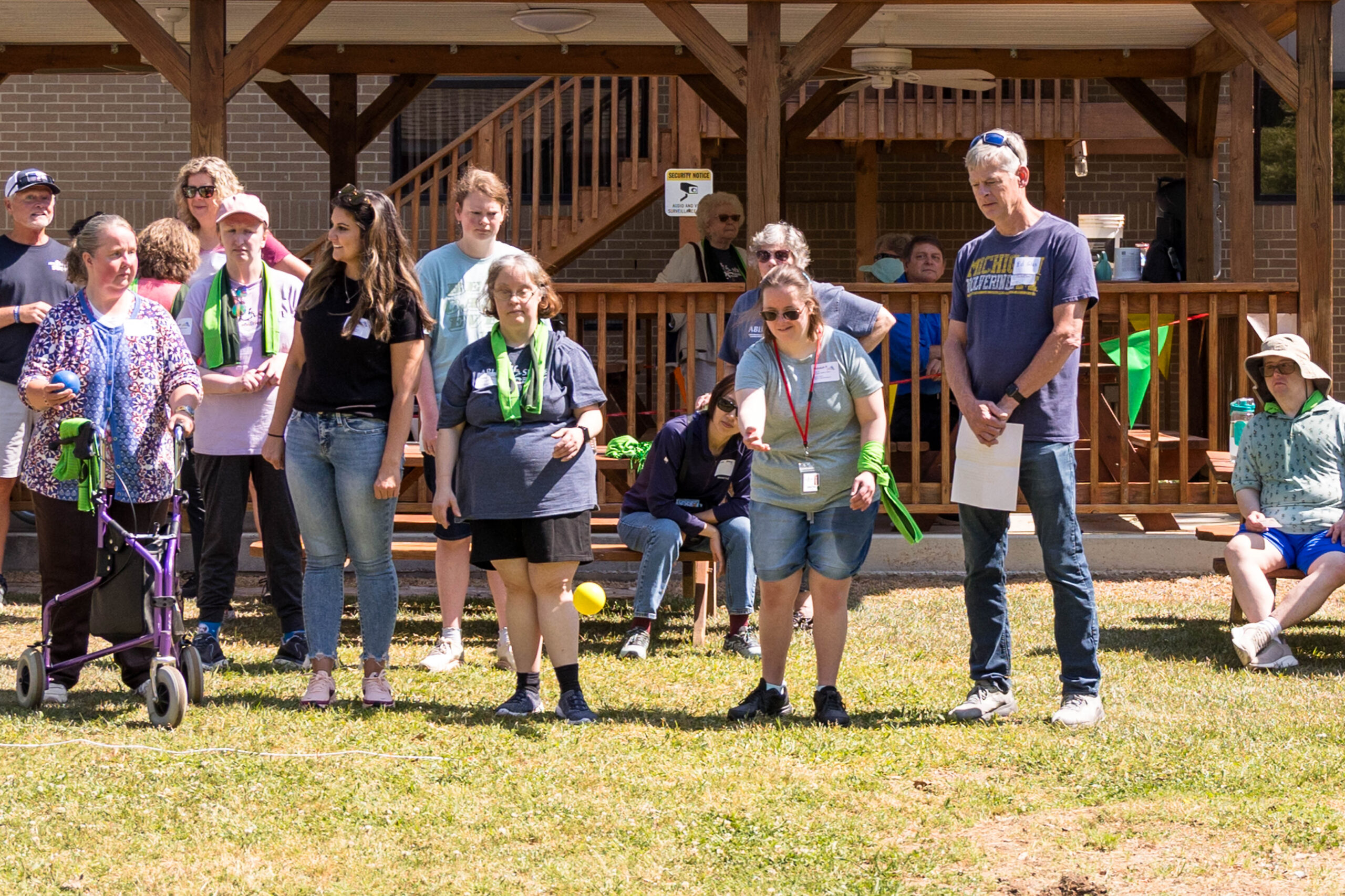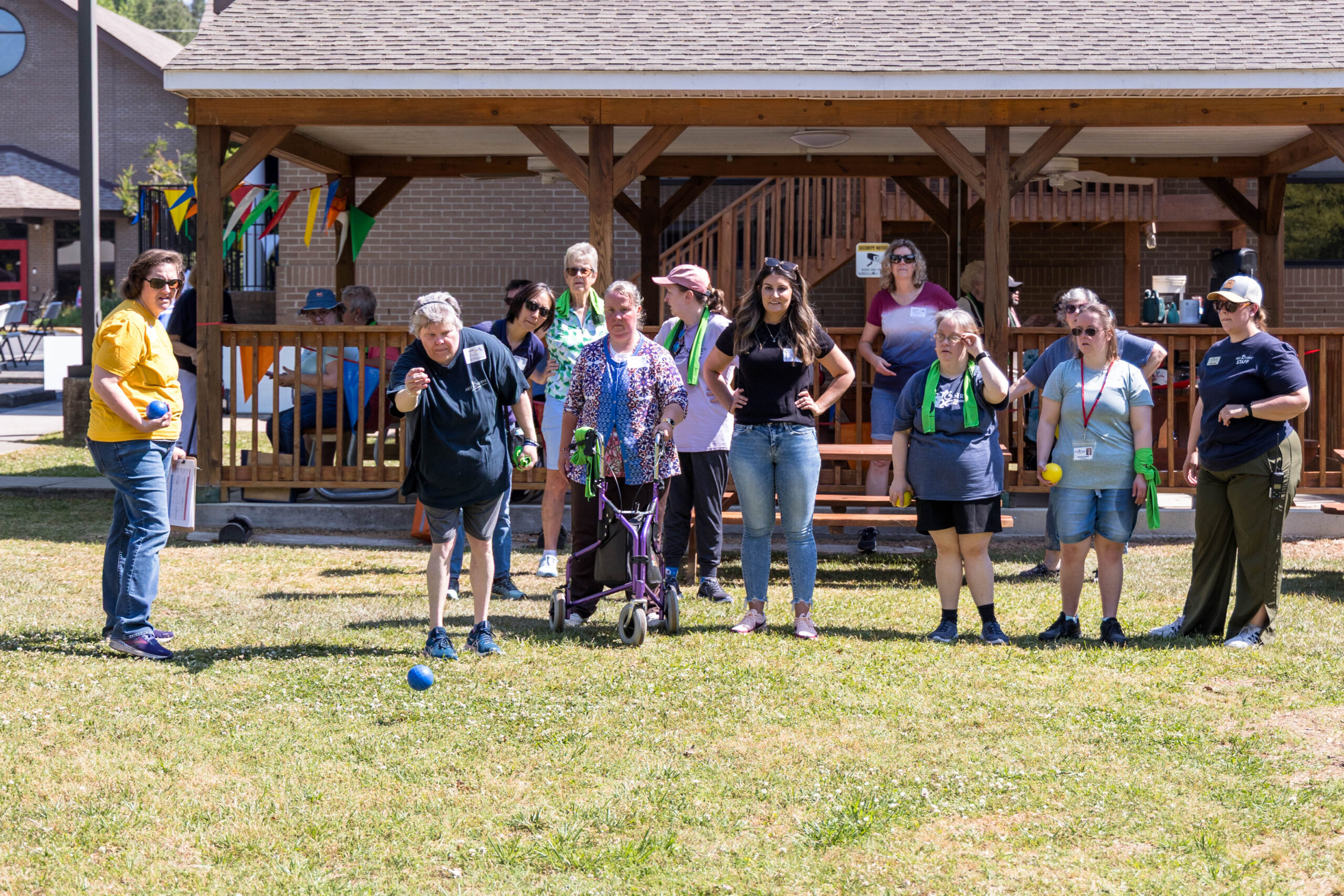 Once the racing games ended, participants moved as a group to the grassy areas for the softball throw and bocce competitions. Both courts were delineated with colorful flag streamers flapping in the wind. Like the races, they were divided into teams of three. For softball, each athlete had three throws; the furthest landing point of the ball was their final score. For bocce, the closest thrown ball to the target was measured.
