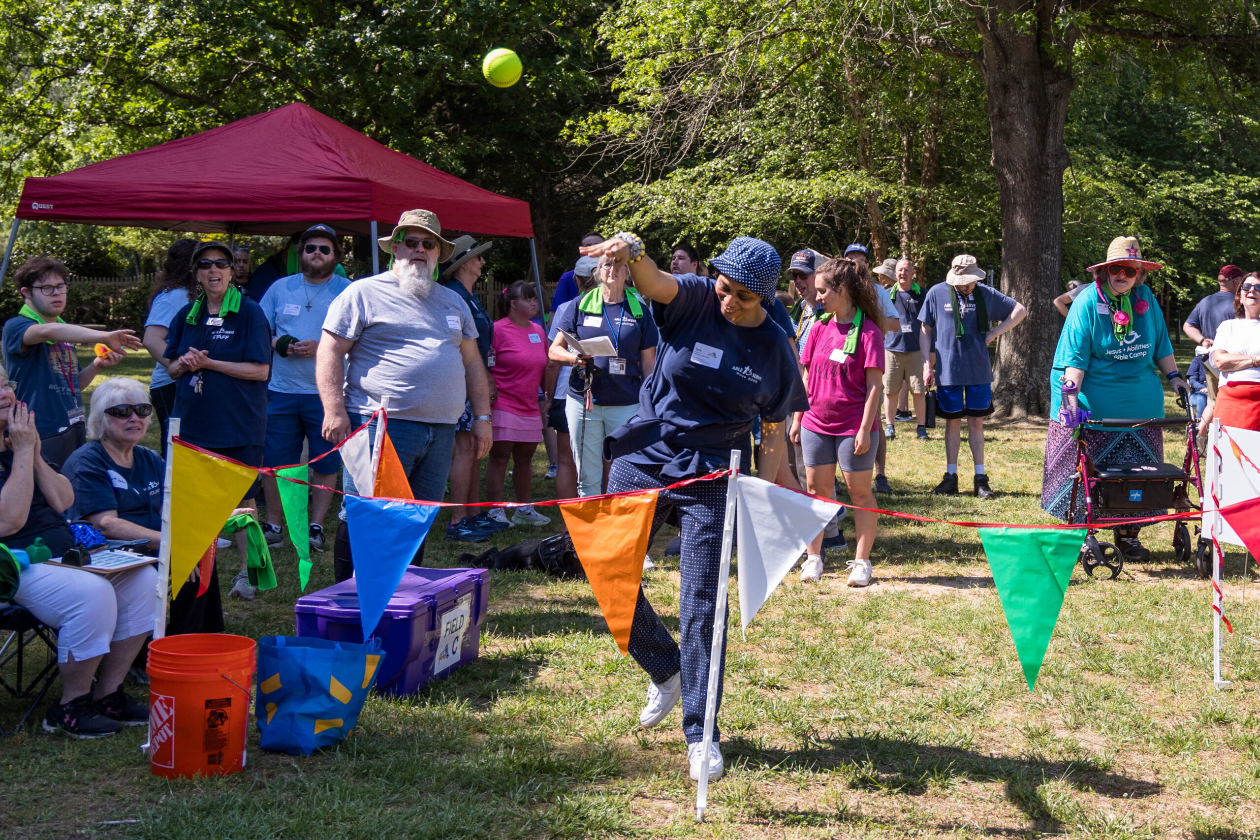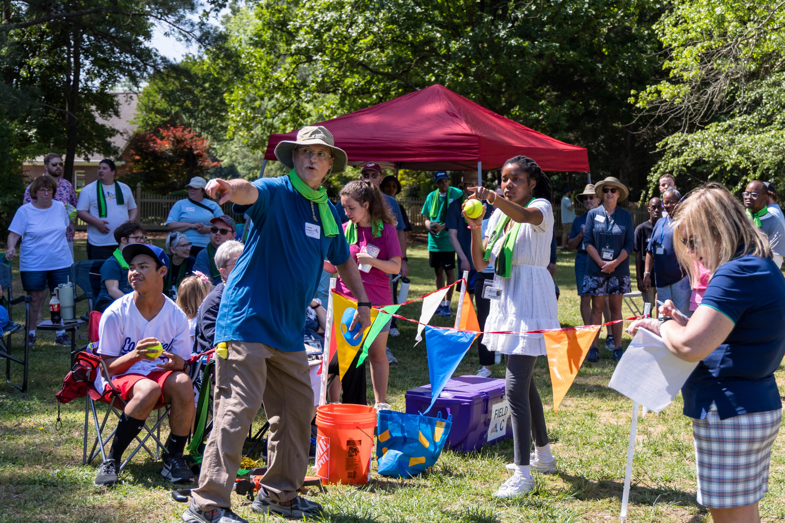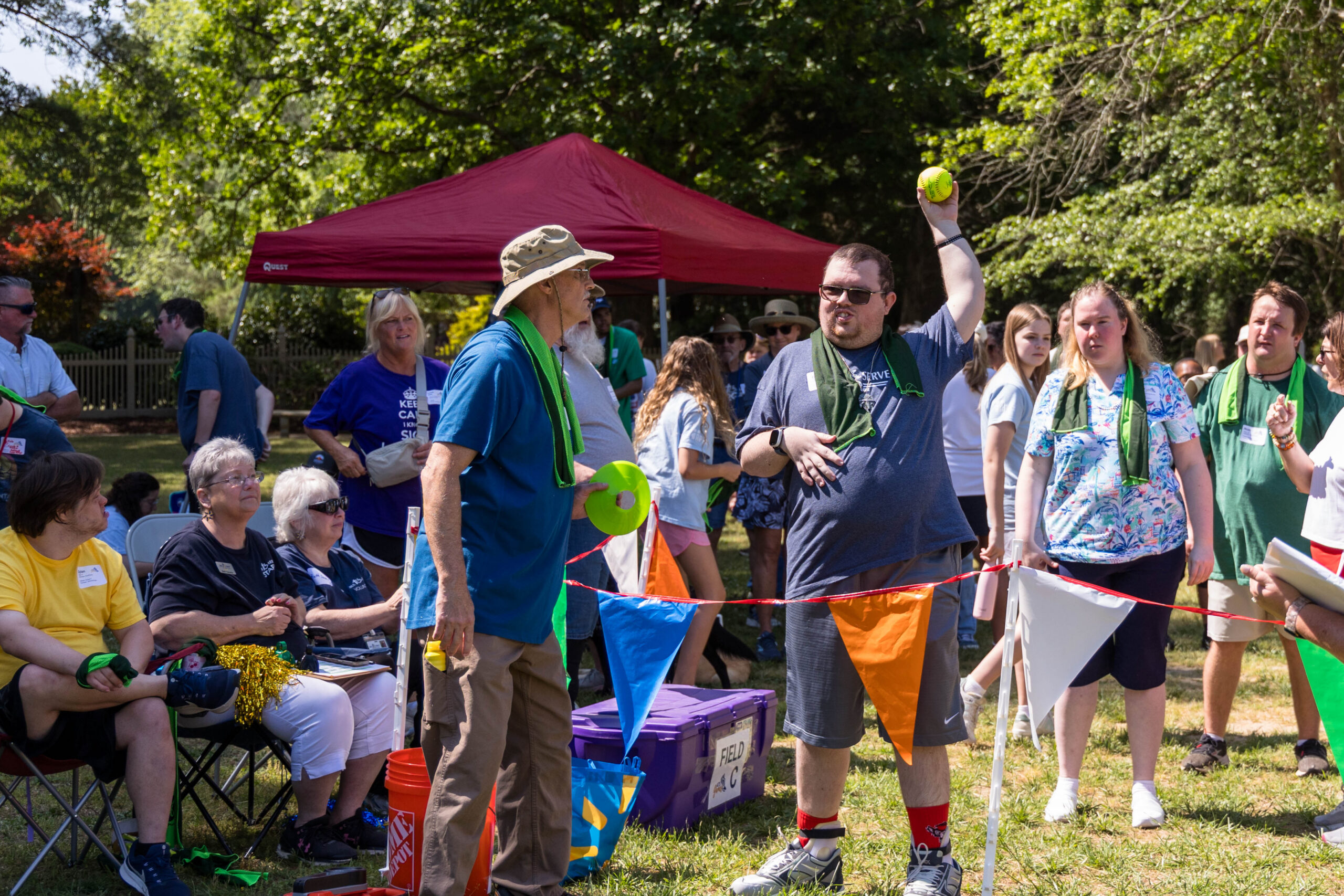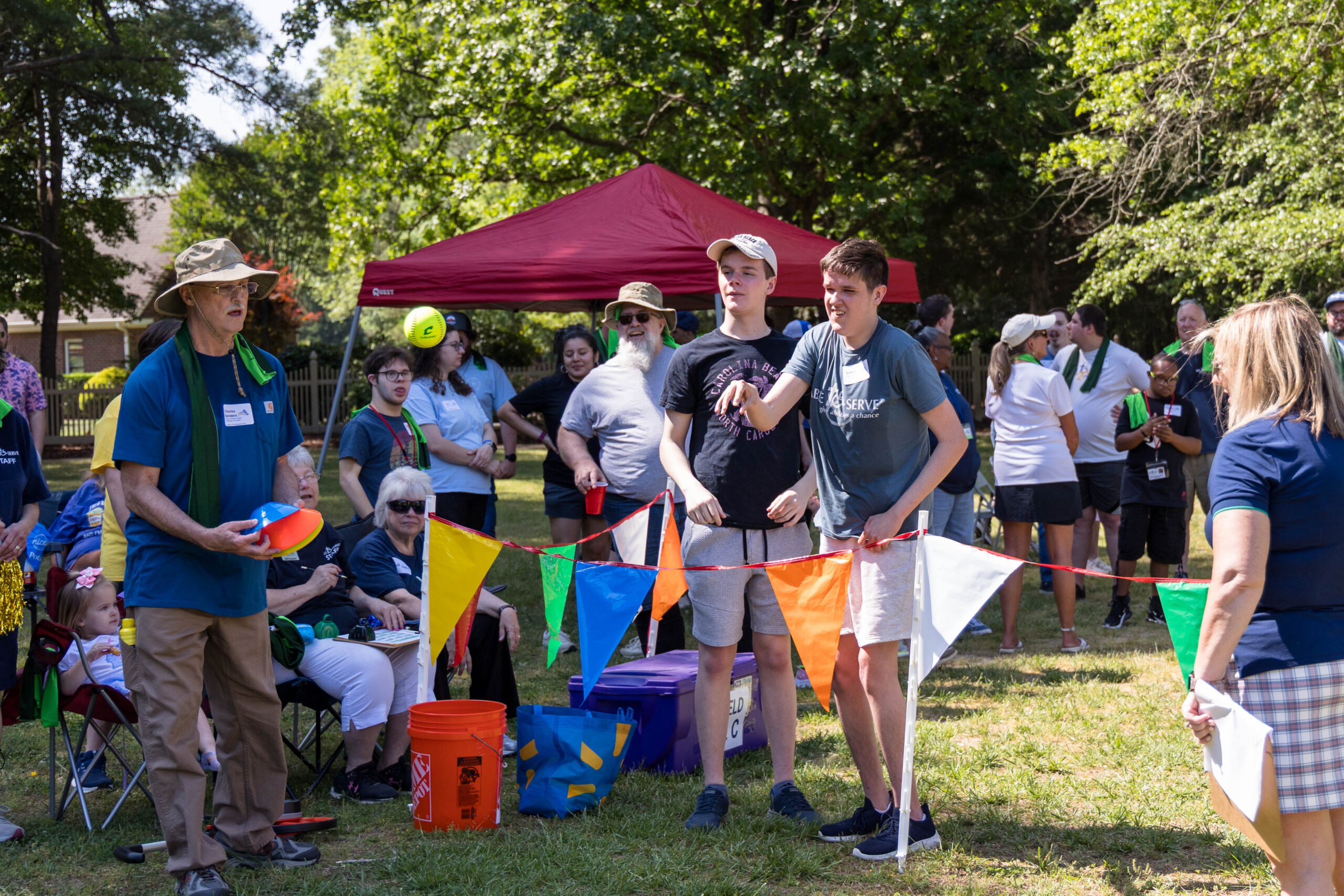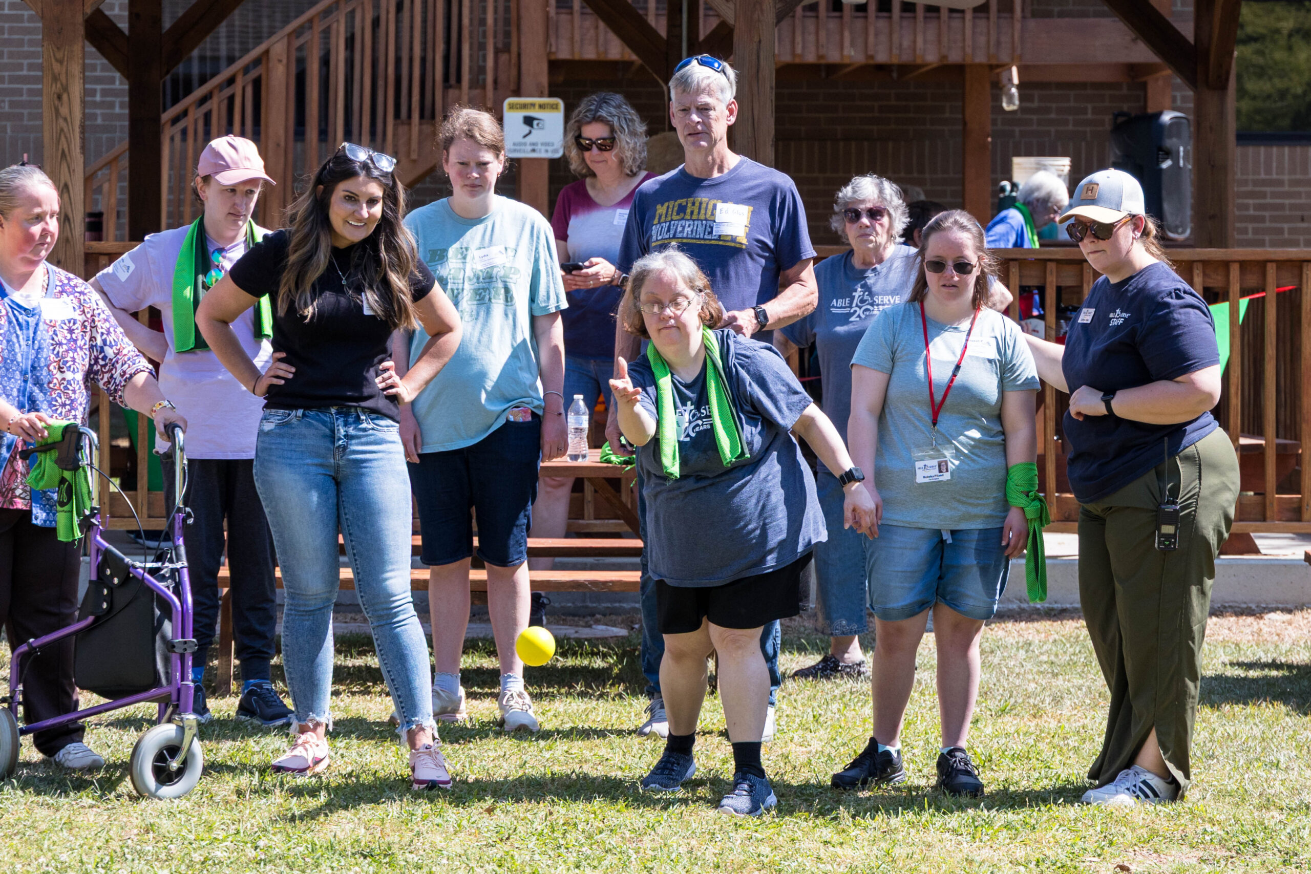 Once the racing games ended, participants moved as a group to the grassy areas for the softball throw and bocce competitions. Both courts were delineated with colorful flag streamers flapping in the wind. Like the races, they were divided into teams of three. For softball, each athlete had three throws; the furthest landing point of the ball was their final score. For bocce, the closest thrown ball to the target was measured.