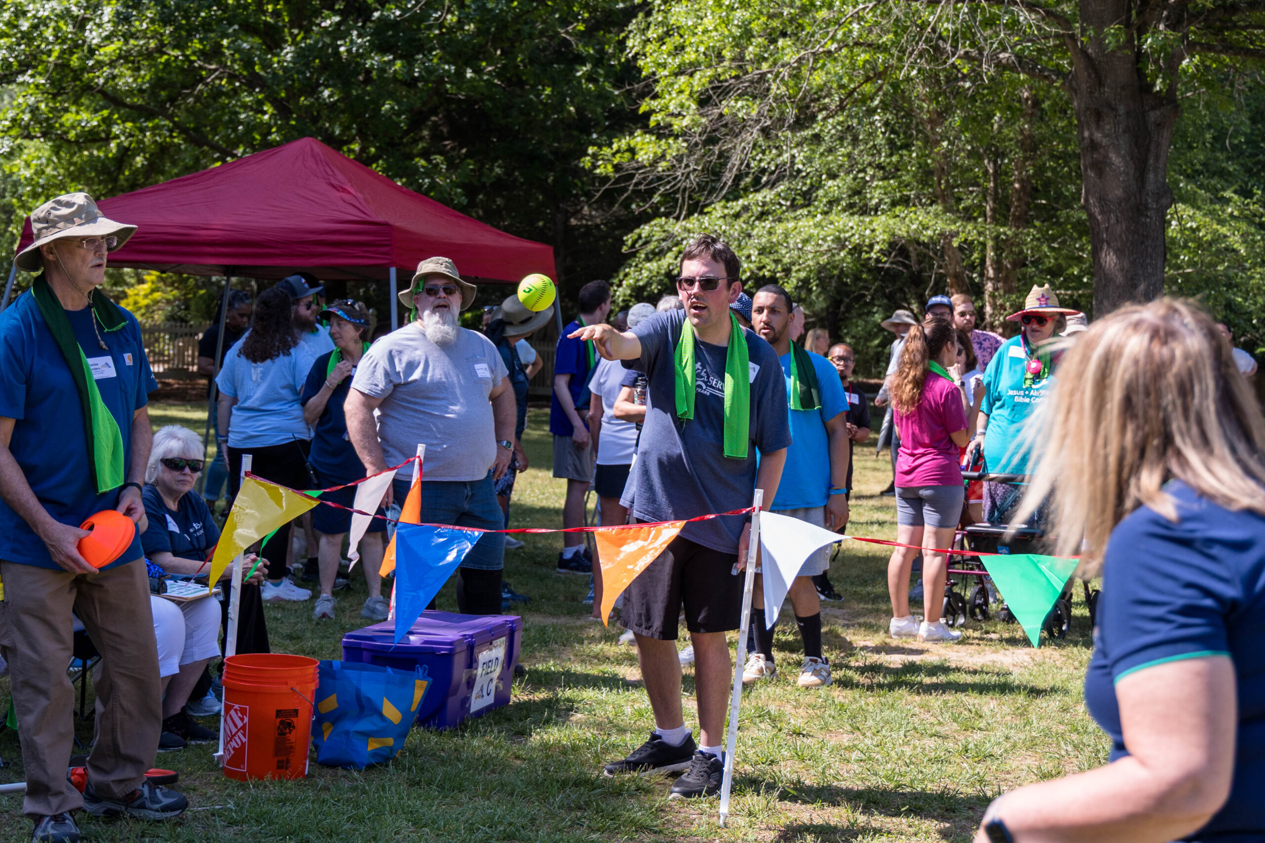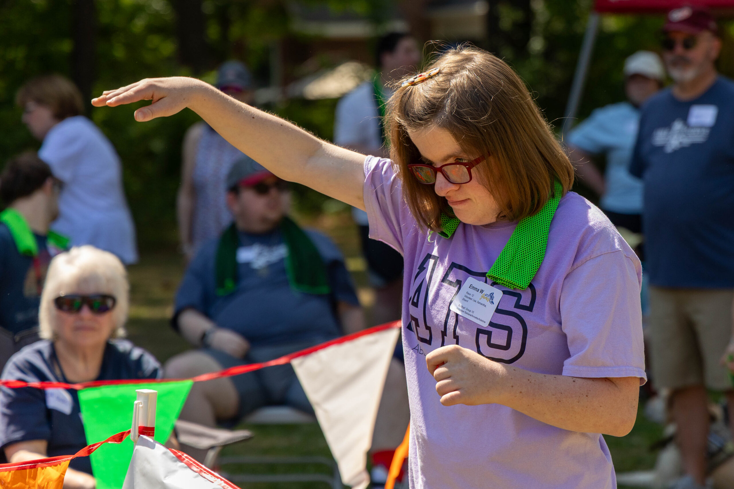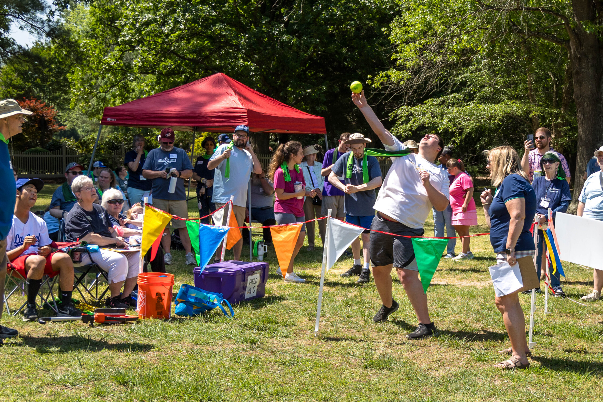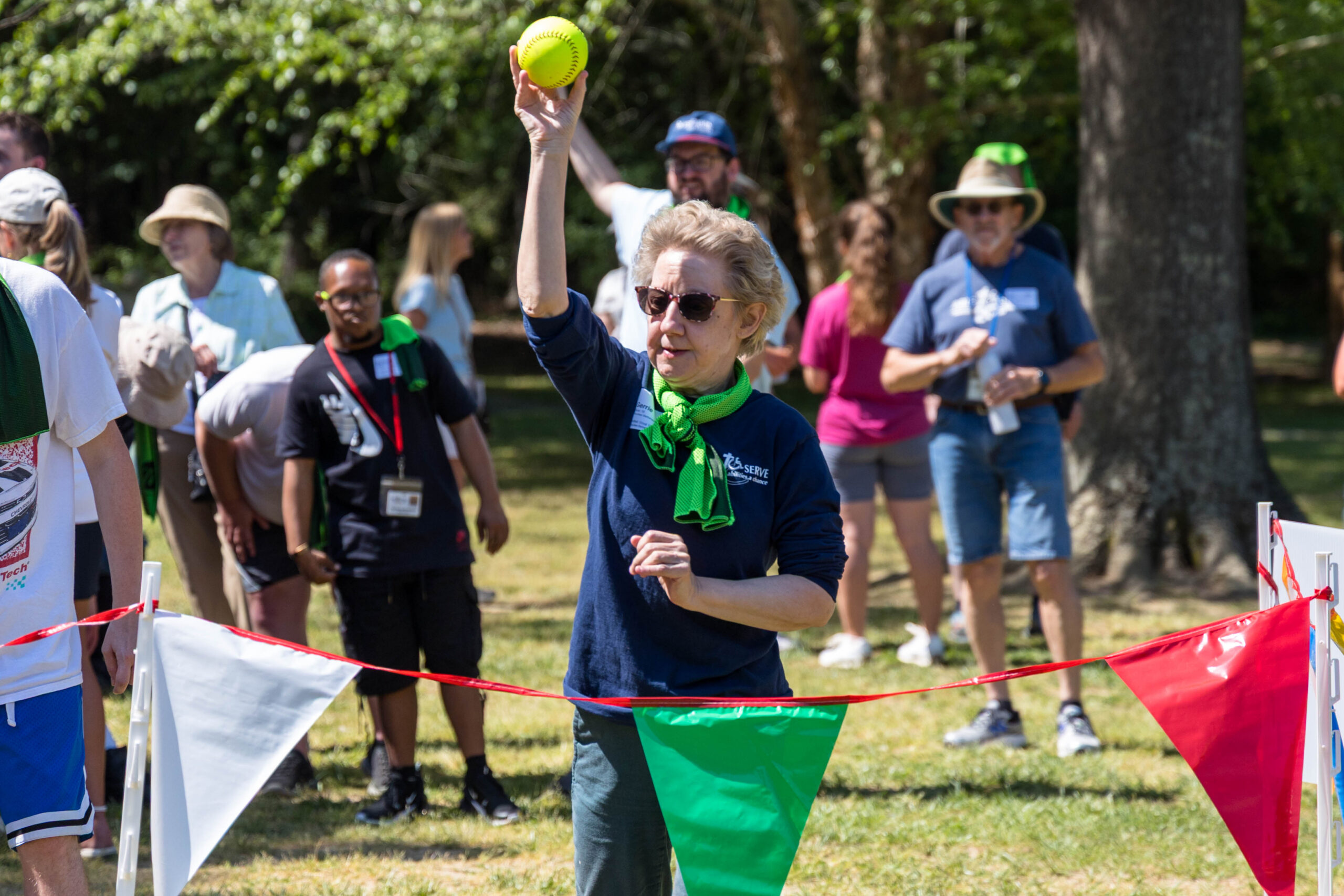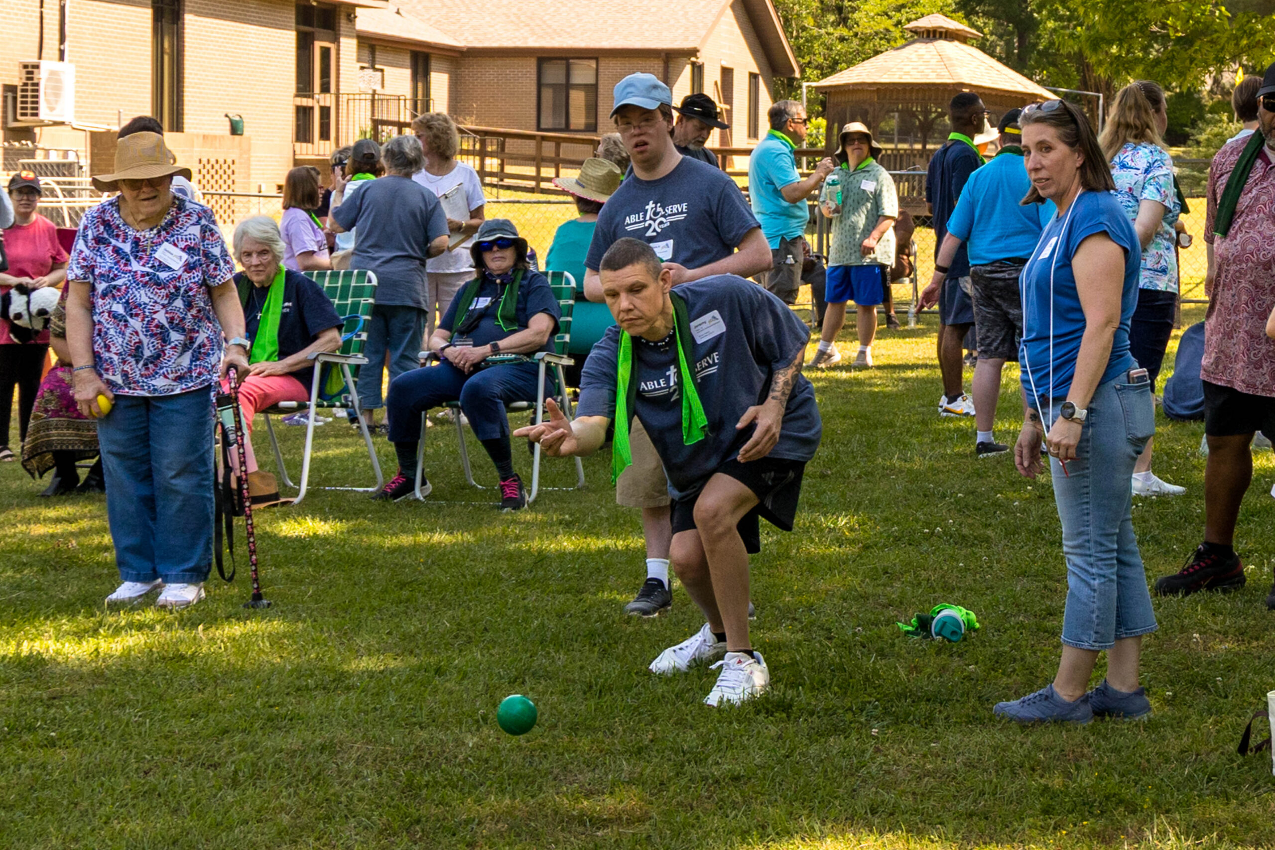 Once the racing games ended, participants moved as a group to the grassy areas for the softball throw and bocce competitions. Both courts were delineated with colorful flag streamers flapping in the wind. Like the races, they were divided into teams of three. For softball, each athlete had three throws; the furthest landing point of the ball was their final score. For bocce, the closest thrown ball to the target was measured.