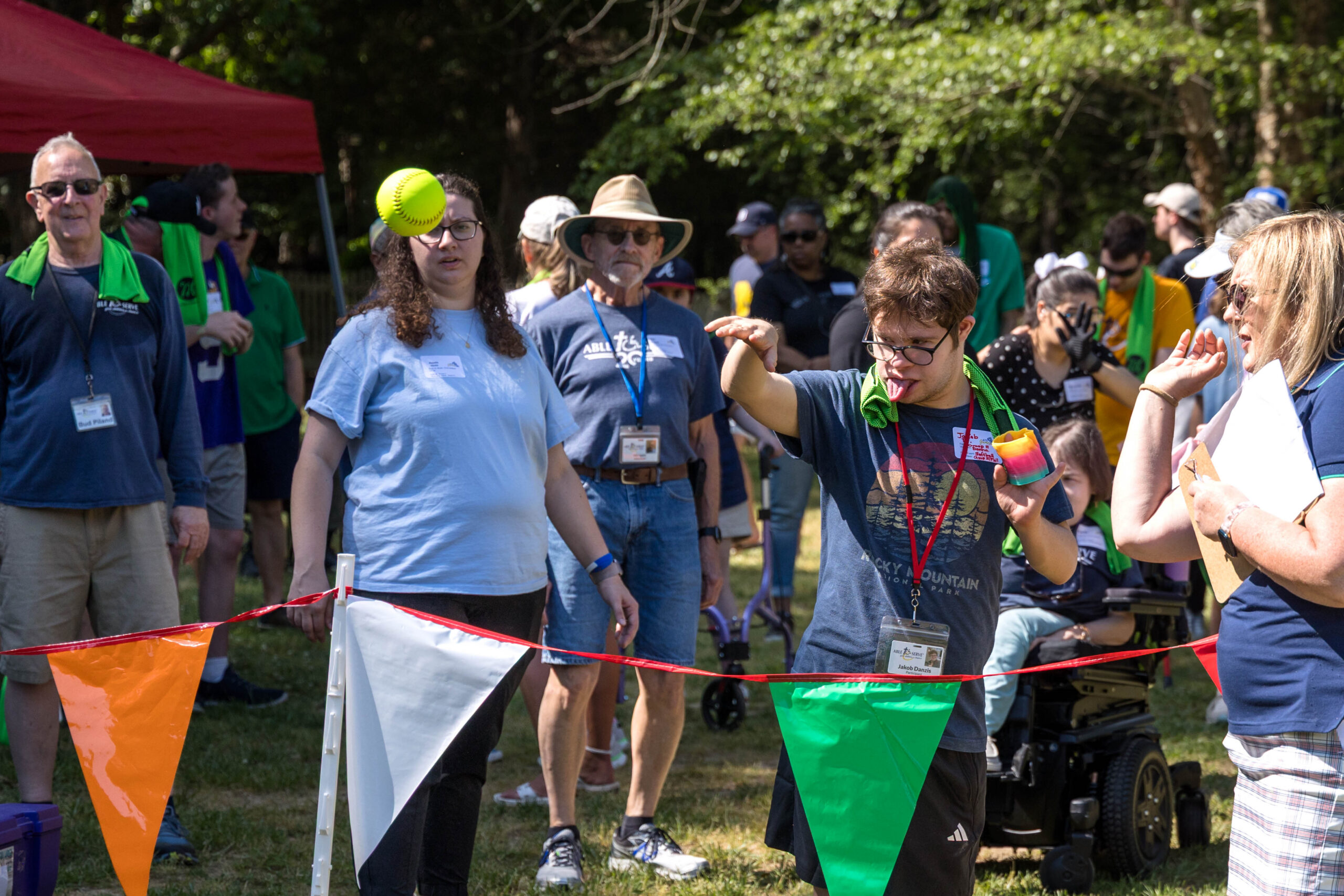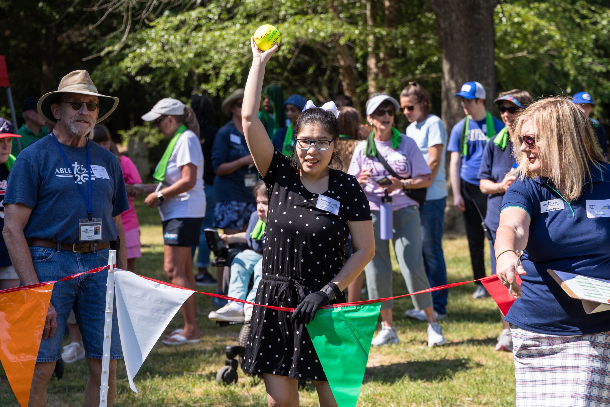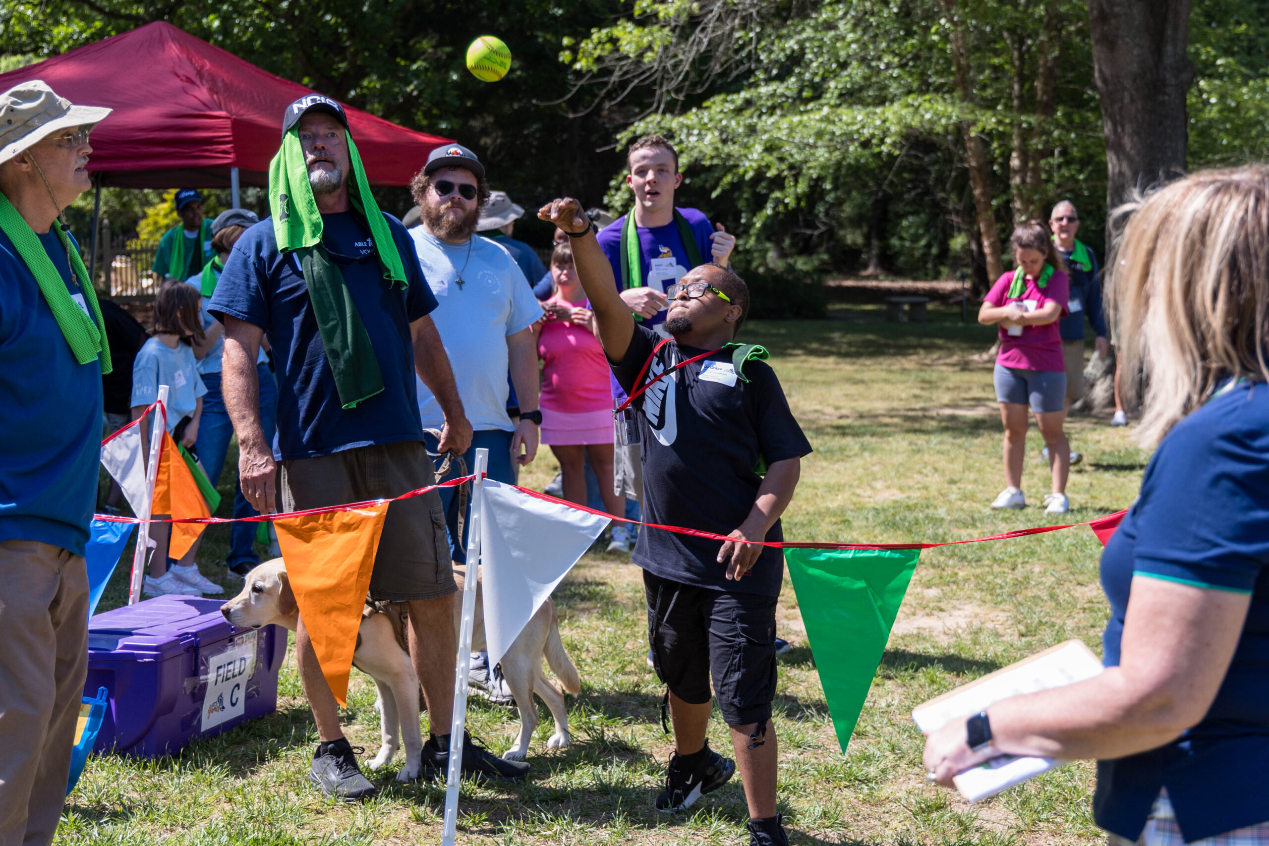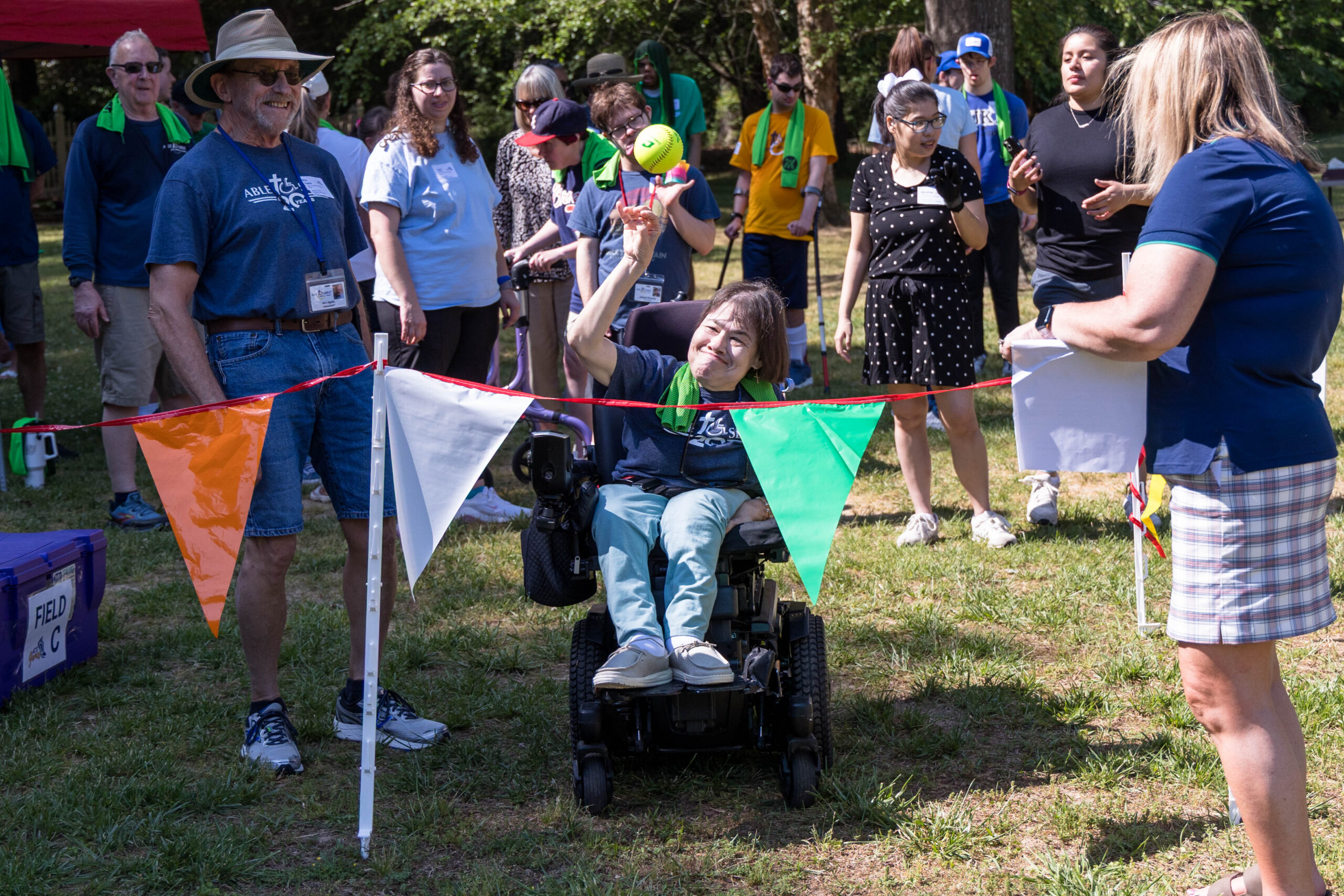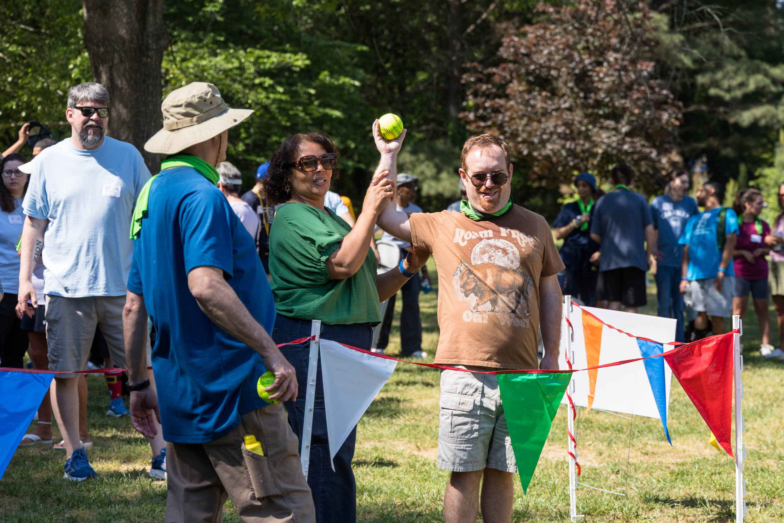 Once the racing games ended, participants moved as a group to the grassy areas for the softball throw and bocce competitions. Both courts were delineated with colorful flag streamers flapping in the wind. Like the races, they were divided into teams of three. For softball, each athlete had three throws; the furthest landing point of the ball was their final score. For bocce, the closest thrown ball to the target was measured.
