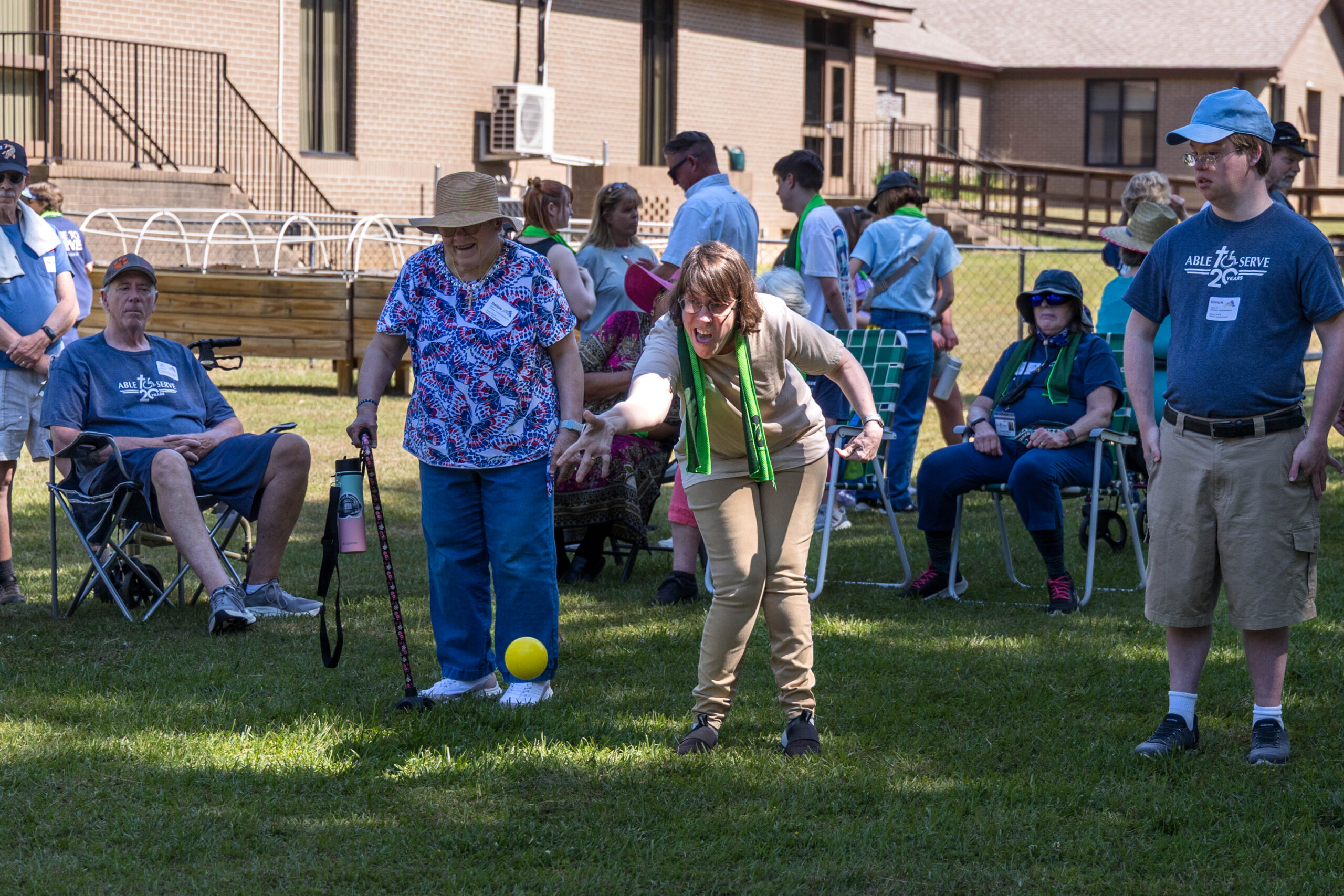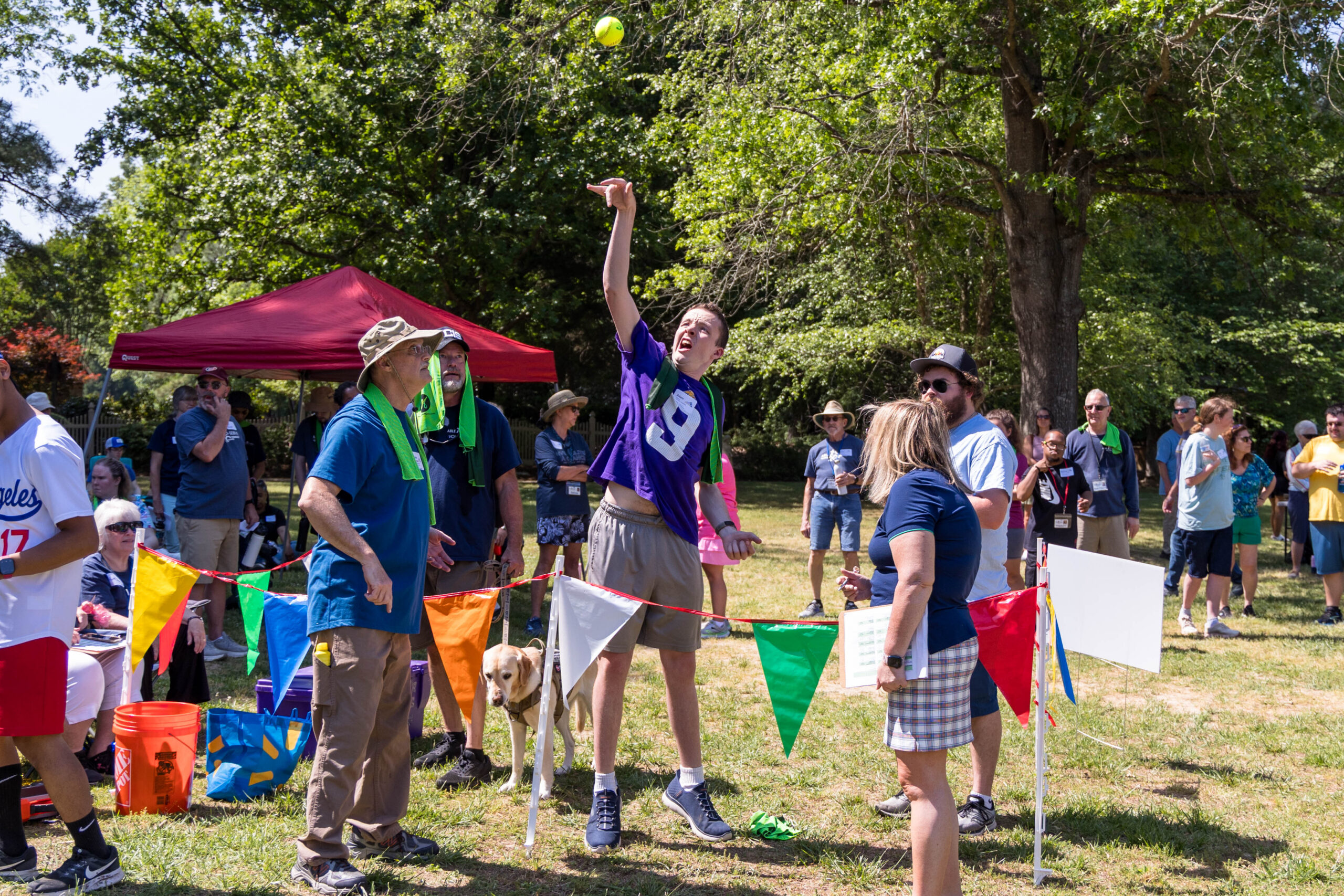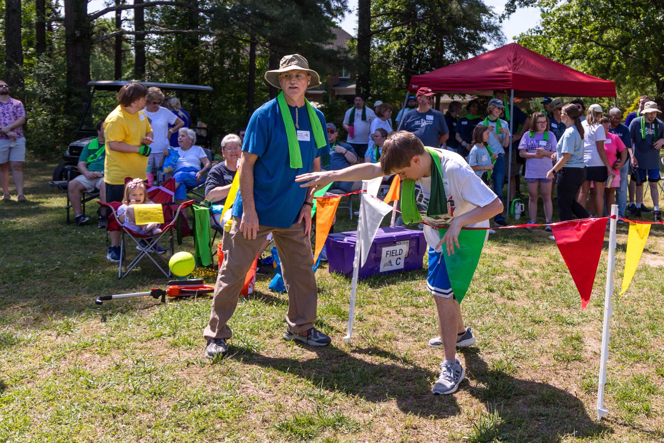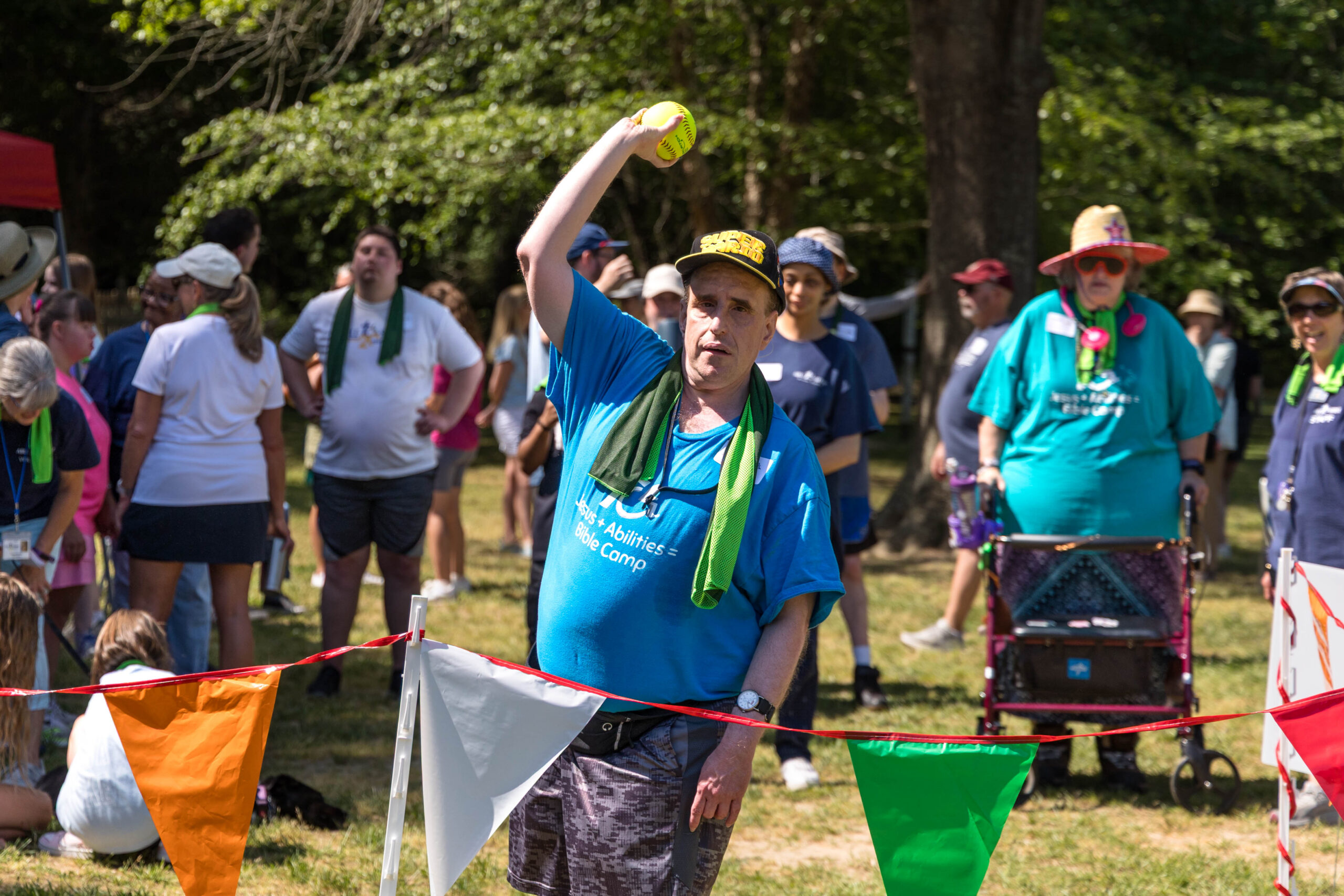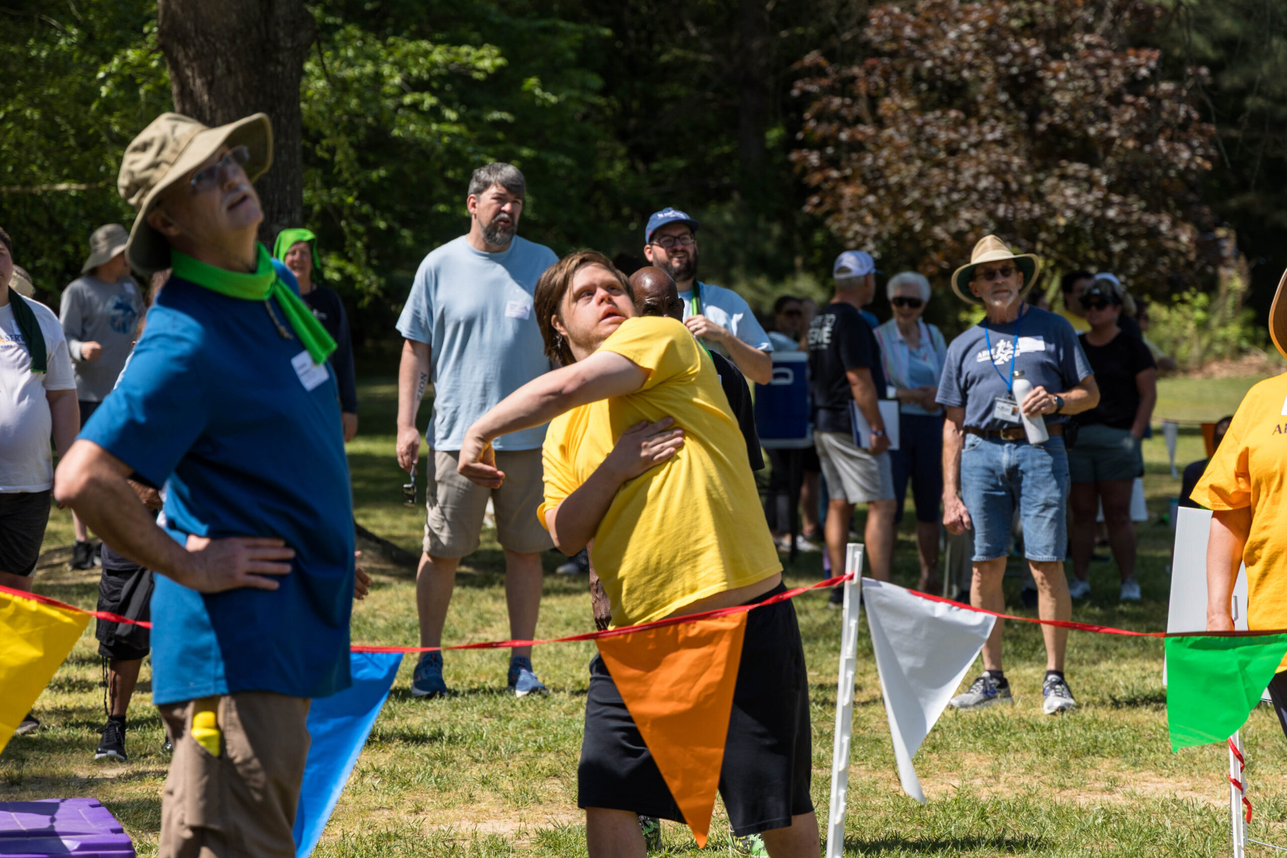 Once the racing games ended, participants moved as a group to the grassy areas for the softball throw and bocce competitions. Both courts were delineated with colorful flag streamers flapping in the wind. Like the races, they were divided into teams of three. For softball, each athlete had three throws; the furthest landing point of the ball was their final score. For bocce, the closest thrown ball to the target was measured.