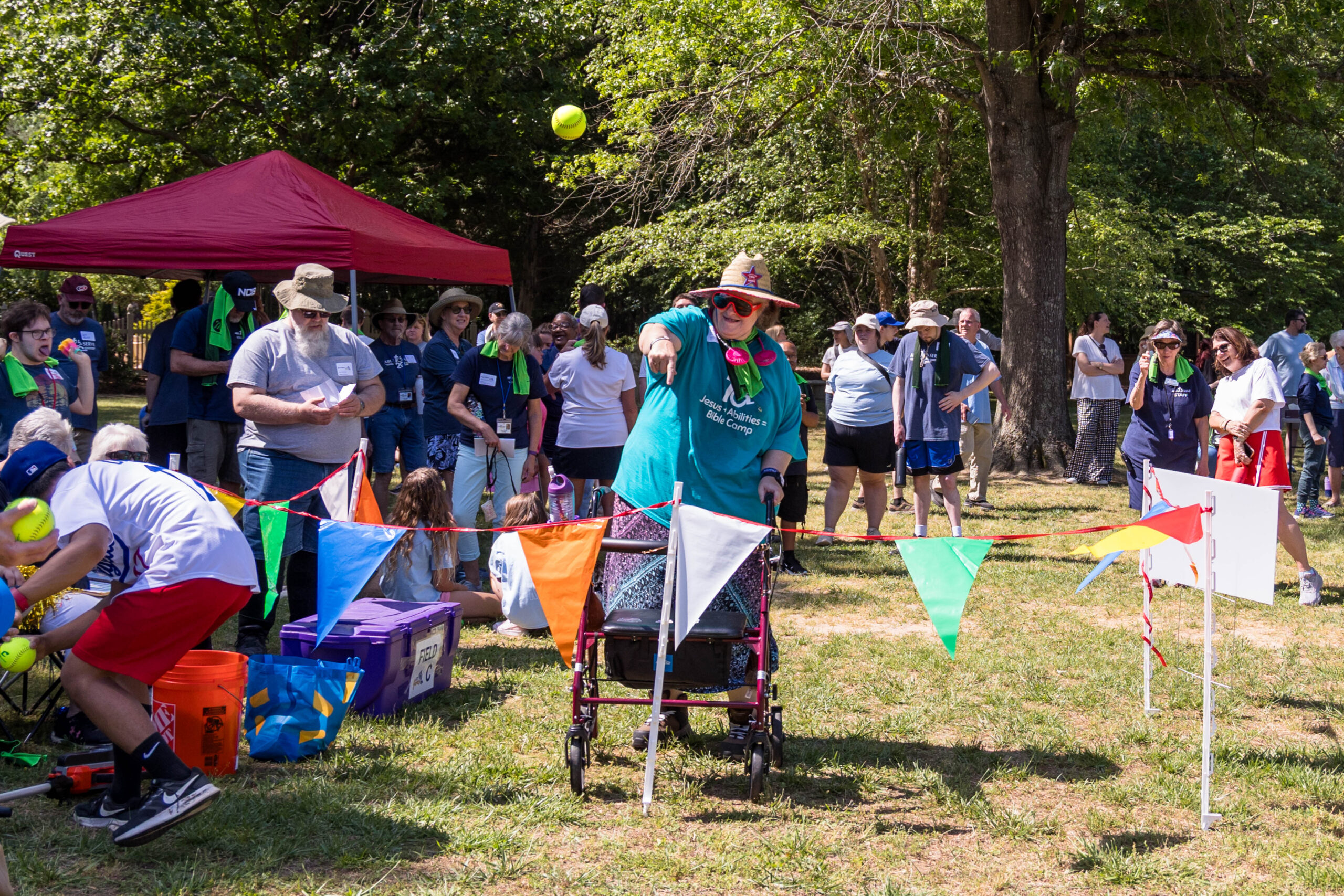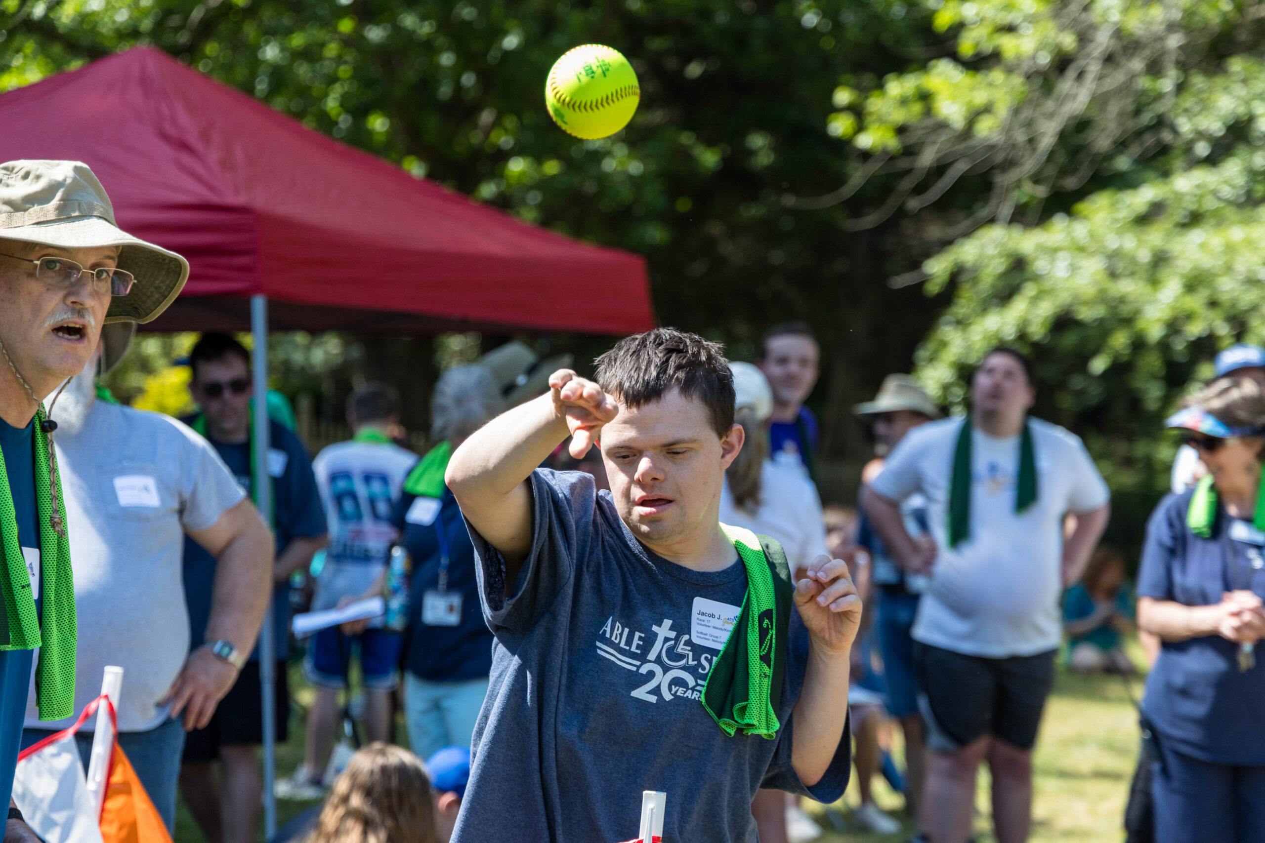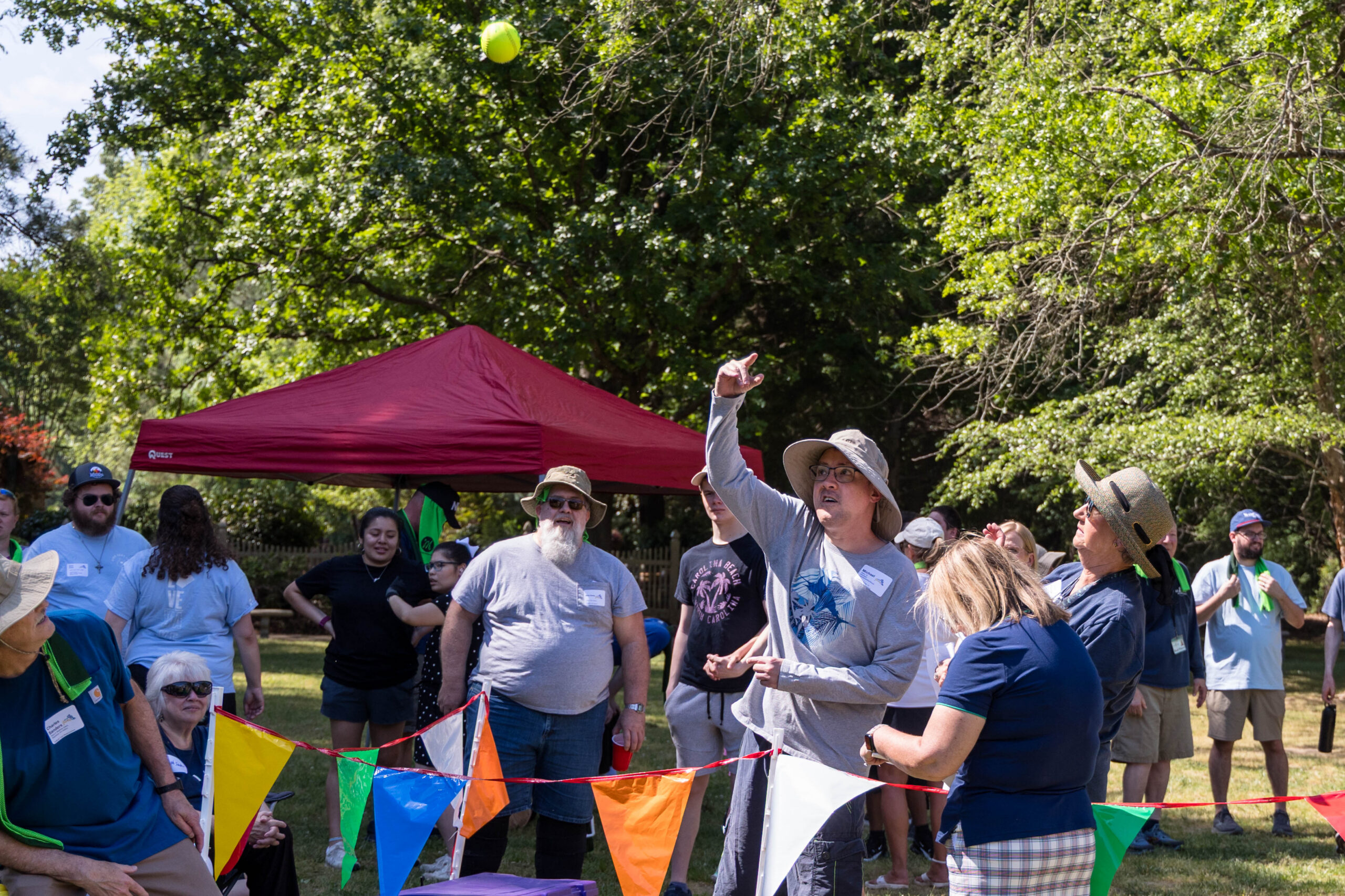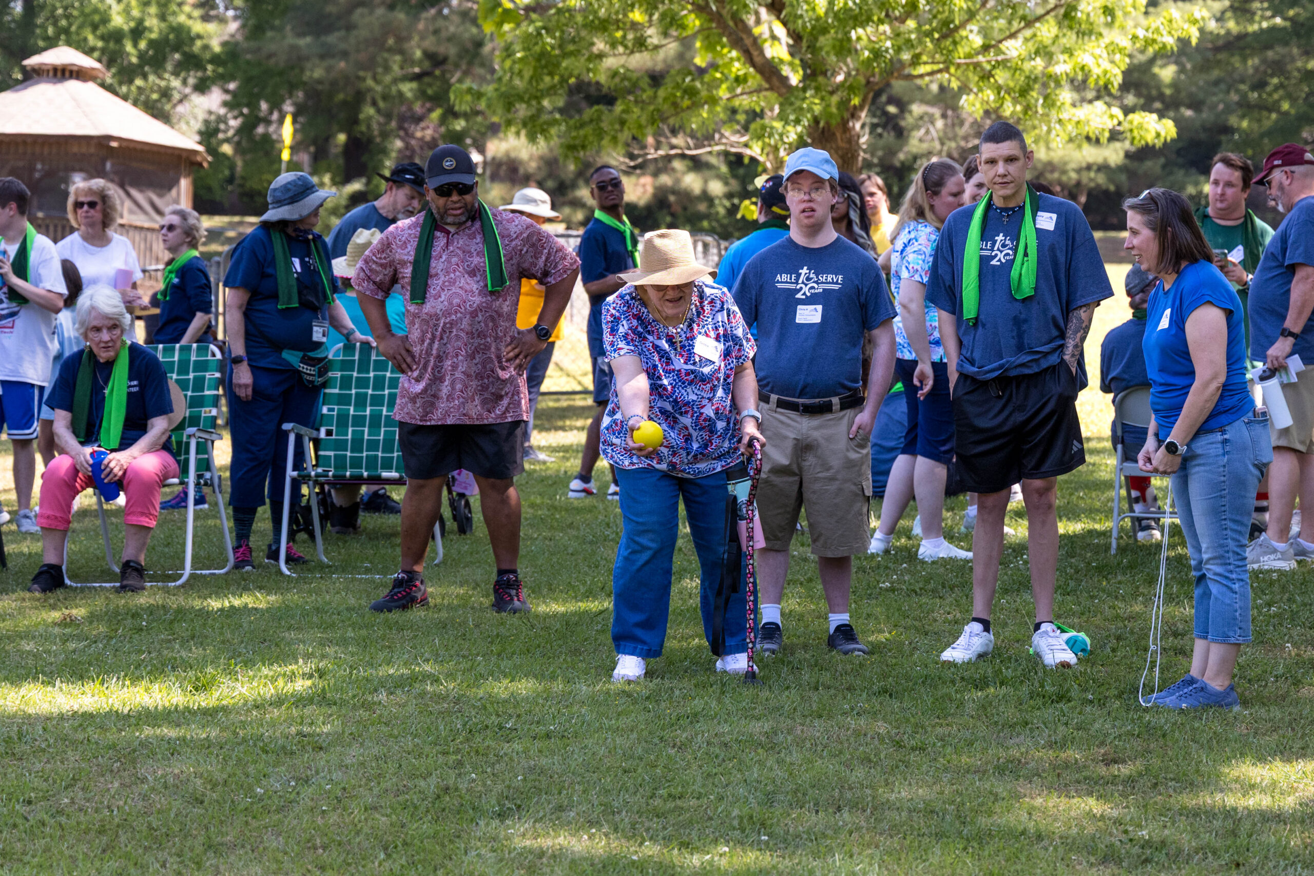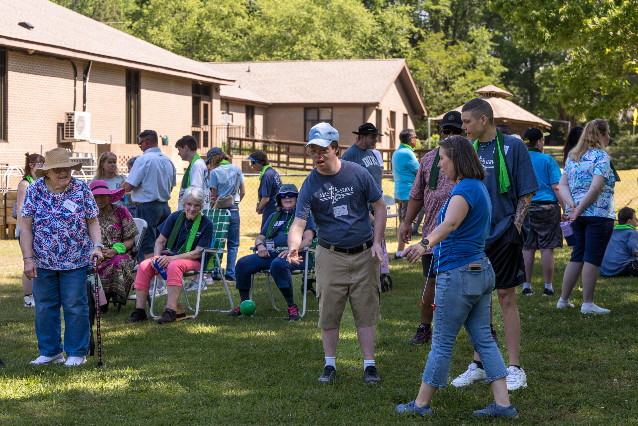 Once the racing games ended, participants moved as a group to the grassy areas for the softball throw and bocce competitions. Both courts were delineated with colorful flag streamers flapping in the wind. Like the races, they were divided into teams of three. For softball, each athlete had three throws; the furthest landing point of the ball was their final score. For bocce, the closest thrown ball to the target was measured.