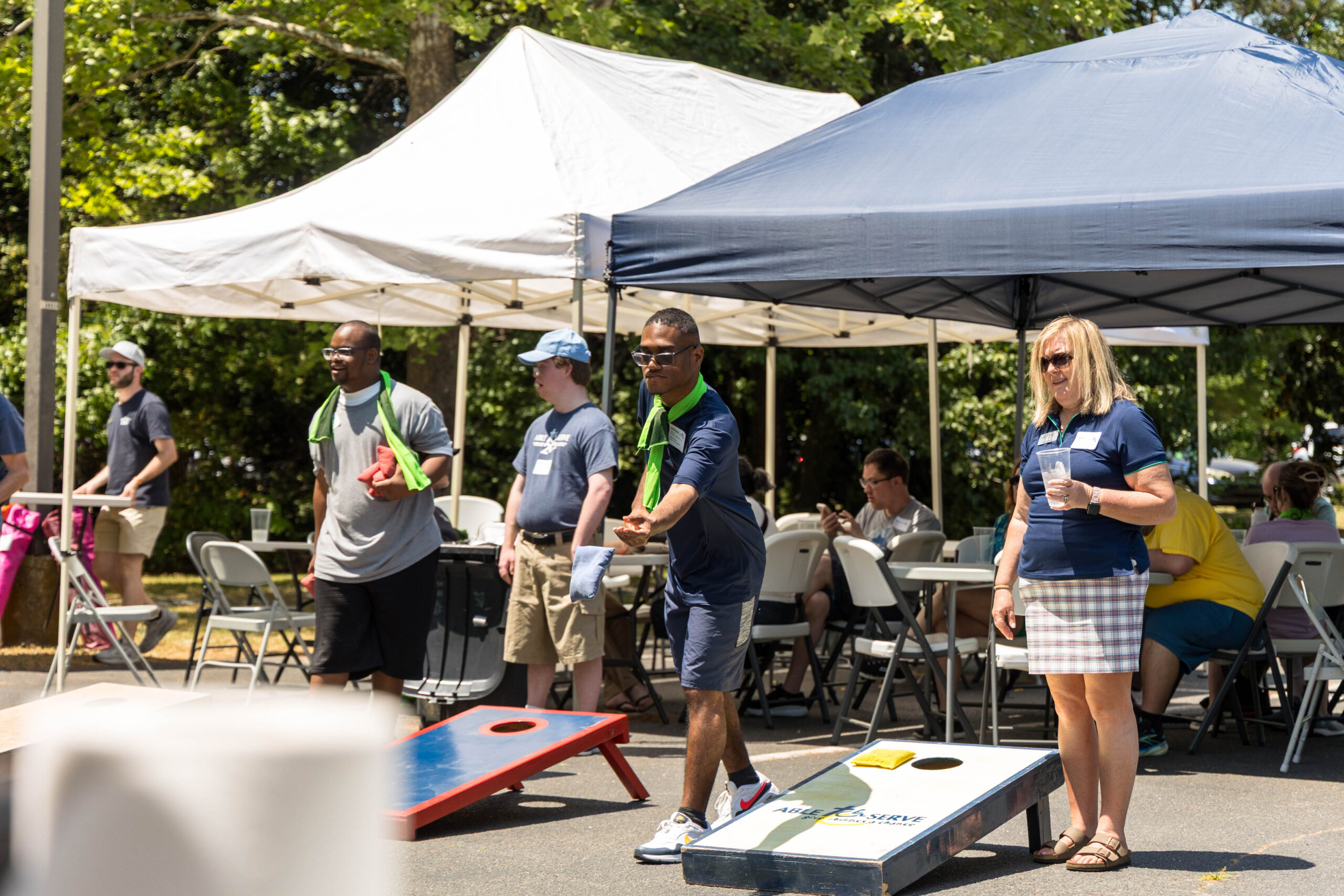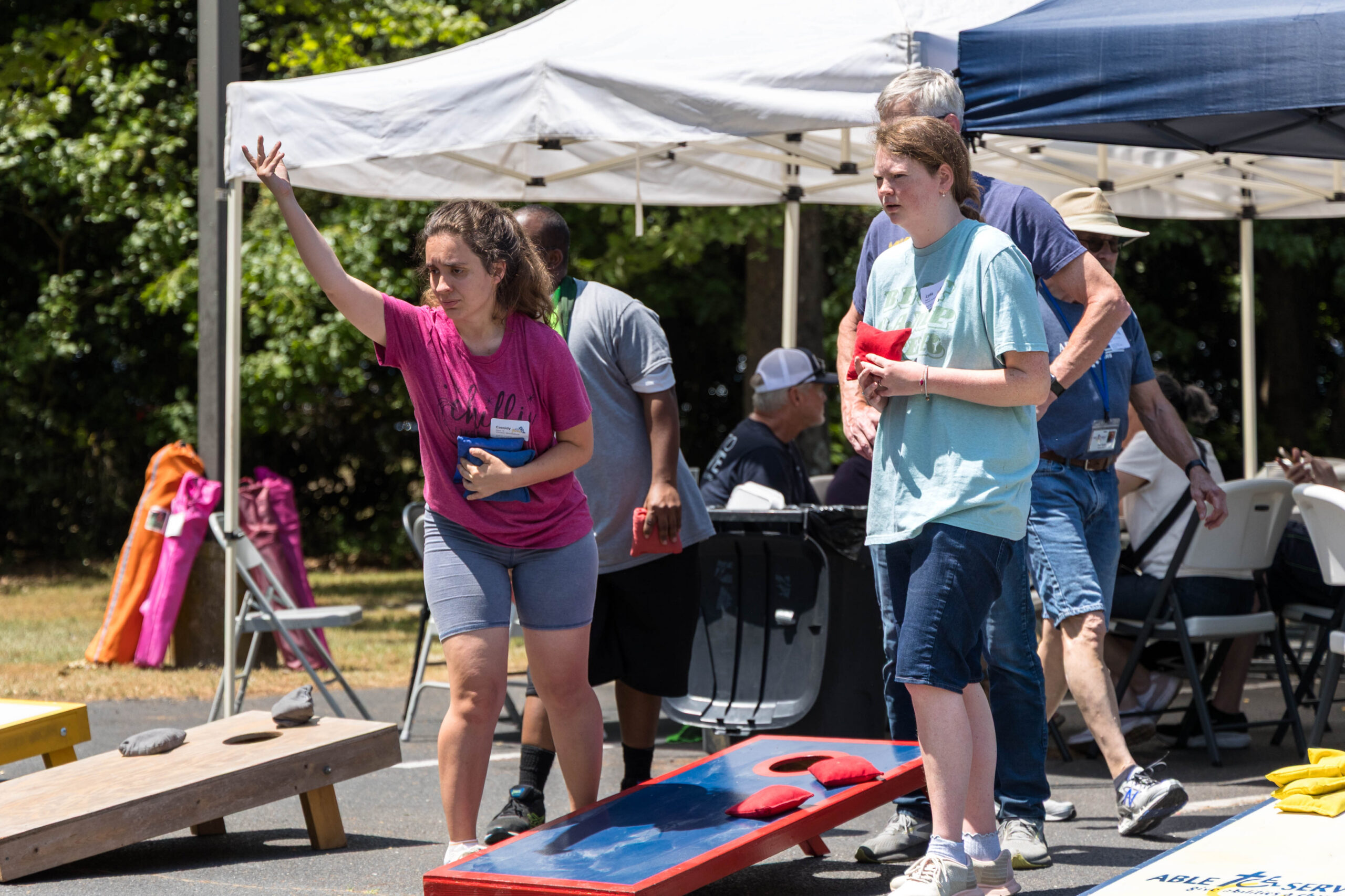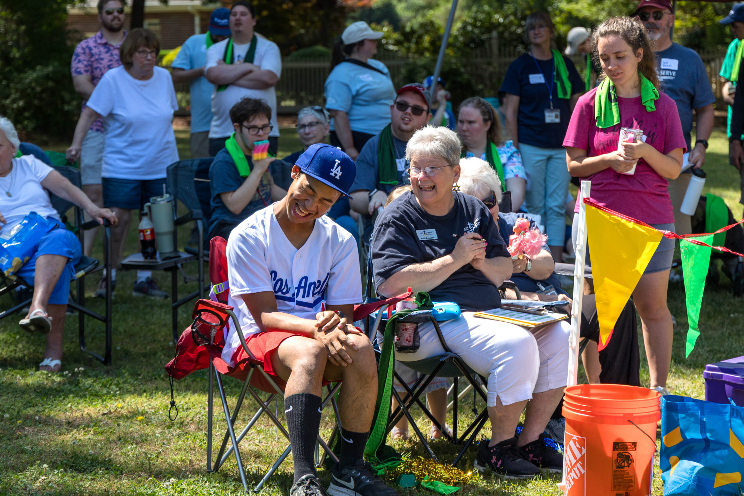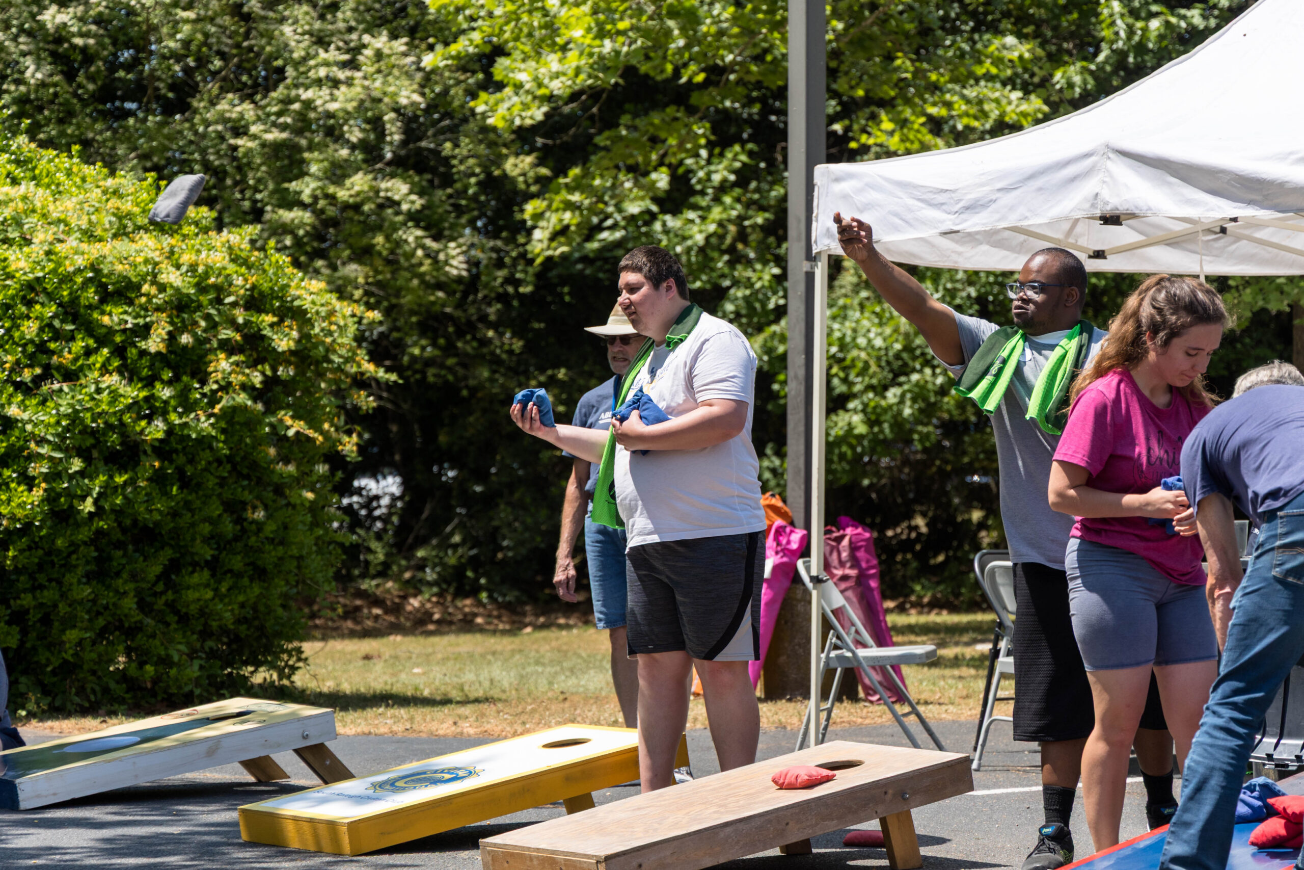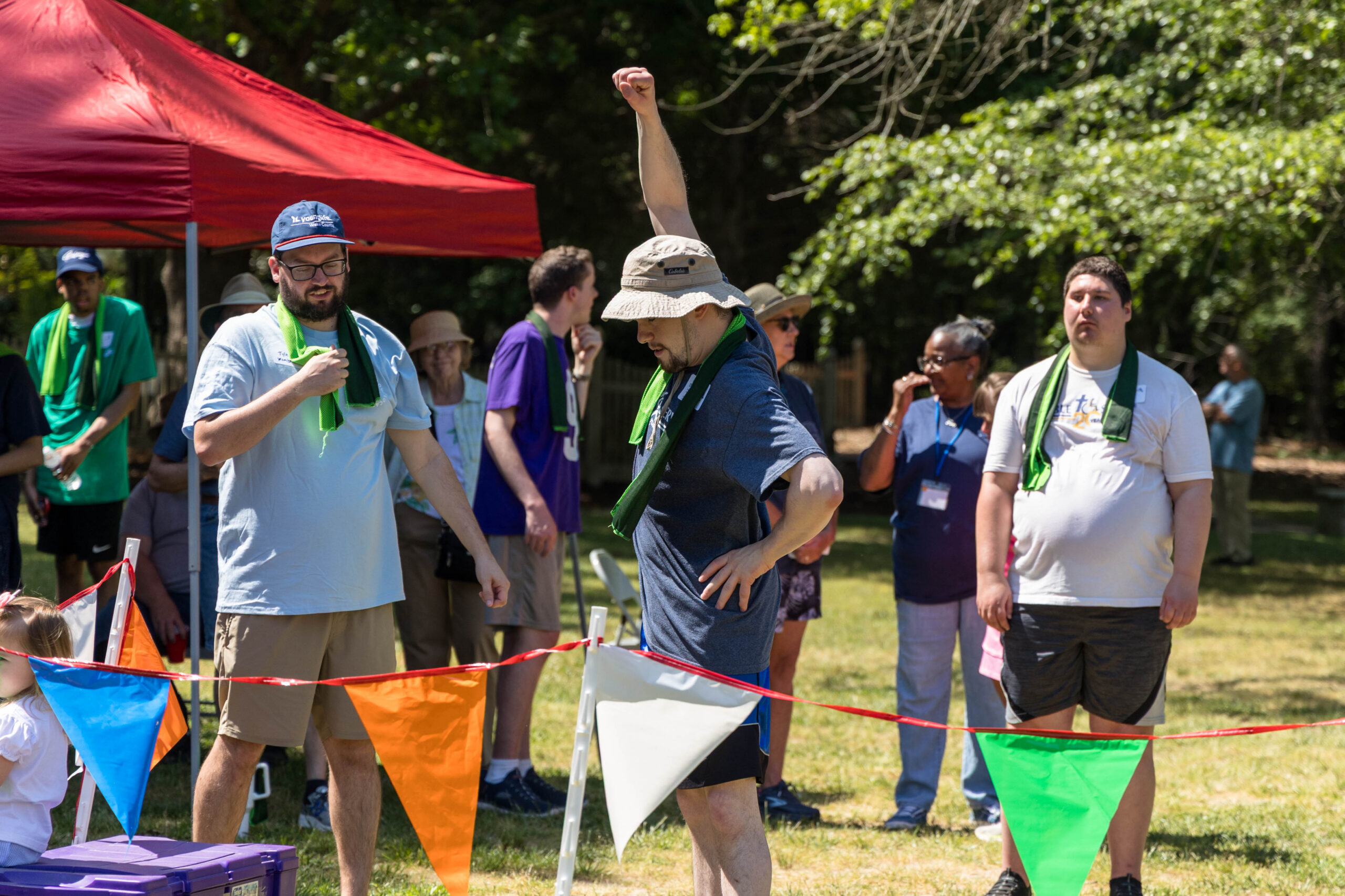 Once the racing games ended, participants moved as a group to the grassy areas for the softball throw and bocce competitions. Both courts were delineated with colorful flag streamers flapping in the wind. Like the races, they were divided into teams of three. For softball, each athlete had three throws; the furthest landing point of the ball was their final score. For bocce, the closest thrown ball to the target was measured.