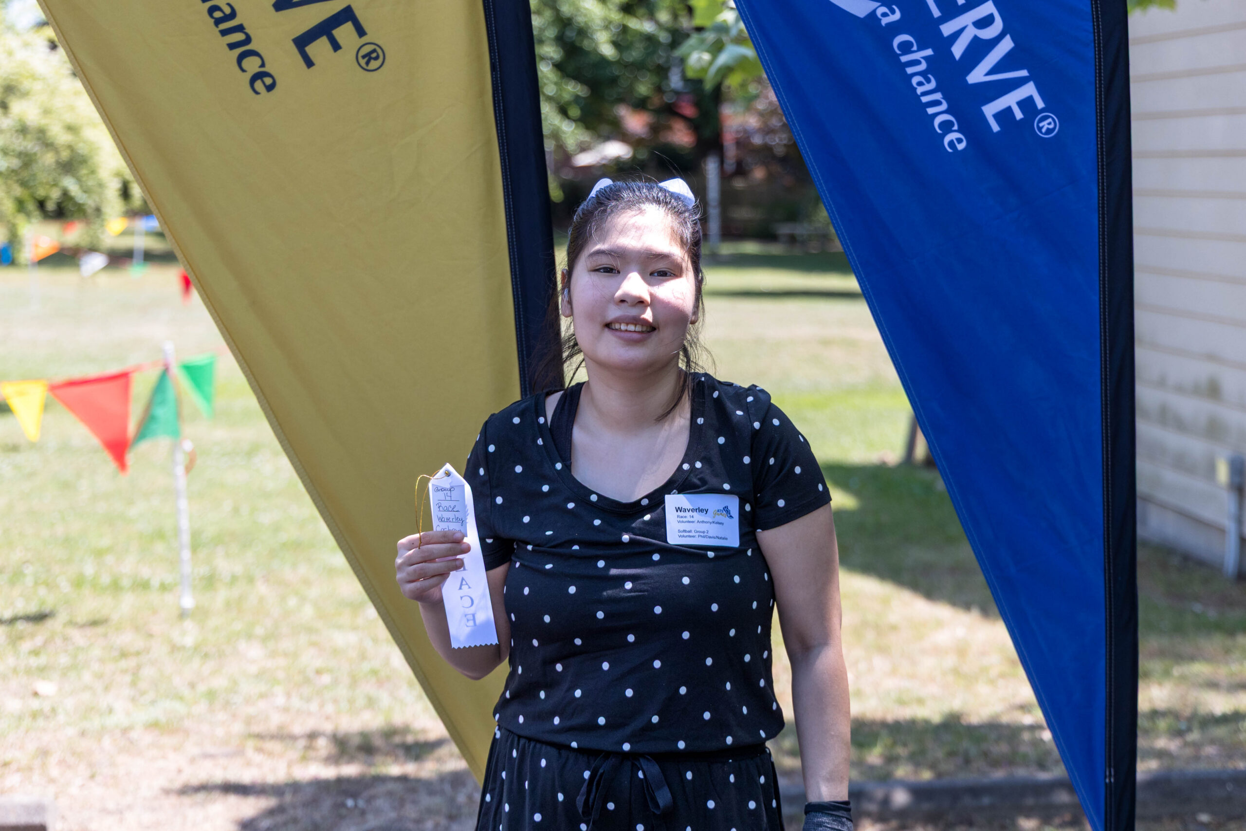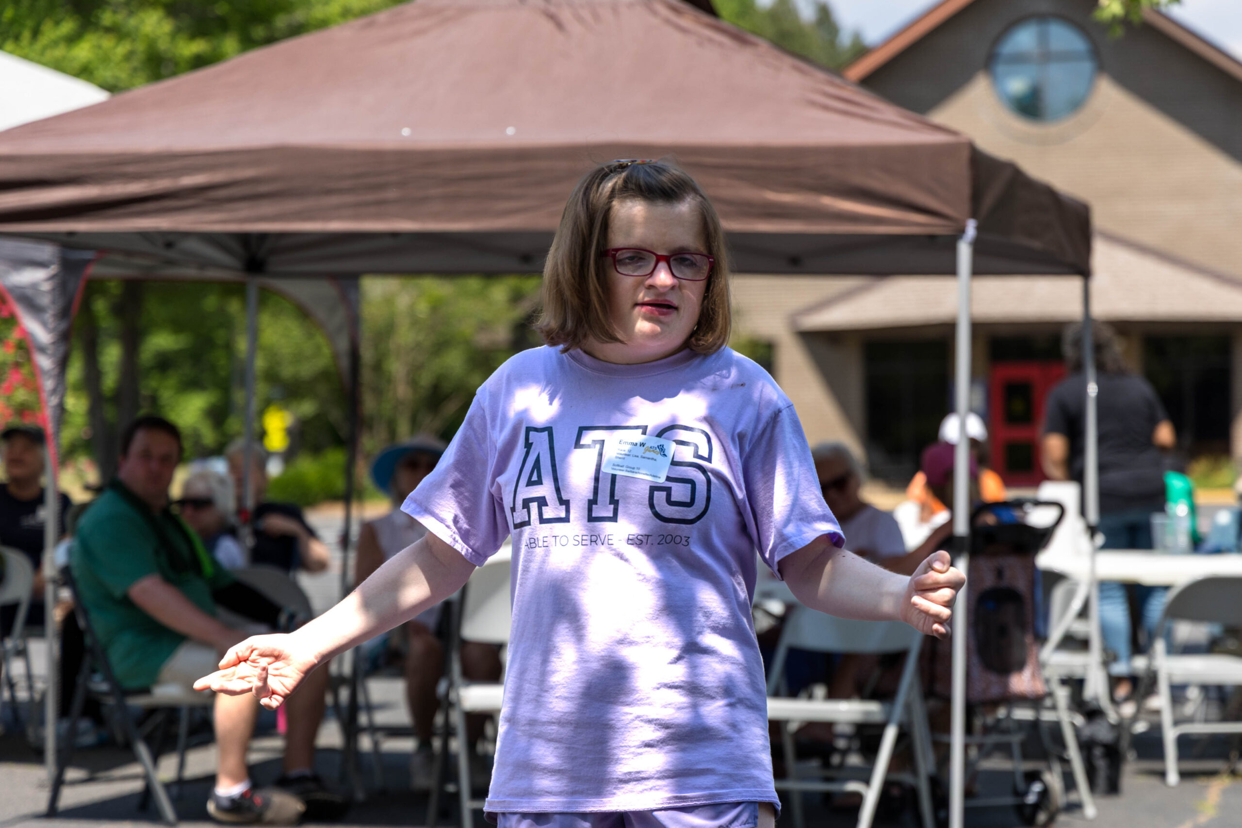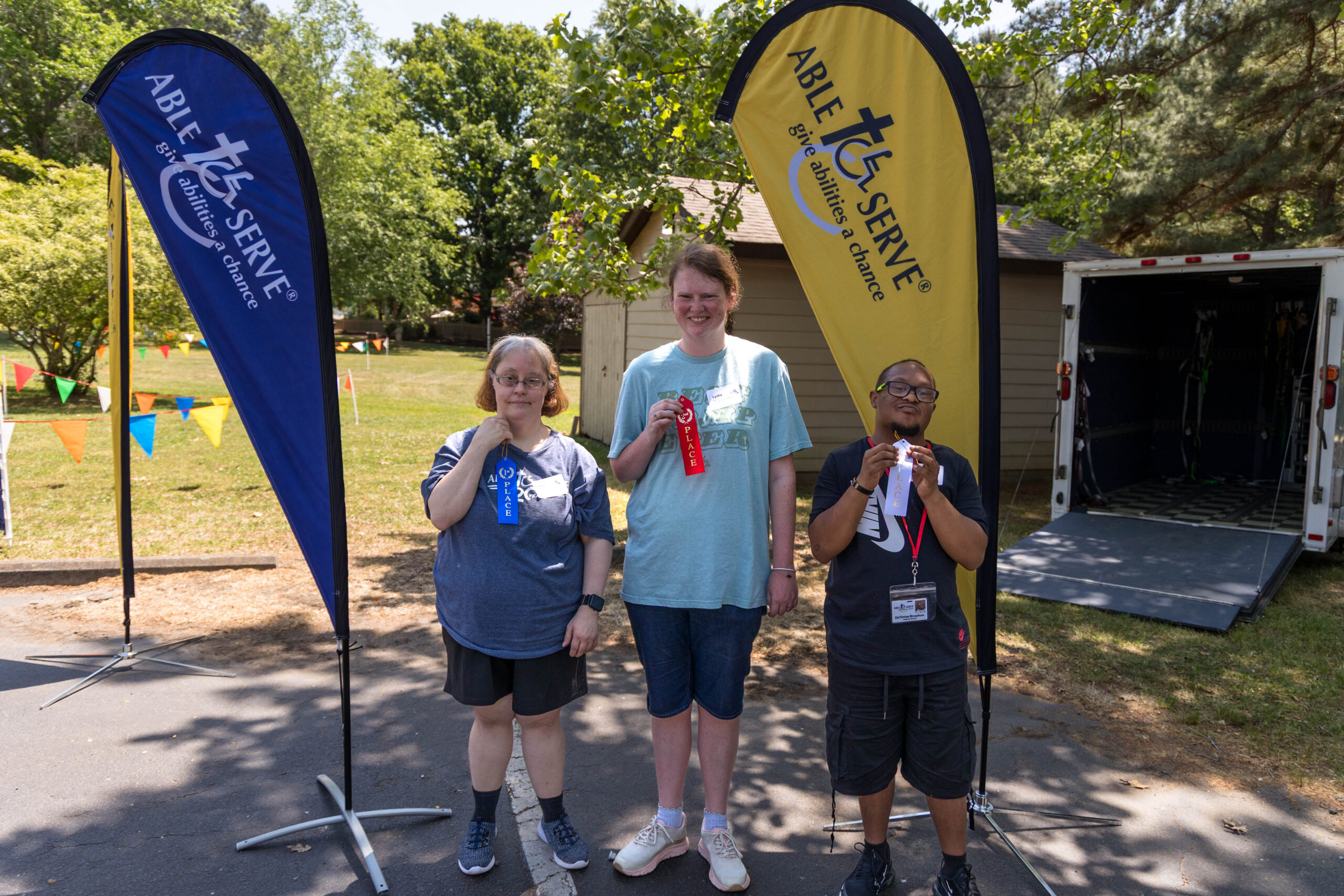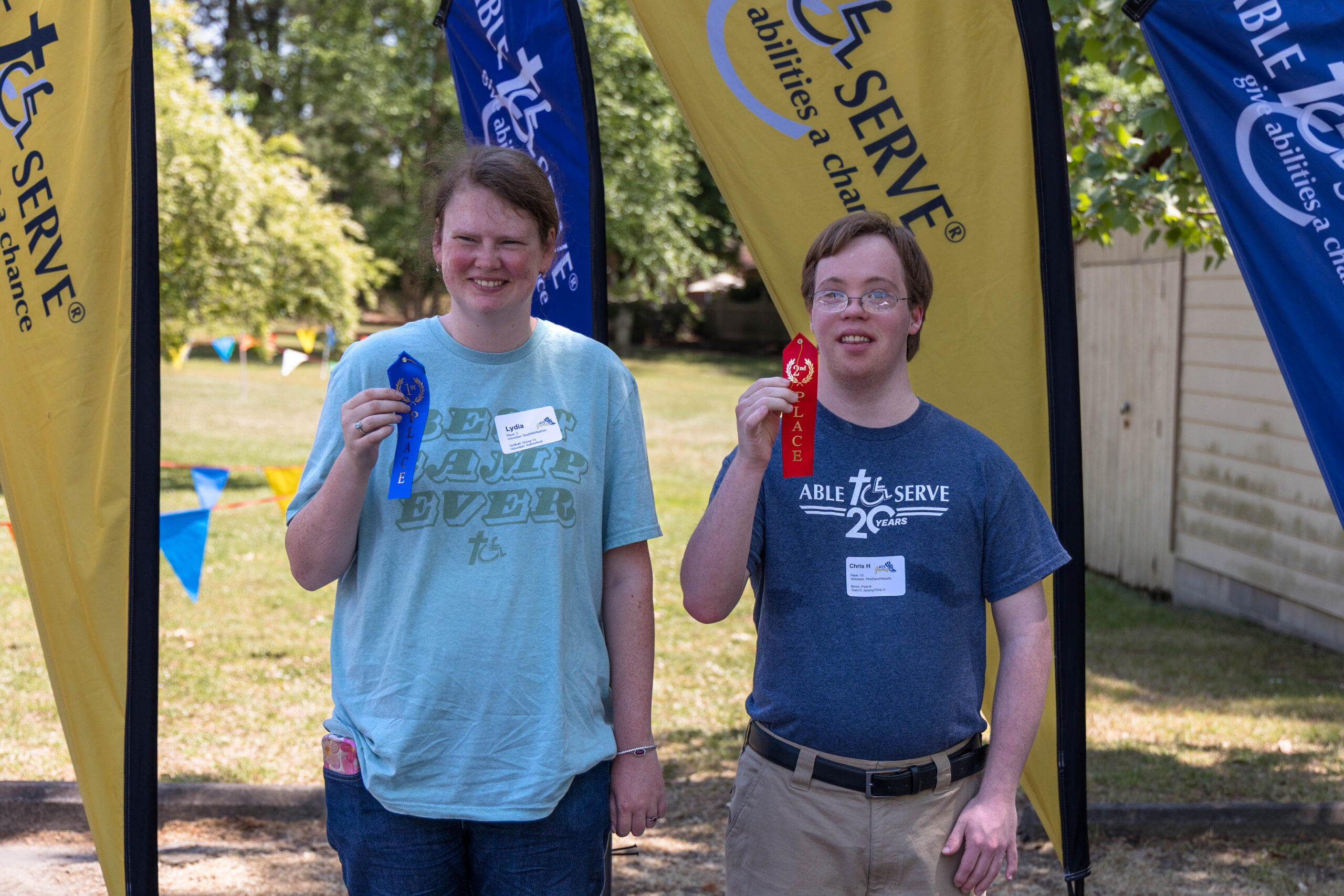 With lunch finished and folks visiting around the tables, it was time for the awards ceremony. Rachel announced each participant’s name and event. Staff handed out awards as the participants came up to claim them. All received a first, second, or third-place ribbon. Participant Mason marched around the area proudly displaying his two ribbons. Emma raised her arms in victory as she showed off her ribbons. Camille admitted that she had never won a ribbon and was overwhelmed with her two hard-earned wins.