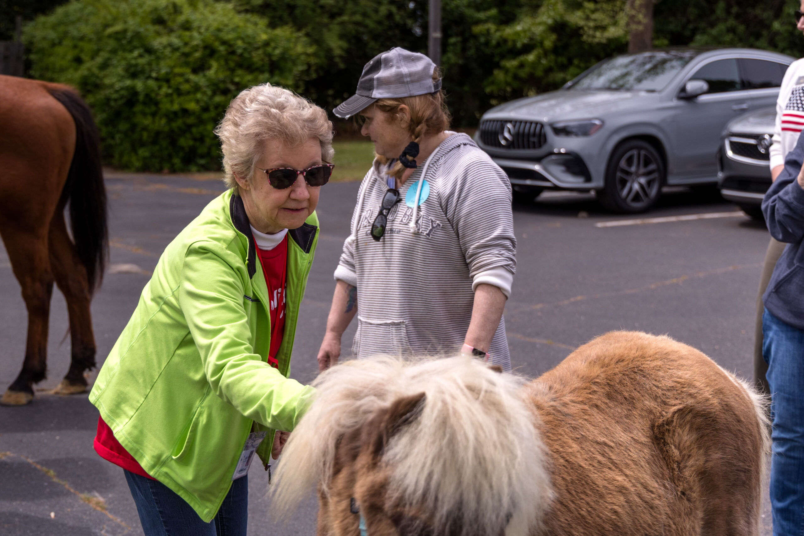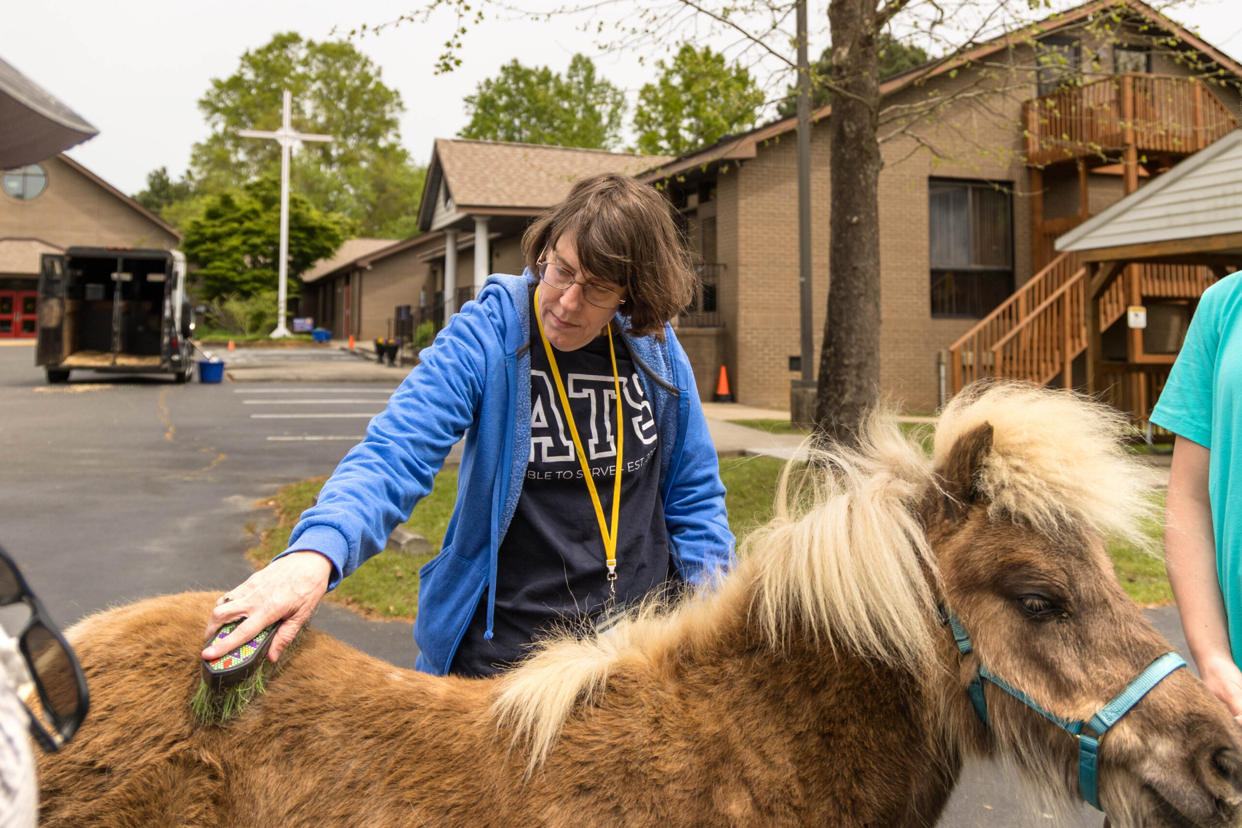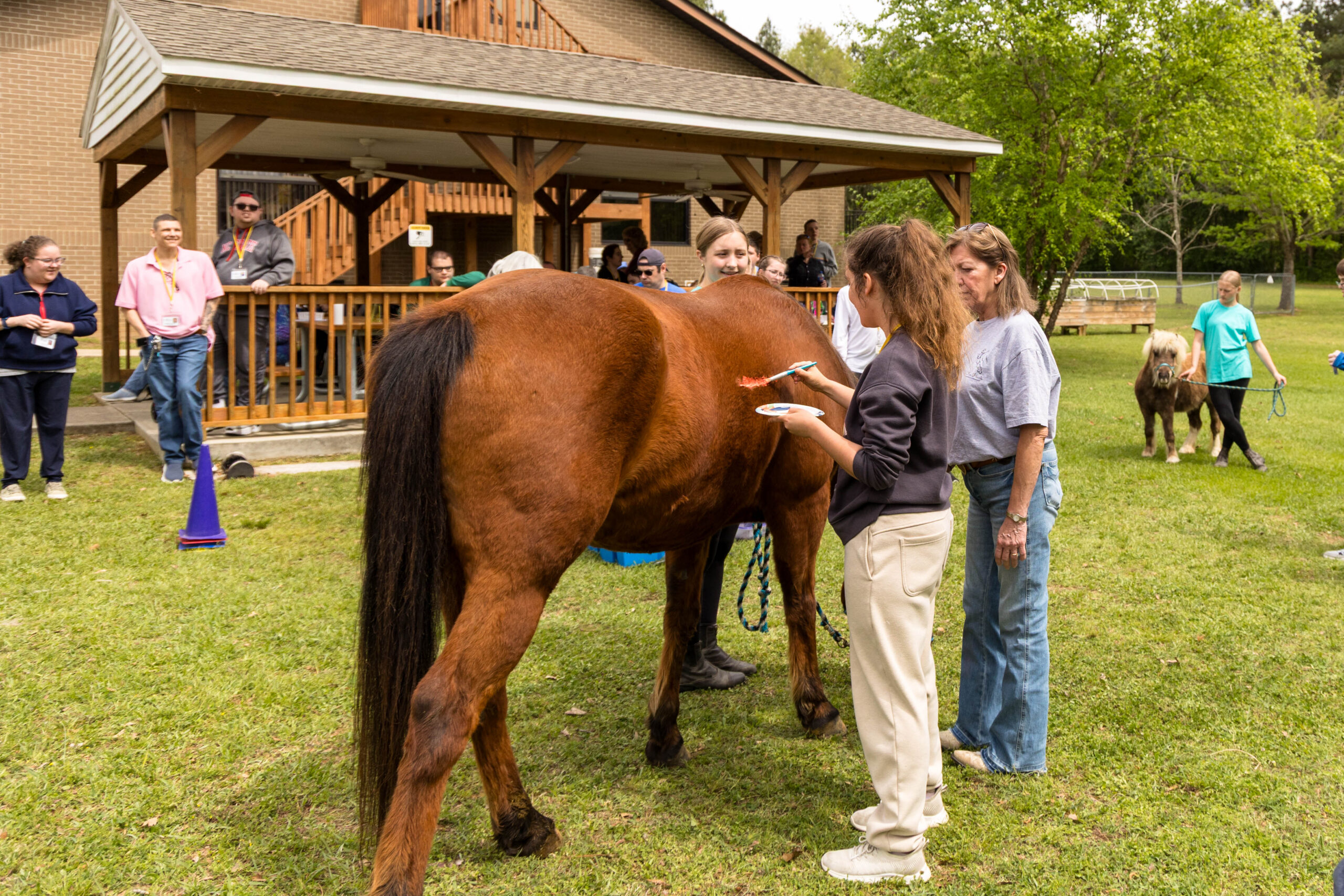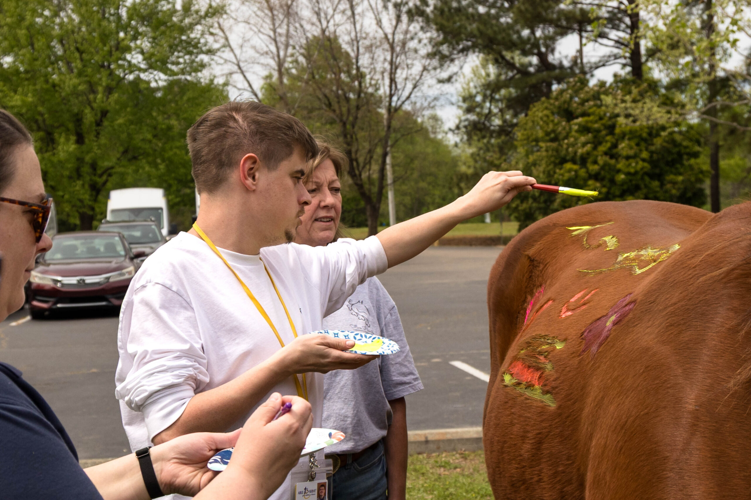 Whoever knew you could paint on a horse? Folks at Able to Serve (ATS) did just that when Five Hearts Therapeutic Horsemanship visited the campus with two patient horses: Bourbon, a tall reddish-brown animal, and Ferdinand, a light brown and white miniature horse.