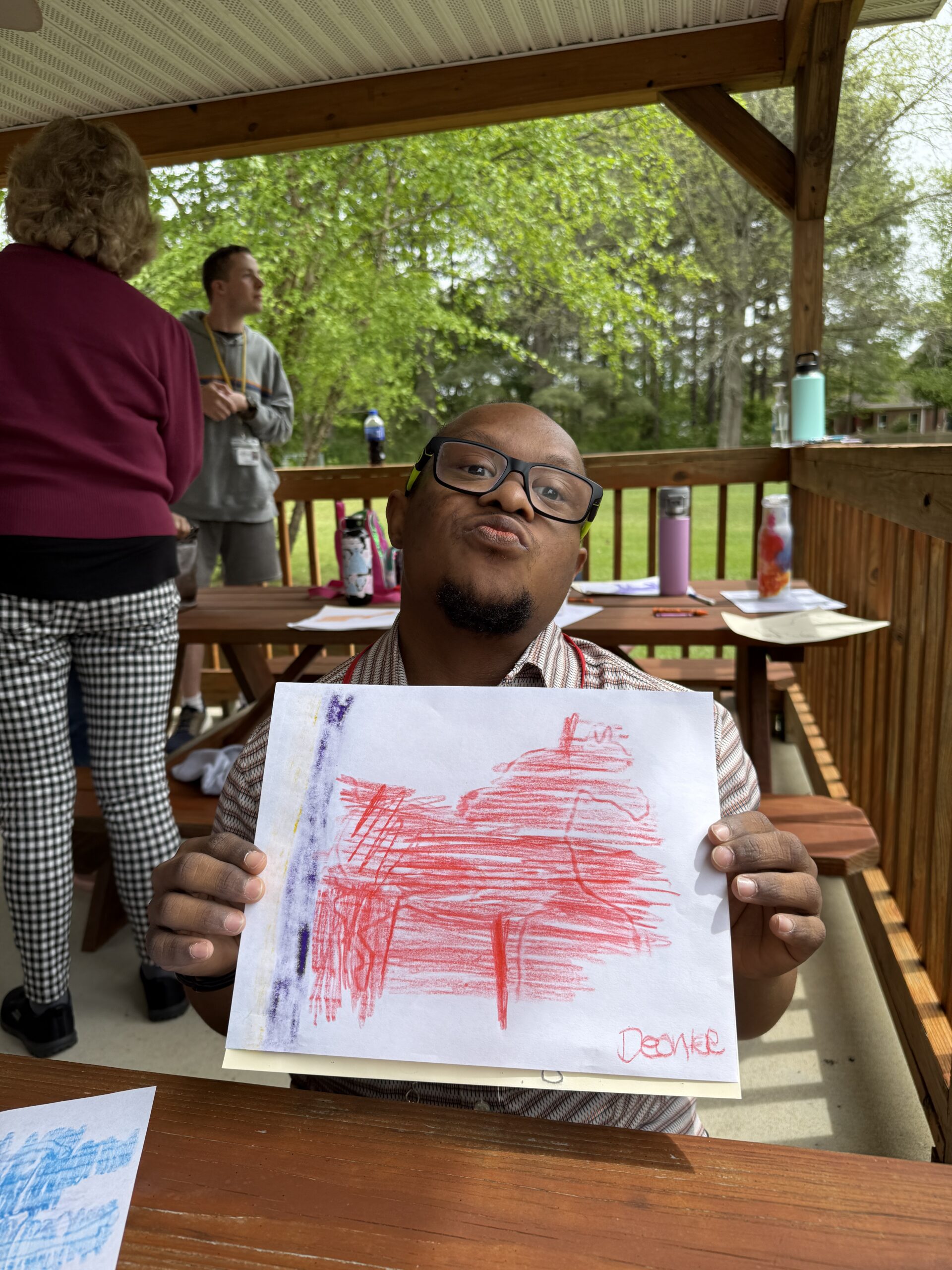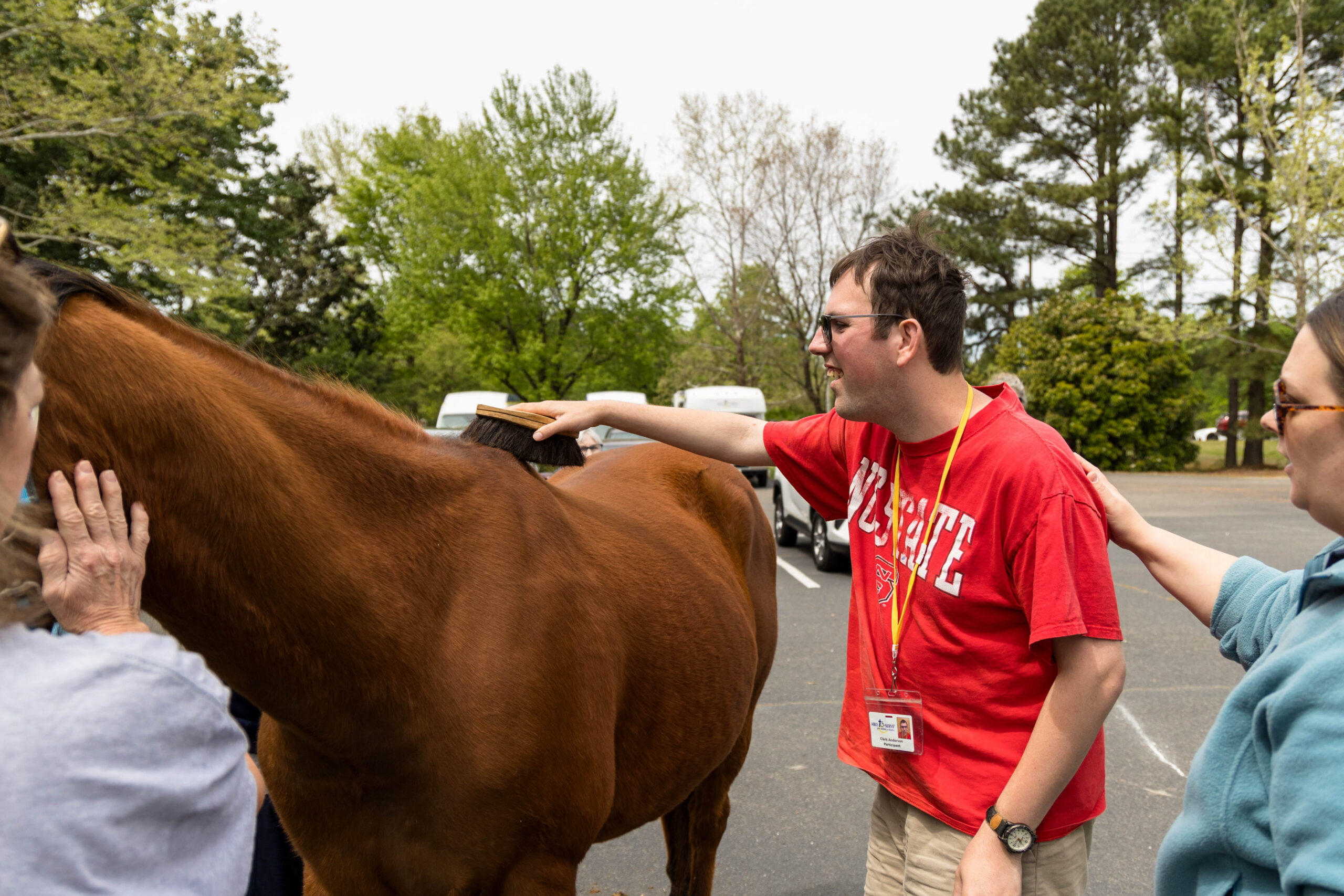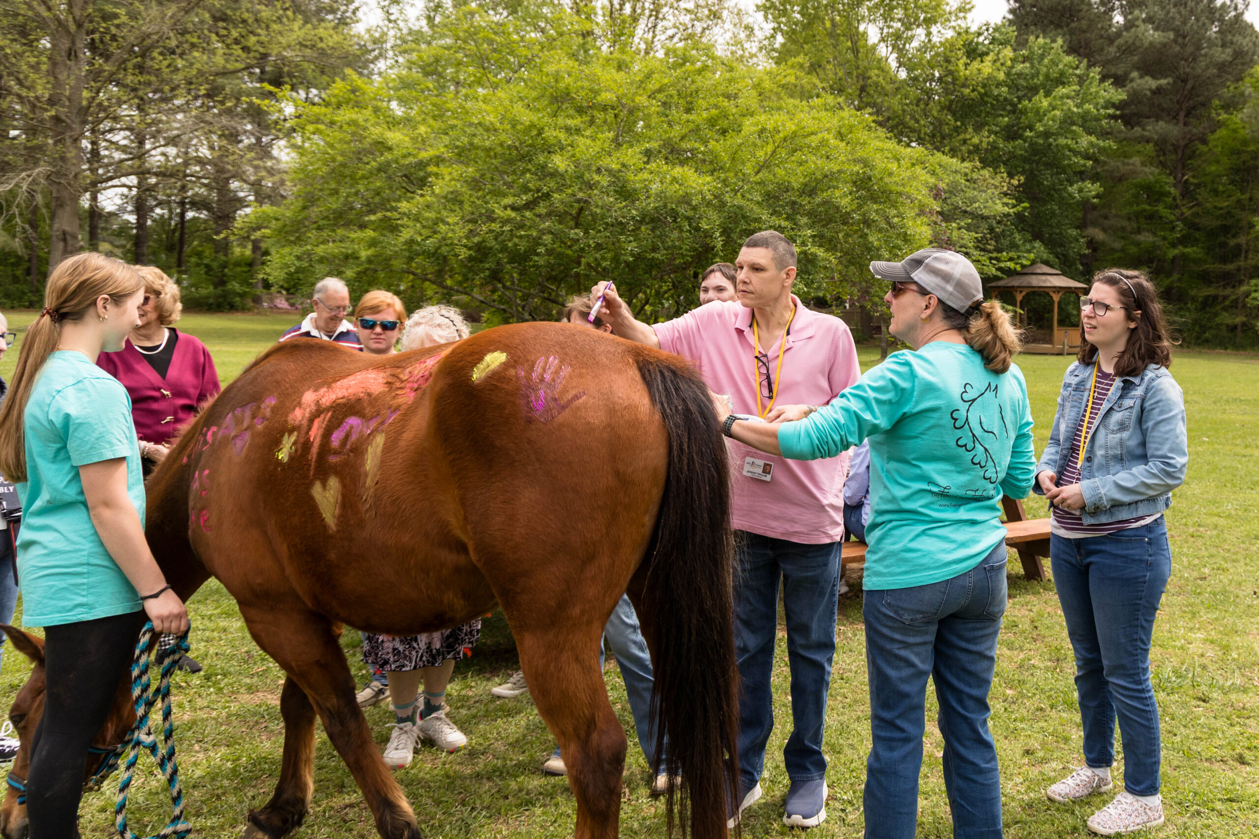 The grand finale occurred when the opportunity to paint on the horse was announced. Using washable fluorescent colors, everyone who desired could paint on Bourbon as he nibbled on grass. The big animal was patient as participants, staff, and volunteers decorated him with various colors, shapes, and patterns. Chris, an ATS instructor, painted “Chris was here” on Bourbon’s side. Participant Abianne shared that painting a horse was now crossed off her bucket list. “This is awesome! Best day ever,” declared Emma.