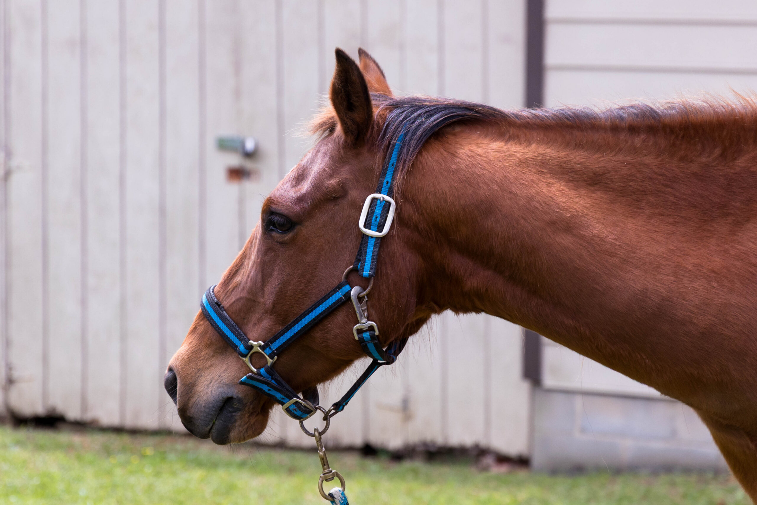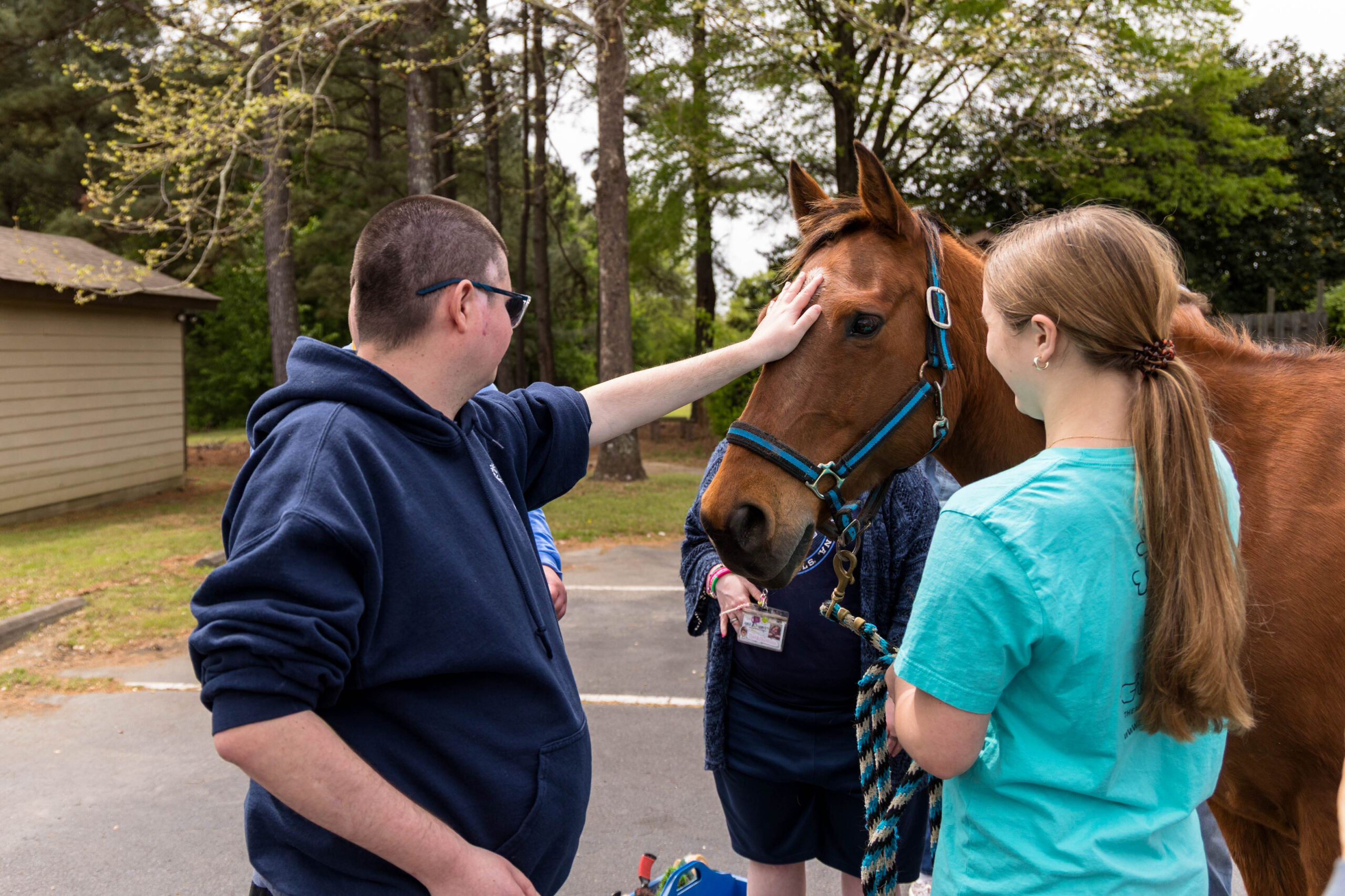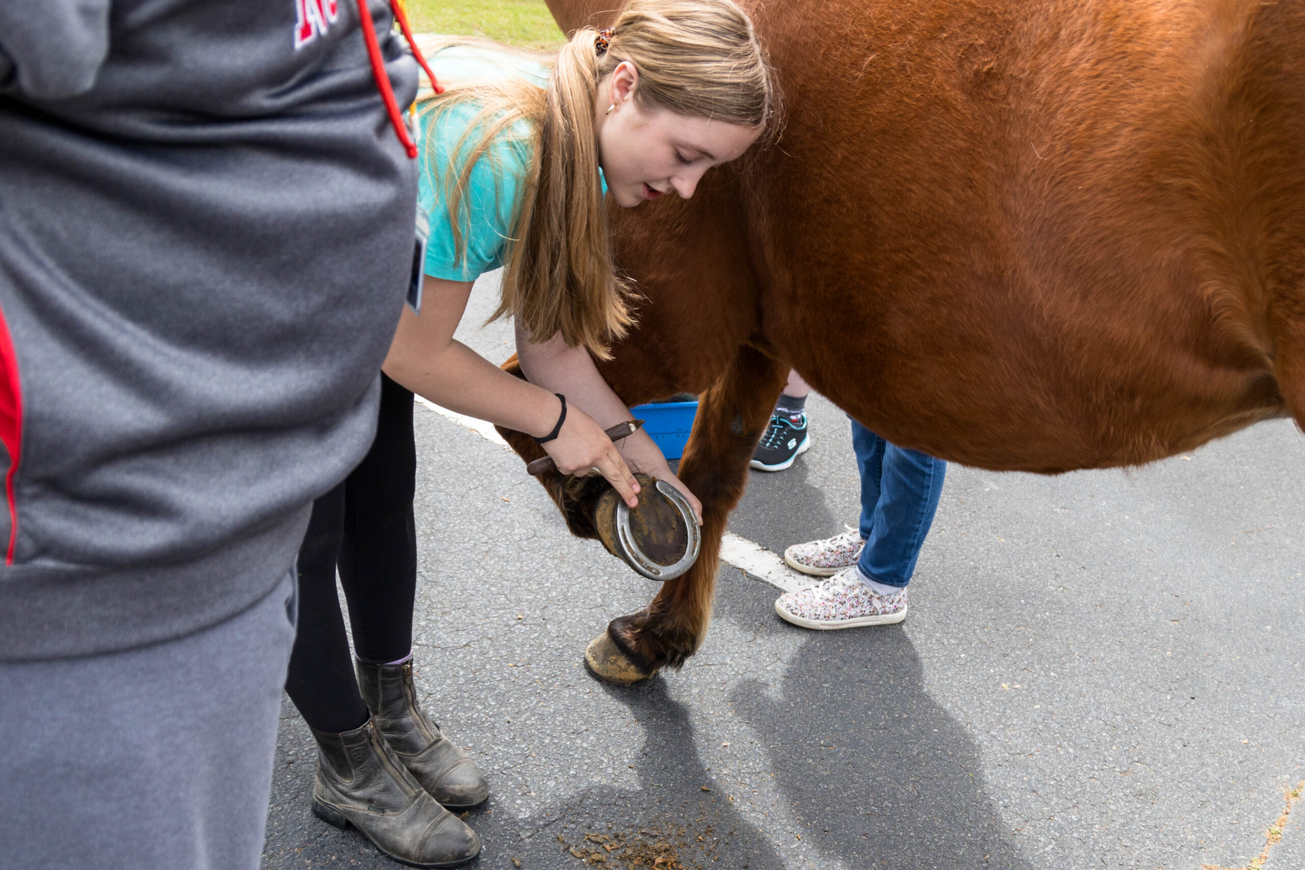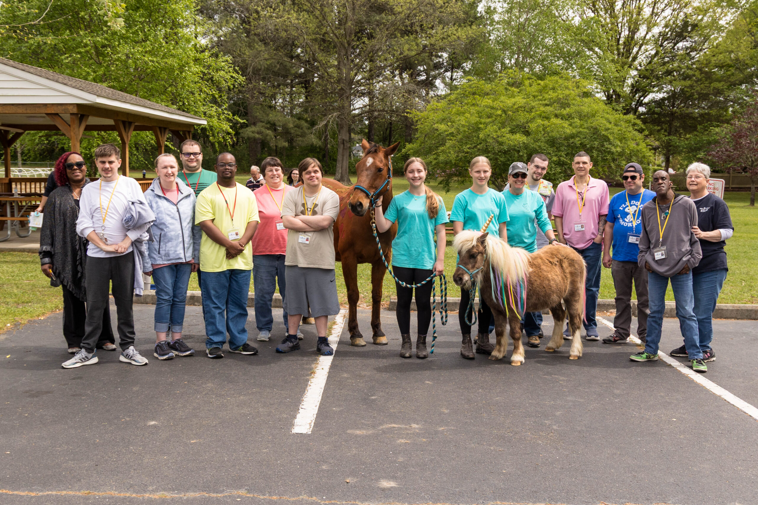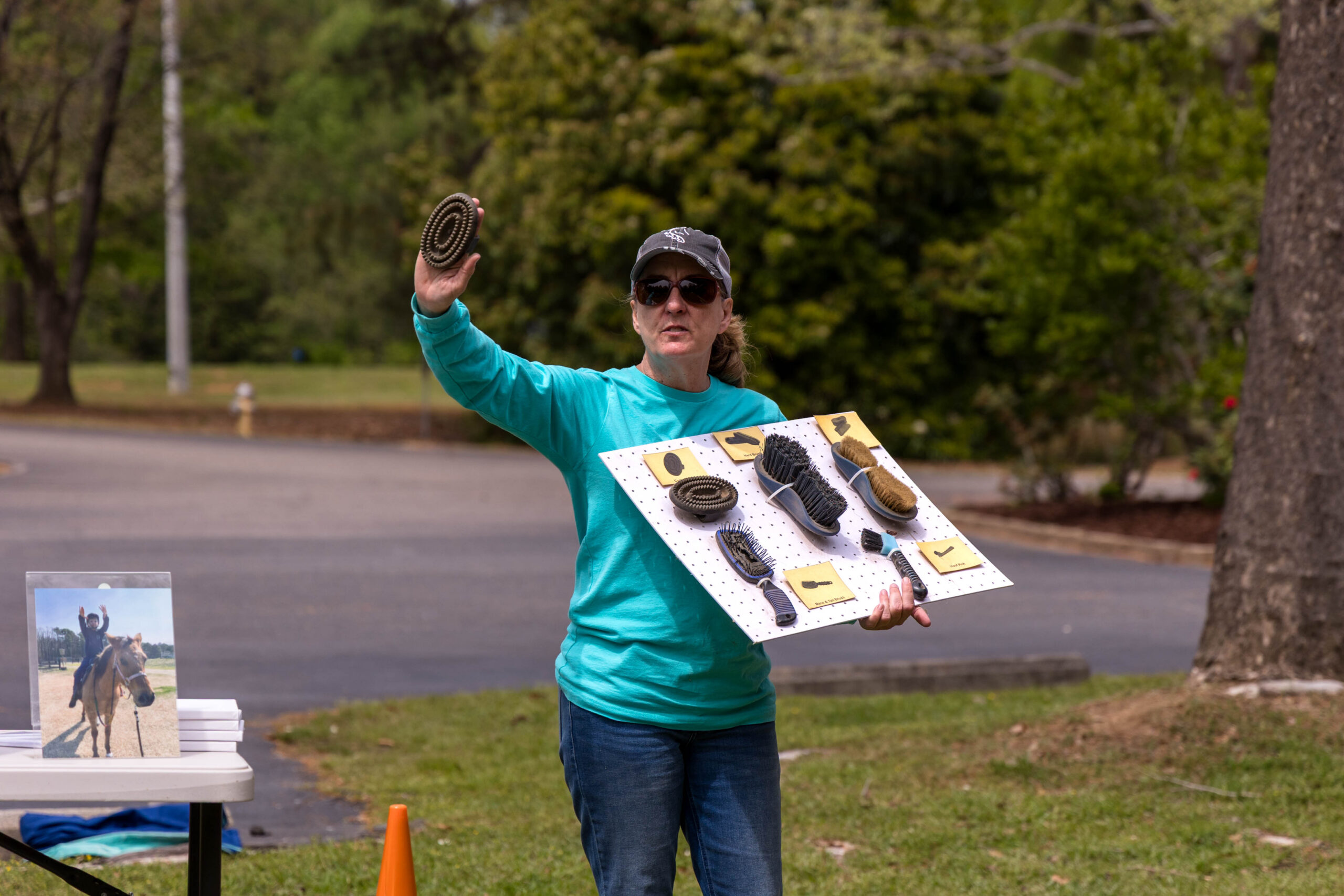 Founder and Executive Director Dana Cooke, along with several volunteers clad in jeans and turquoise T-shirts, spent over two hours on Tuesday afternoon showing and assisting participants in the care and safety of horses. While everyone watched from the covered picnic shelter and picnic bench, the two animals munched on the grass.