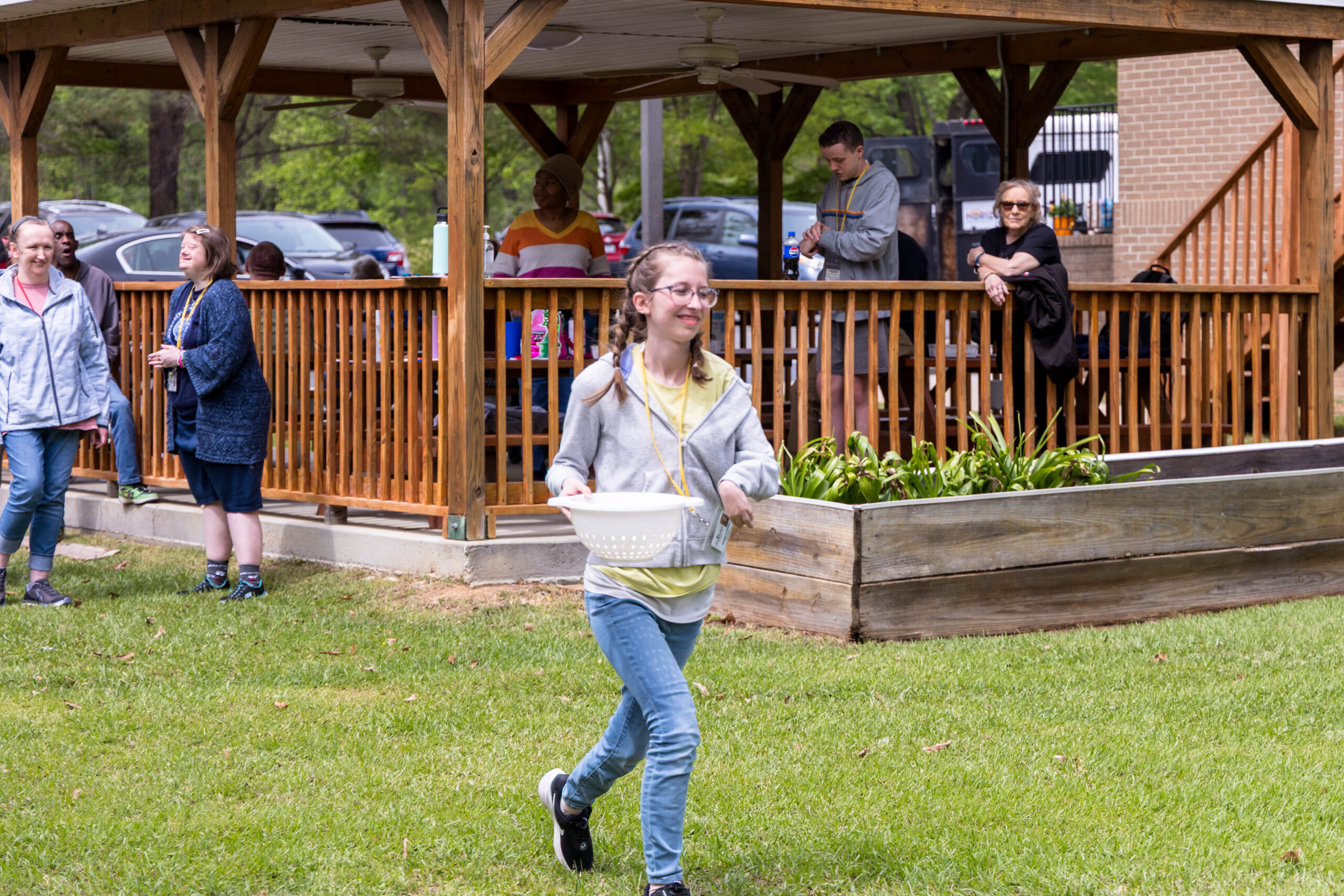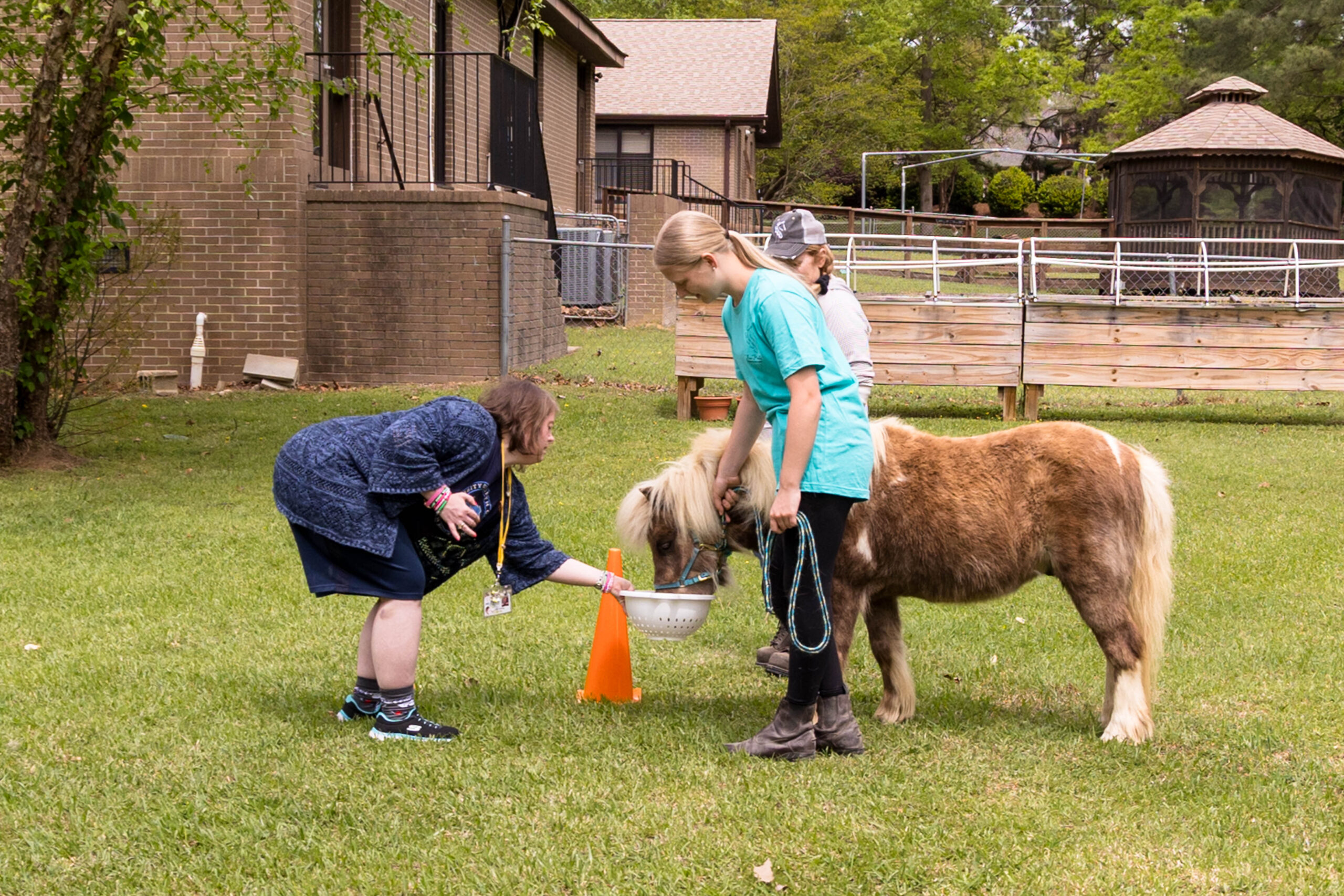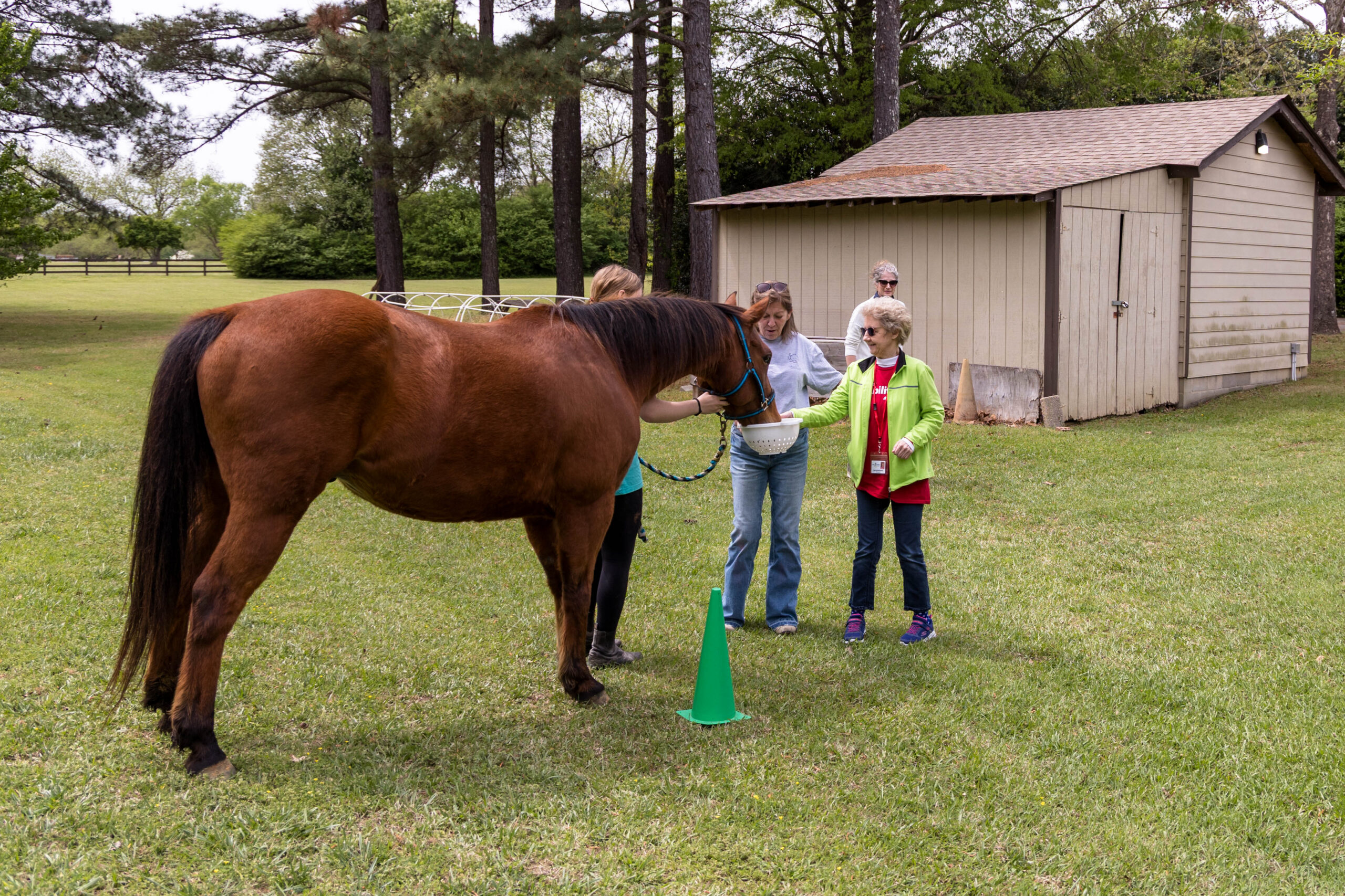 Participants were divided into two teams for a relay race to feed the horses. Given white colanders with a single clump of horse treat, the individual walked or ran a few yards to Bourbon on one side and to Ferdinand on the other side. When they returned, the container was passed to the next person in line.