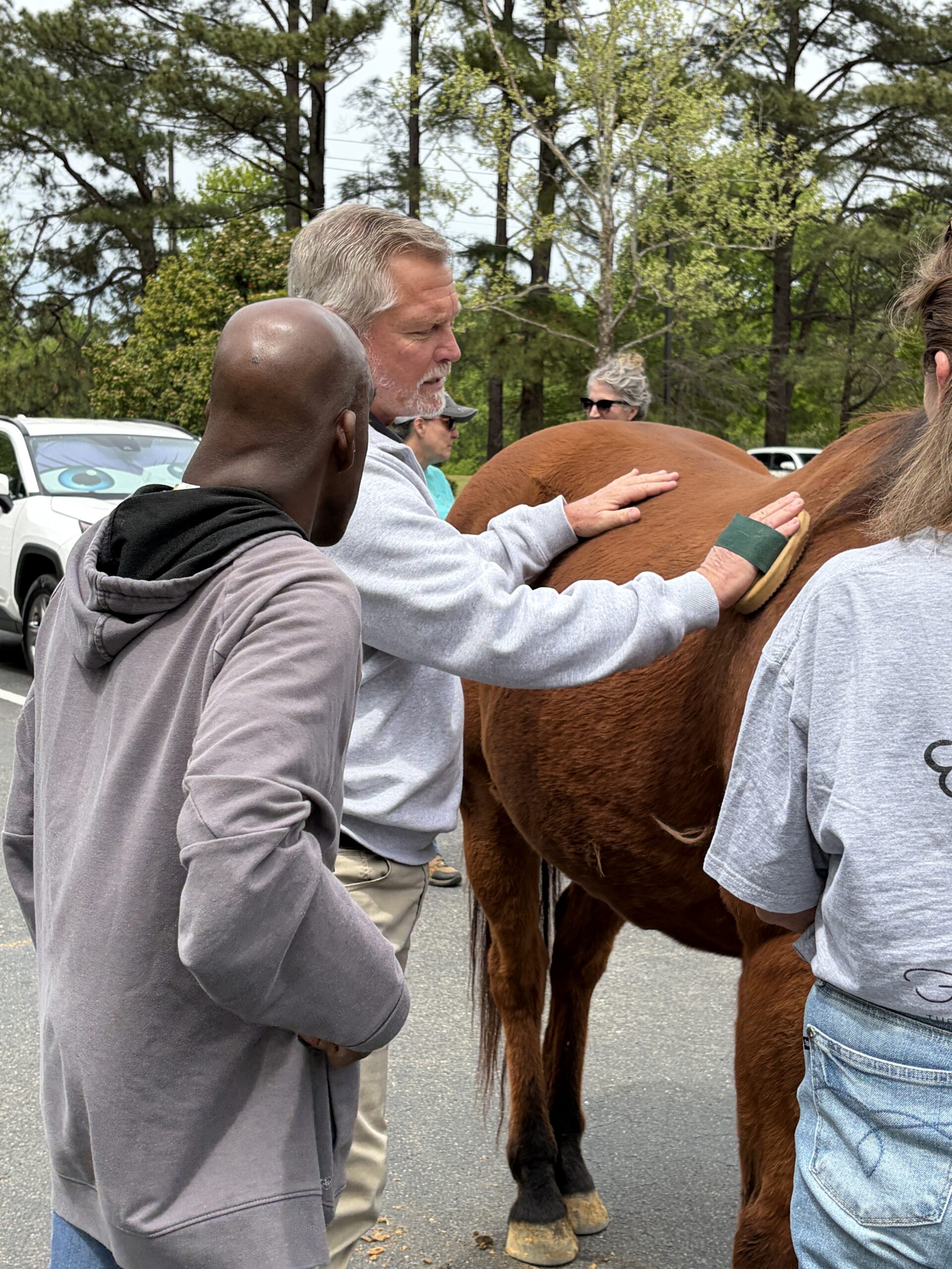 Walking the animals onto the pavement, Dana demonstrated how to properly brush the horse’s coat. Eager — and apprehensive participants received assistance in brushing the animal in a circular pattern. As they brushed, clumps of hair fell to the ground, rolling off like tumbleweeds in the pleasant breeze.